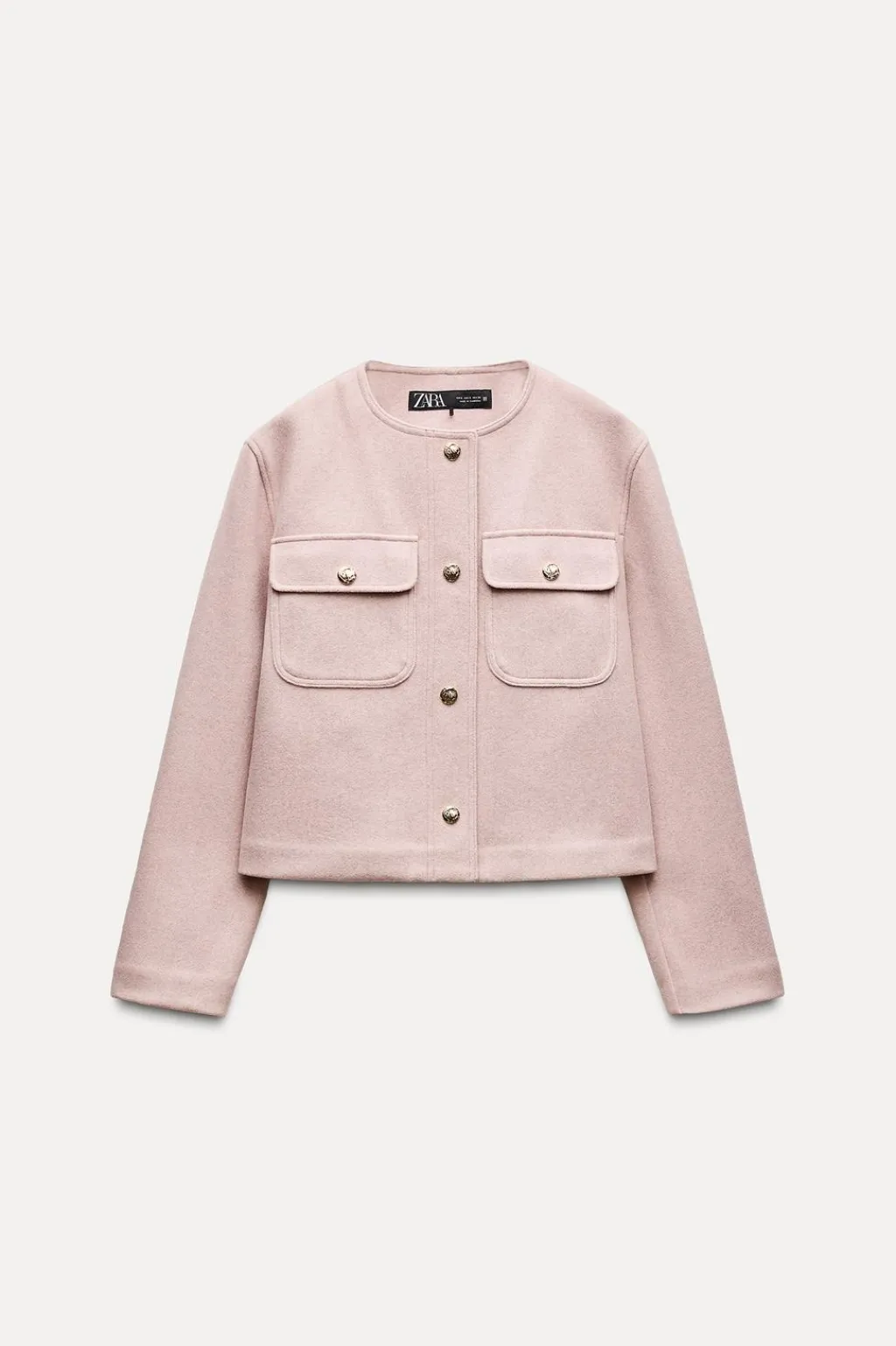 Cazadora de cuello redondo y manga larga. Bolsillos de plastrón en delantero. Cierre frontal con botones a presión.