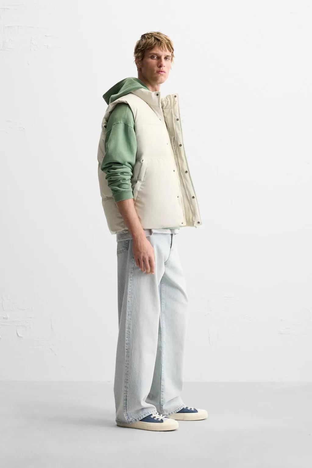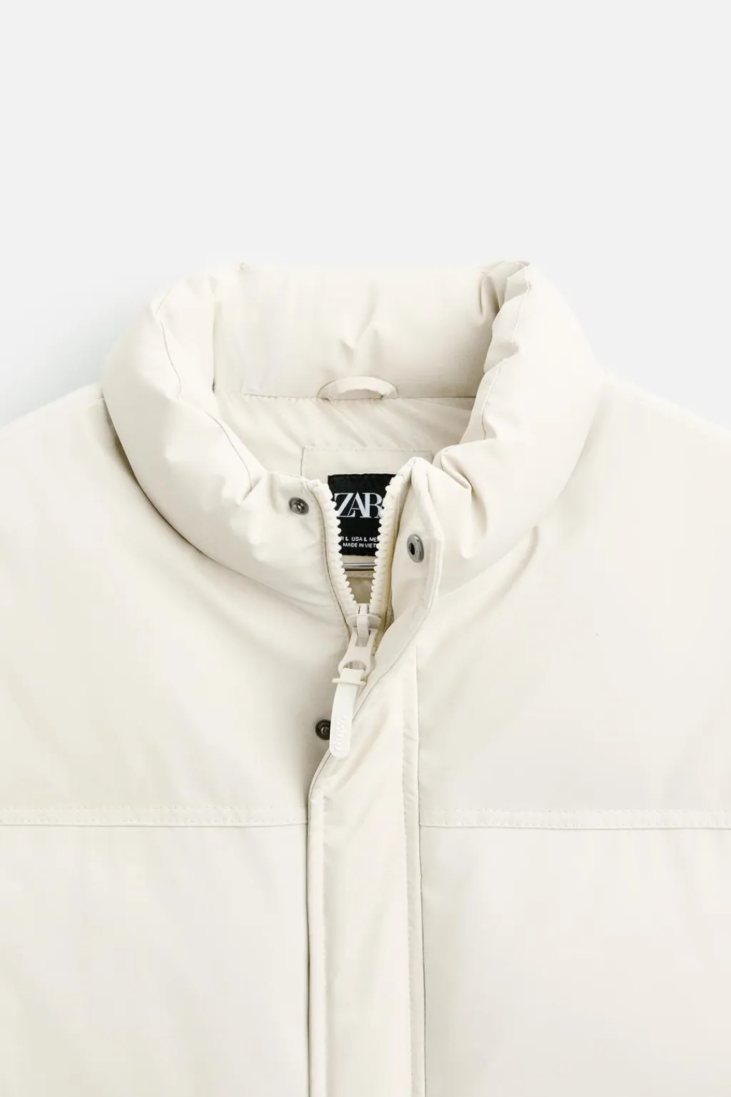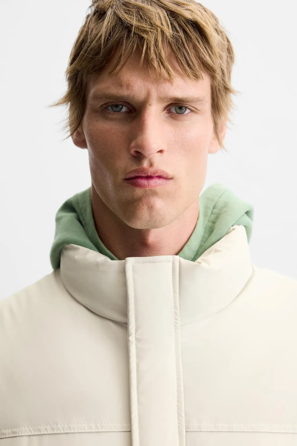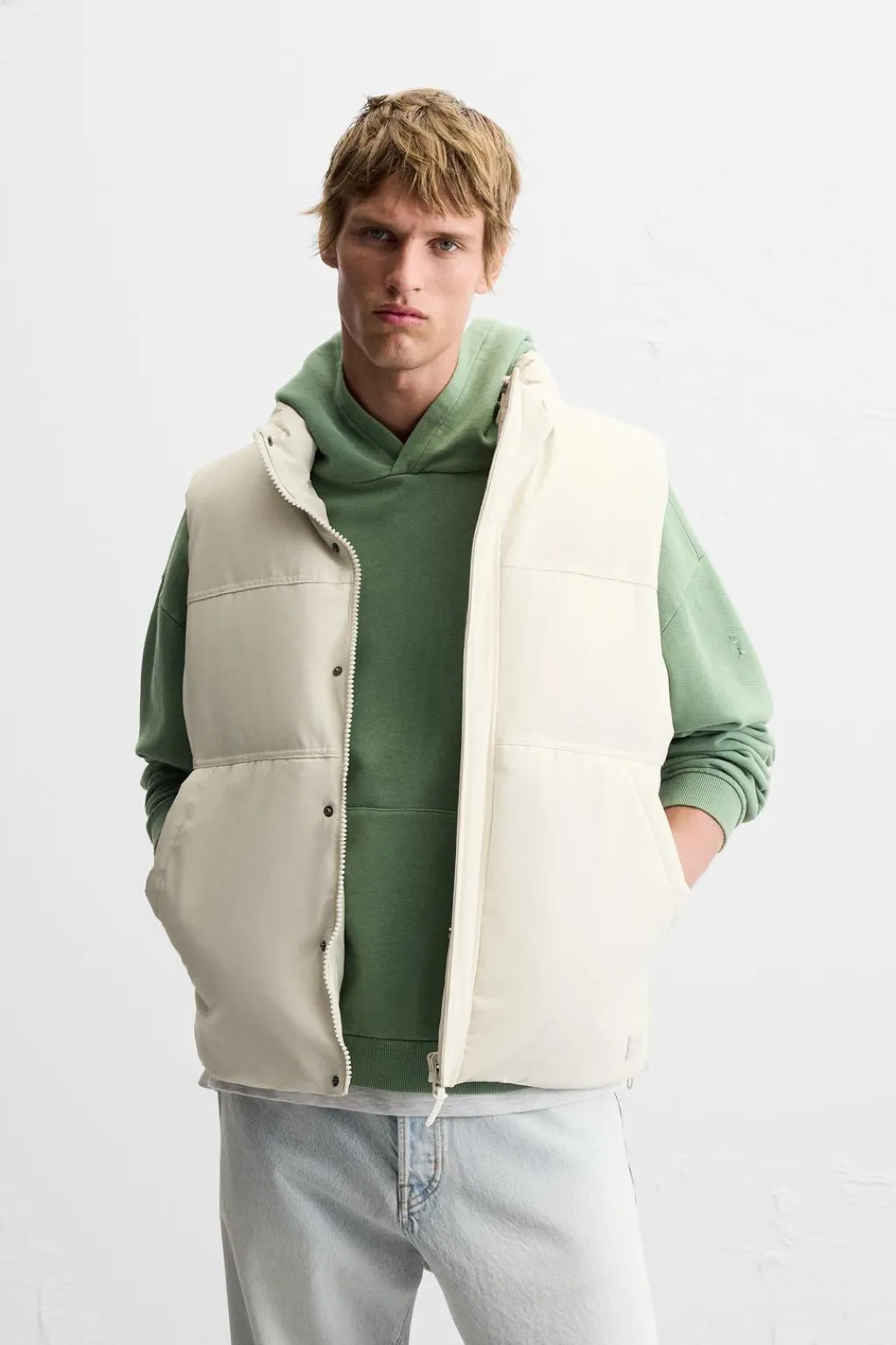 Chaleco acolchado confeccionado en tejido técnico con acabado engomado. Cuello subido y manga sisa. Bolsillos de vivo en cadera y detalle de bolsillo interior. Bajo ajustable con elástico en laterales. Cierre frontal con cremallera oculta por solapa con botones a presión.