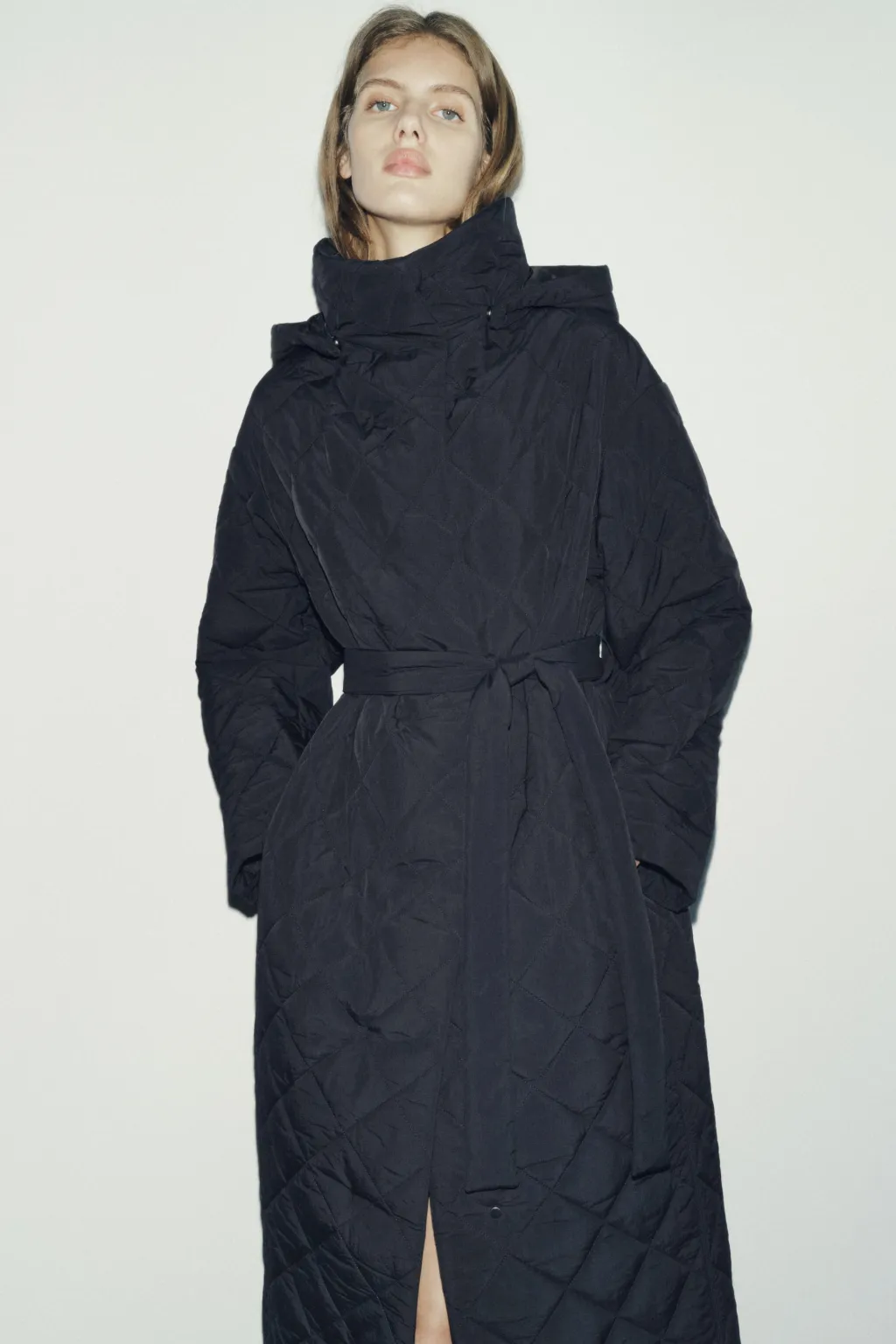 Chaqueta larga acolchada de cuello alto. Capucha extraíble con botones a presión. Manga larga. Cinturón ajustables con lazadas. Bolsillos delanteros. Cierre frontal con botones a presión.