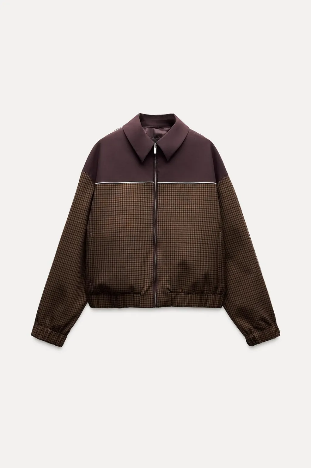 Chaqueta bomber de cuello solapa y manga larga. Falsos bolsillos delanteros de vivo. Acabados elásticos. Cierre frontal con cremallera.
