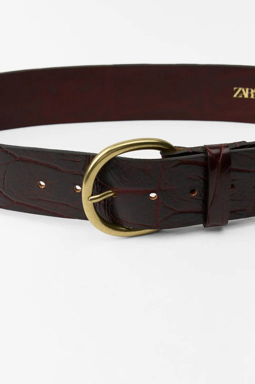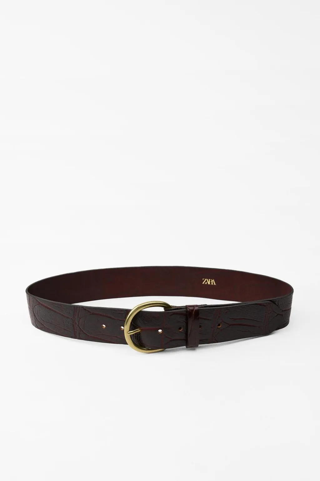 Cinturón de 5 cm de ancho realizado en piel con grabado tipo cocodrilo. Hebilla metálica circular.