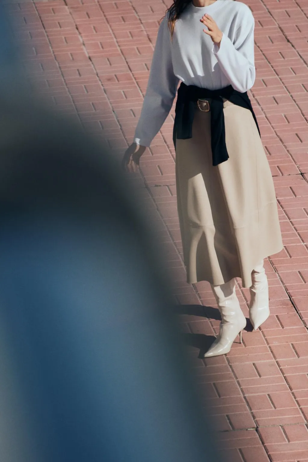 Falda de tiro alto con cinturón. Bajo en evasé. Cierre lateral con cremallera oculta en costura.