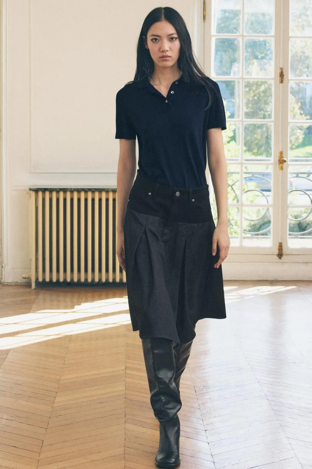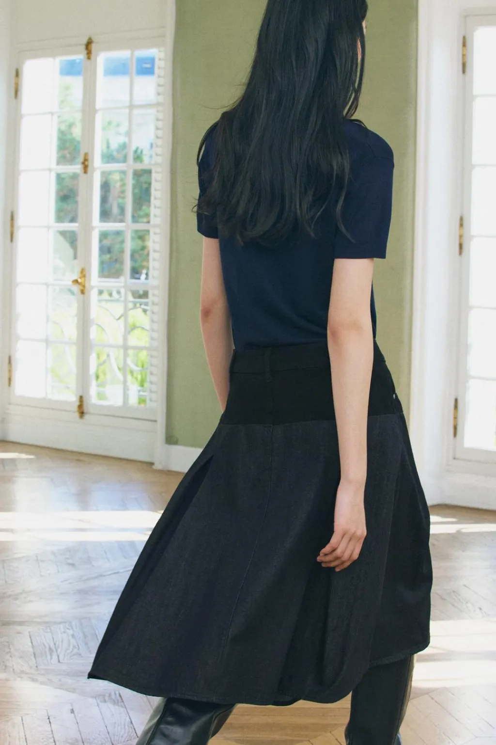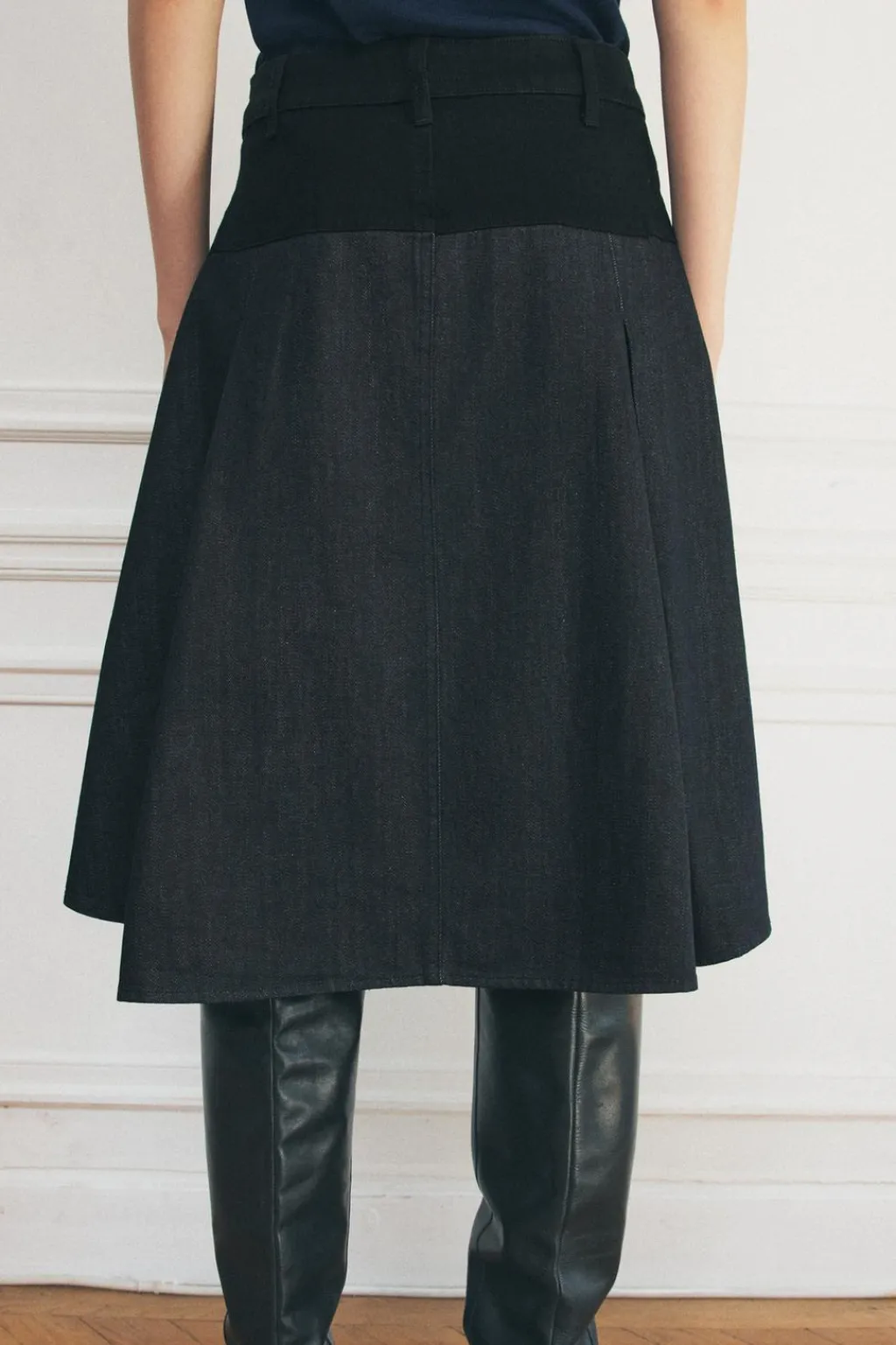 Falda midi confeccionada en hilatura de algodón 100%. Tiro medio y cintura con trabillas. Bolsillos delanteros. Detalle de pinzas y combinación de tejidos. Bajo acabado en línea evasé. Cierre frontalcon cremallera y botón.