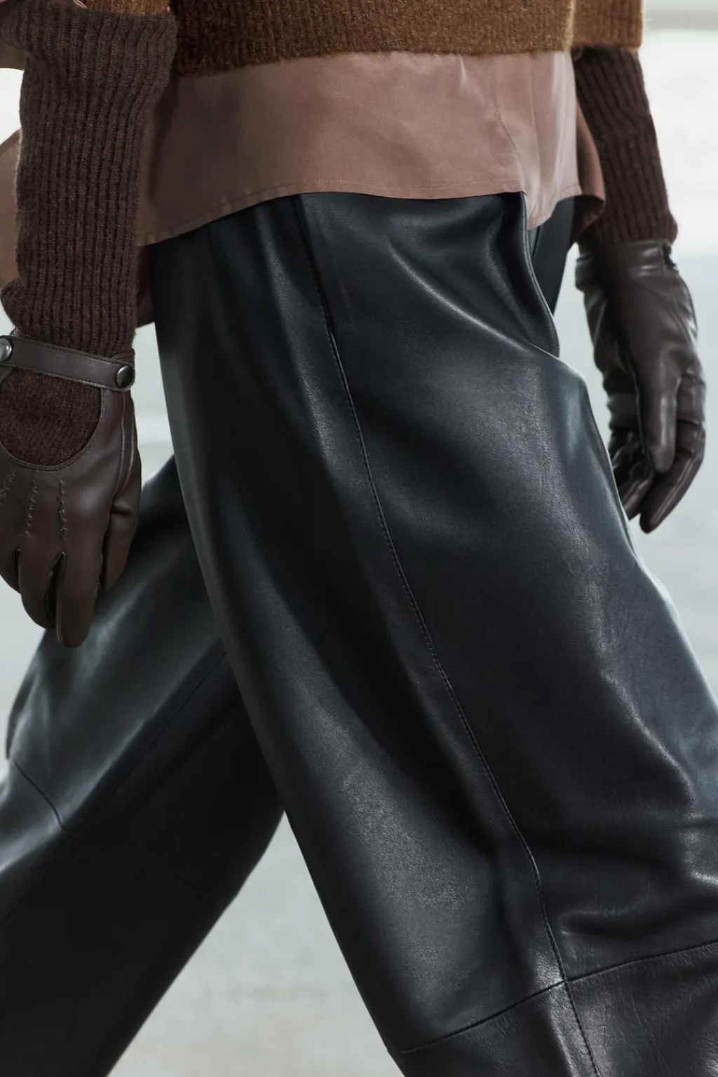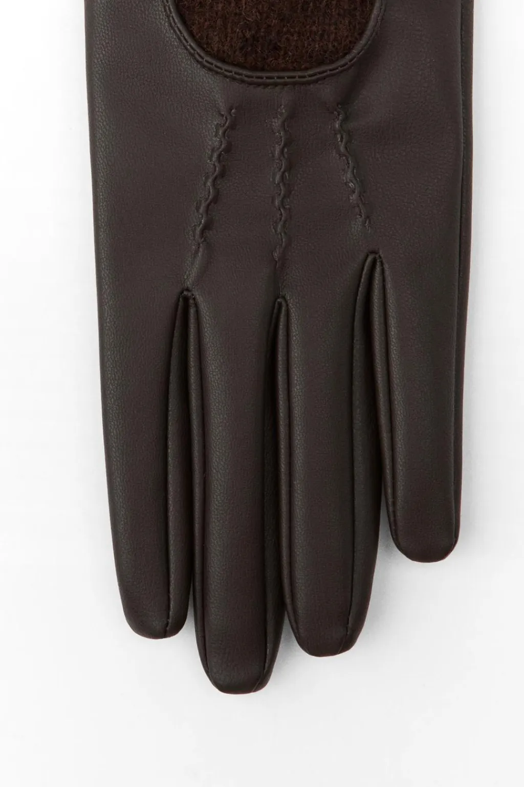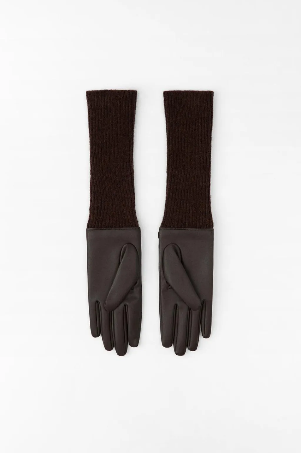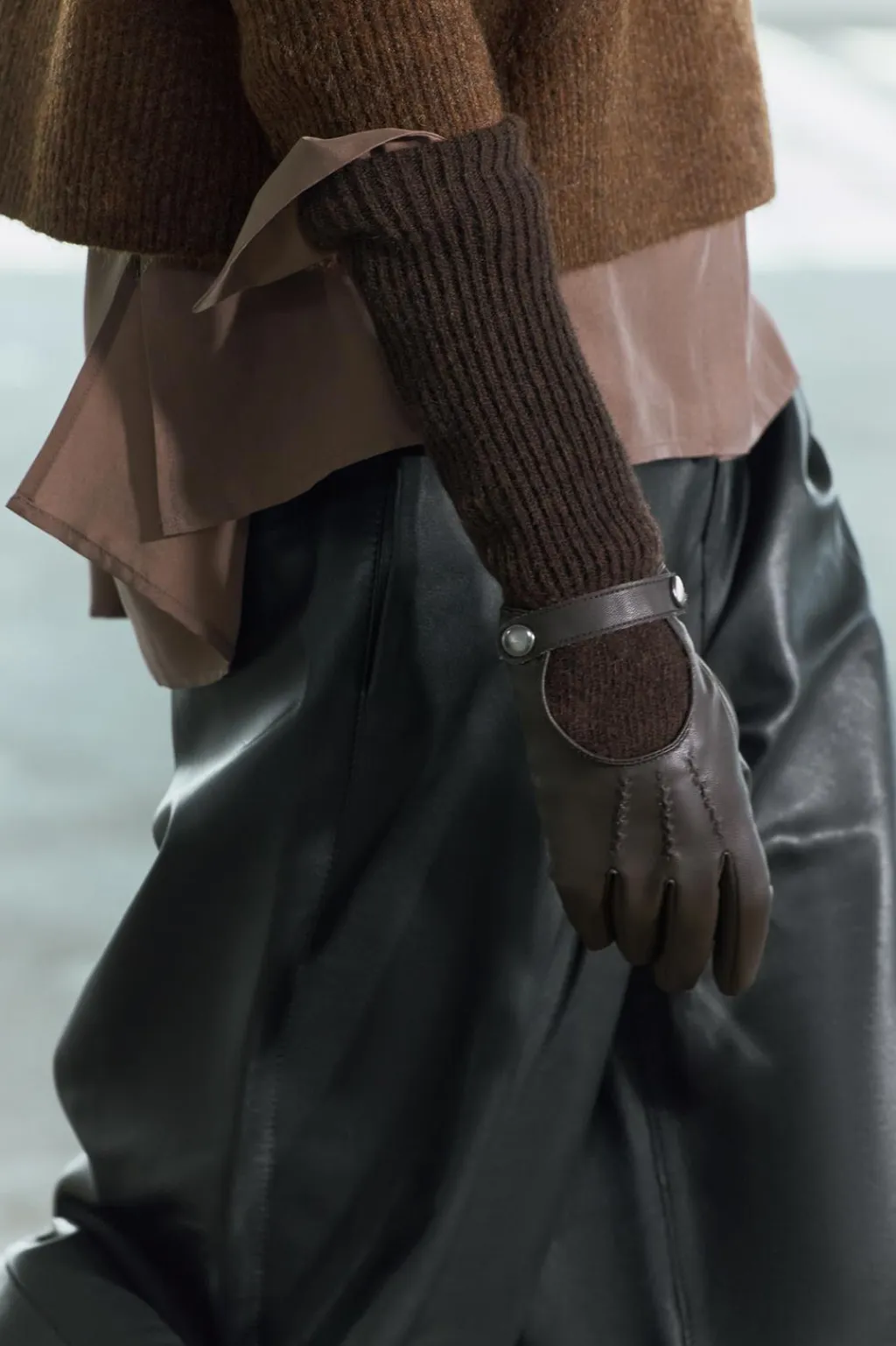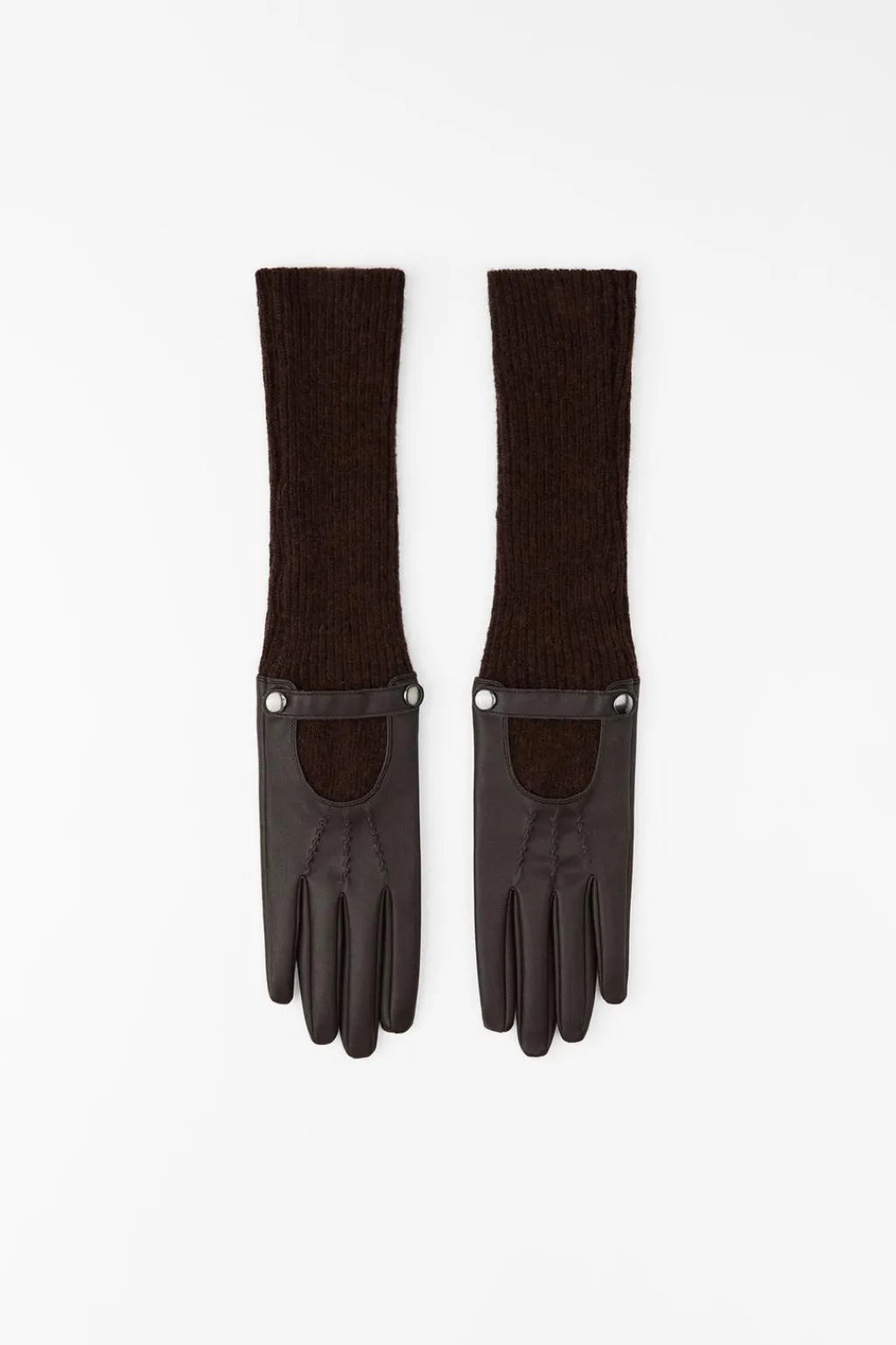 Guantes largos confeccionados en mezcla de lana y tejido efecto piel. Cierre con botón a presión.