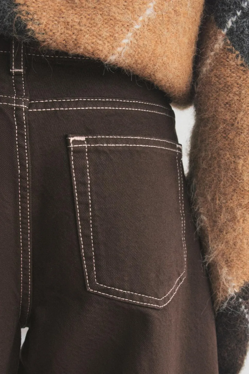 Jeans de tiro medio y cintura con trabillas. Cinco bolsillos. Detalle de pespuntes marcados a contraste. Bajo acabado sin costura. Cierre frontal con cremallera y botón.