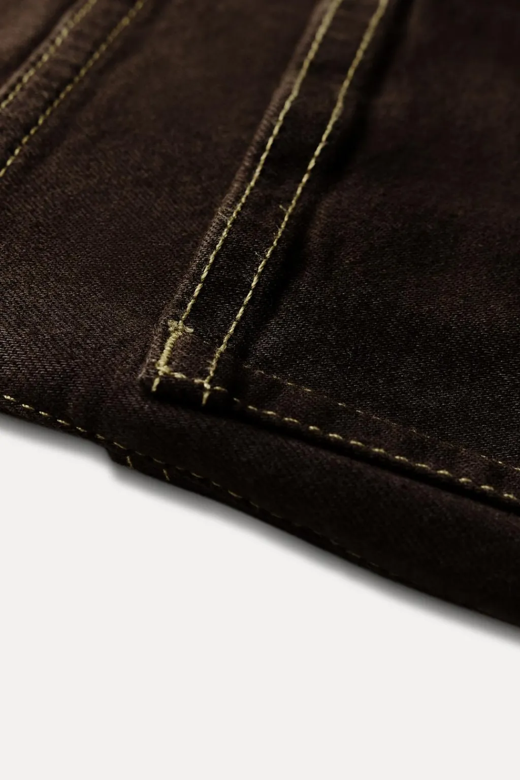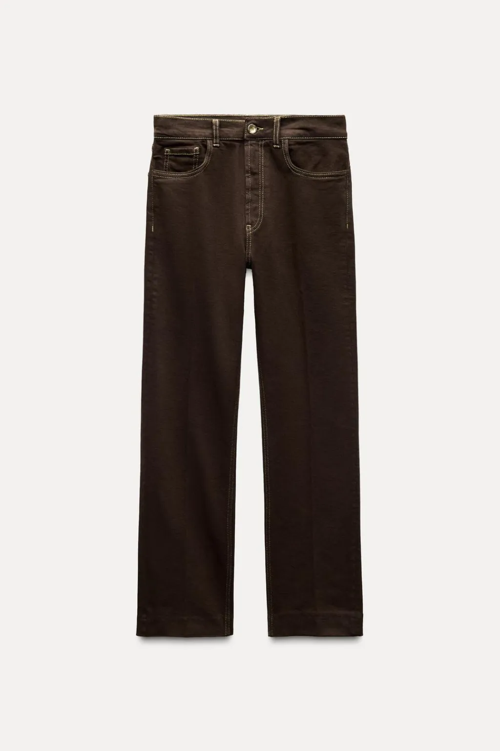 Jeans de tiro alto y cintura con trabillas. Cinco bolsillos. Detalle de pespuntes marcados a contraste. Cierre frontal con cremallera y botón.