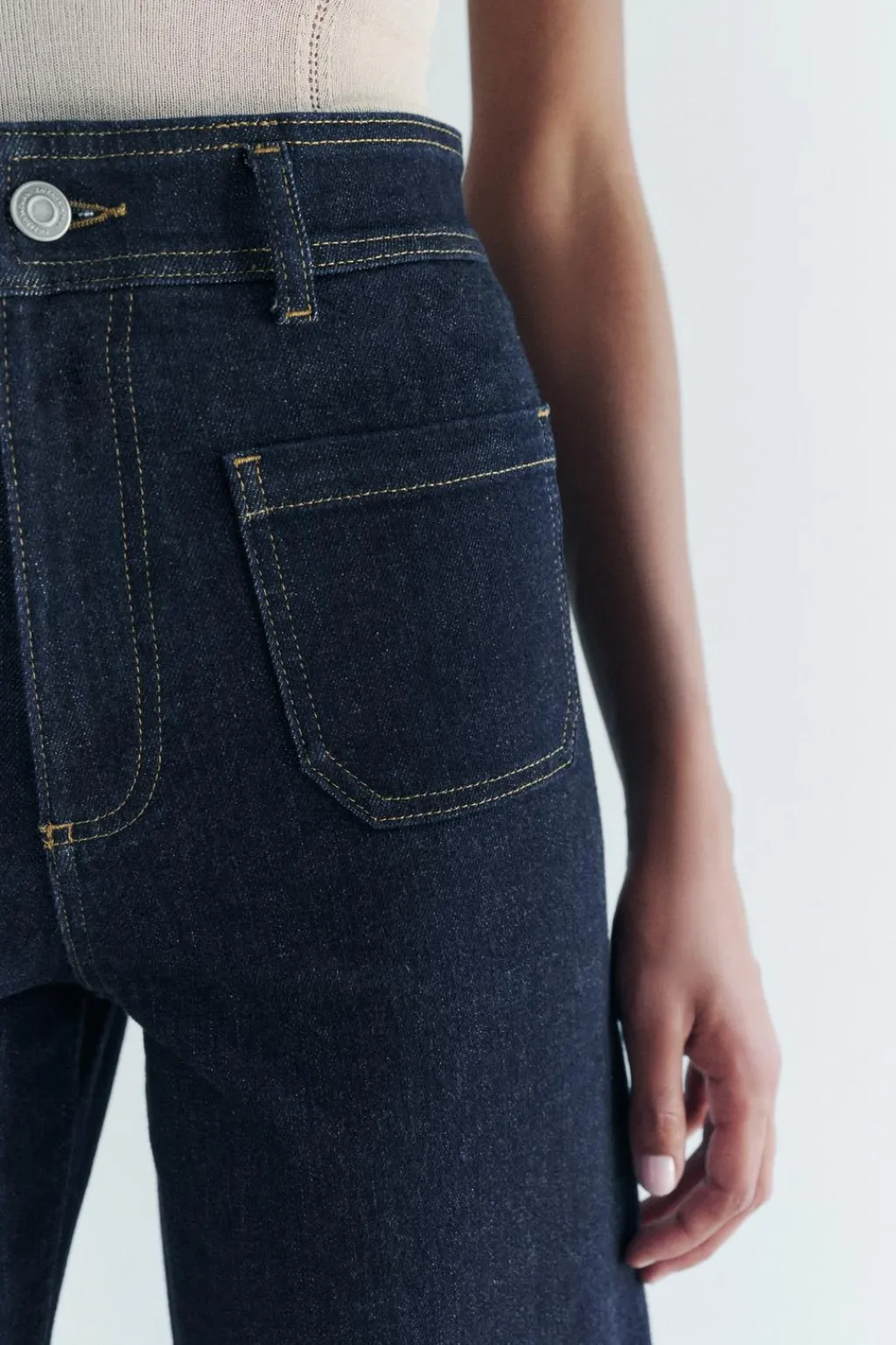 Jeans de tiro alto con bolsillos de plastrón en espalda. Bajo acabado sin costura. Cierre frontal con cremallera y botón.