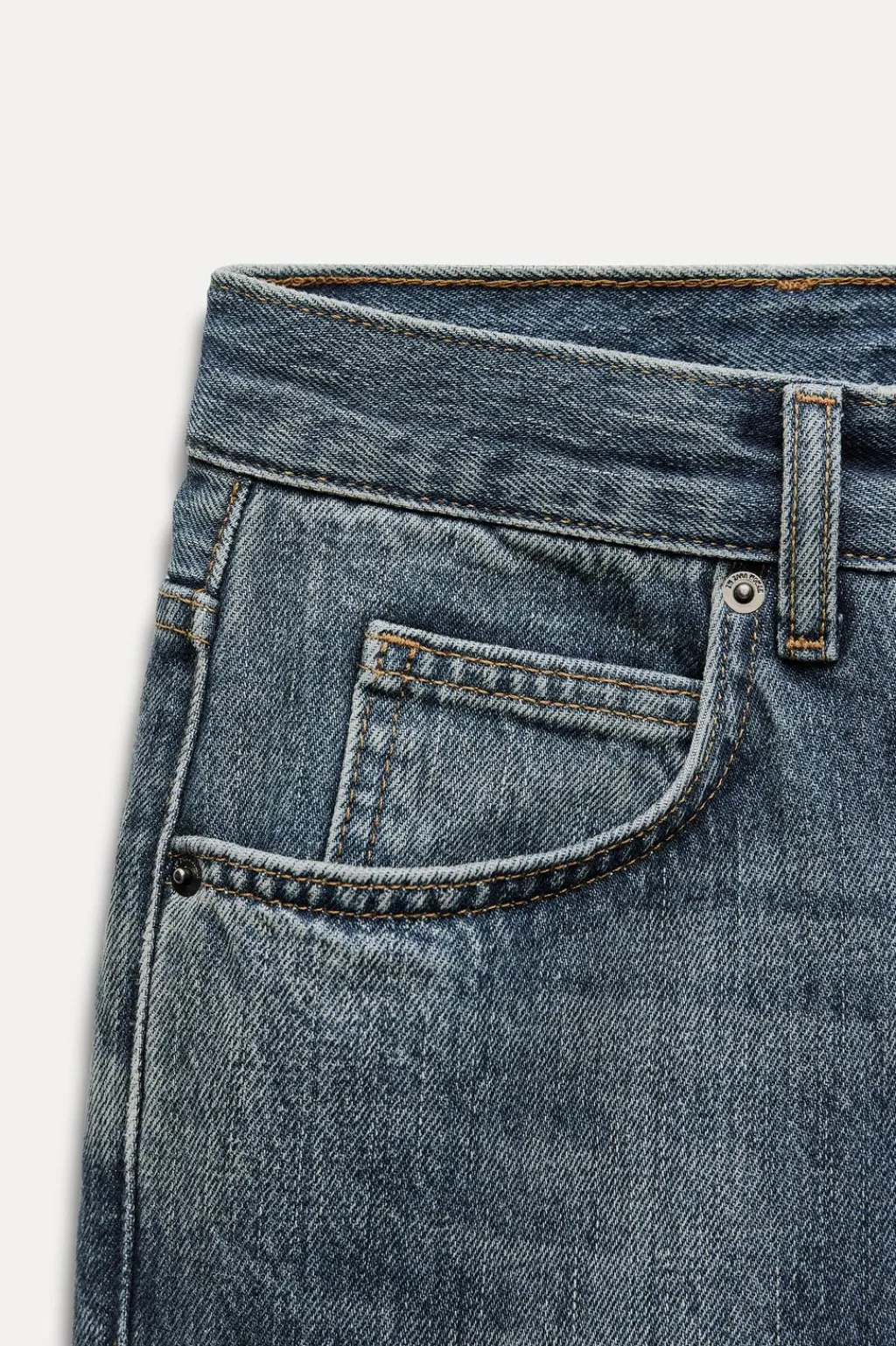 Jeans de tiro medio y cintura con trabillas. Cinco bolsillos. Efecto lavado. Cierre frontal con cremallera y botón.