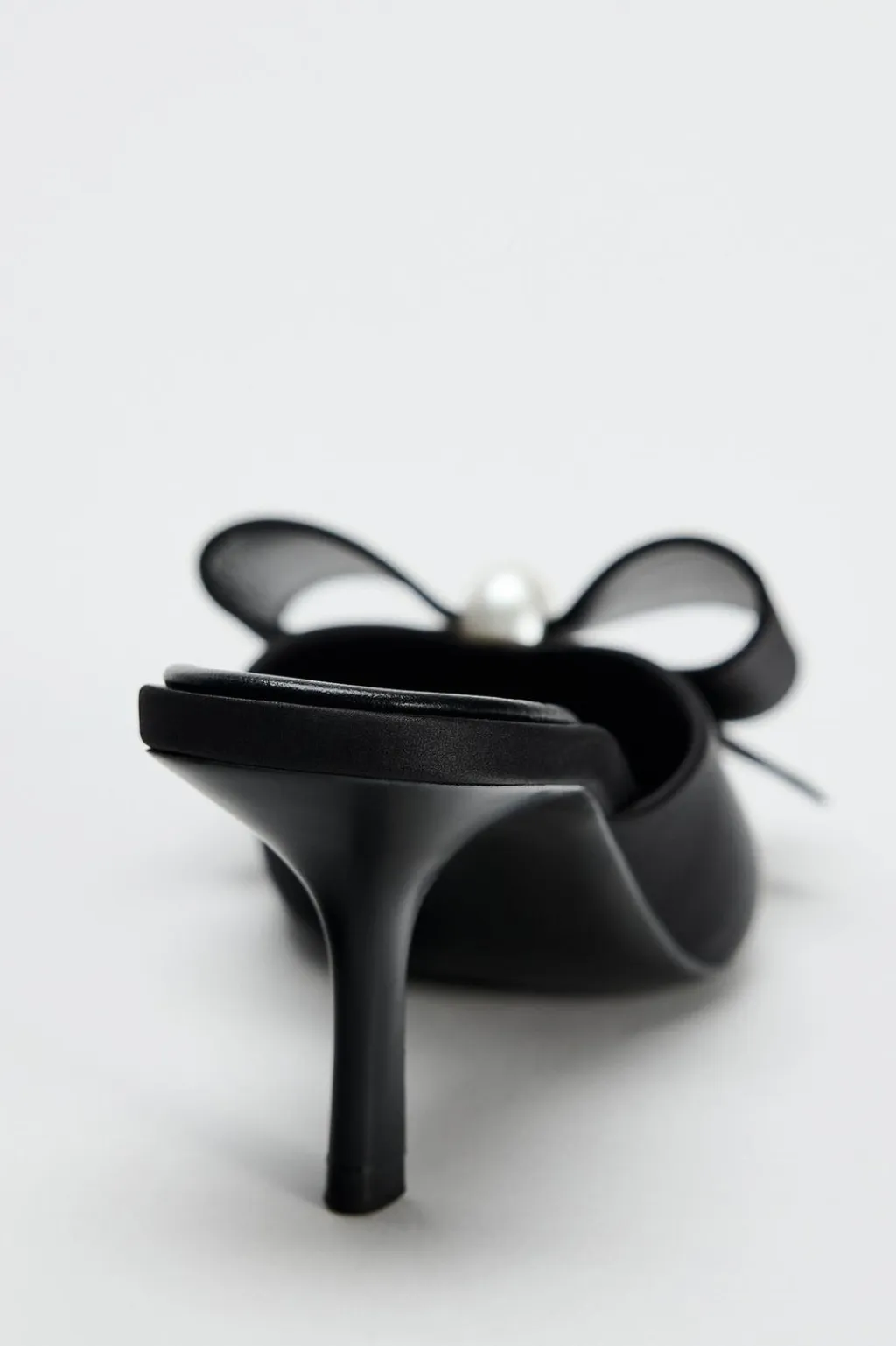 Zapato tacón tipo mule en tejido satinado. Detalle de lazo y perla en al parte delantera. Tacón fino. Acabado en punta.