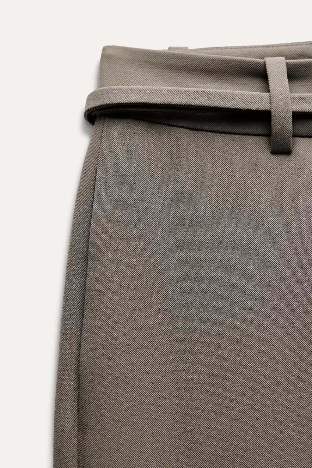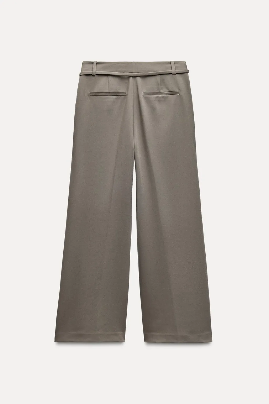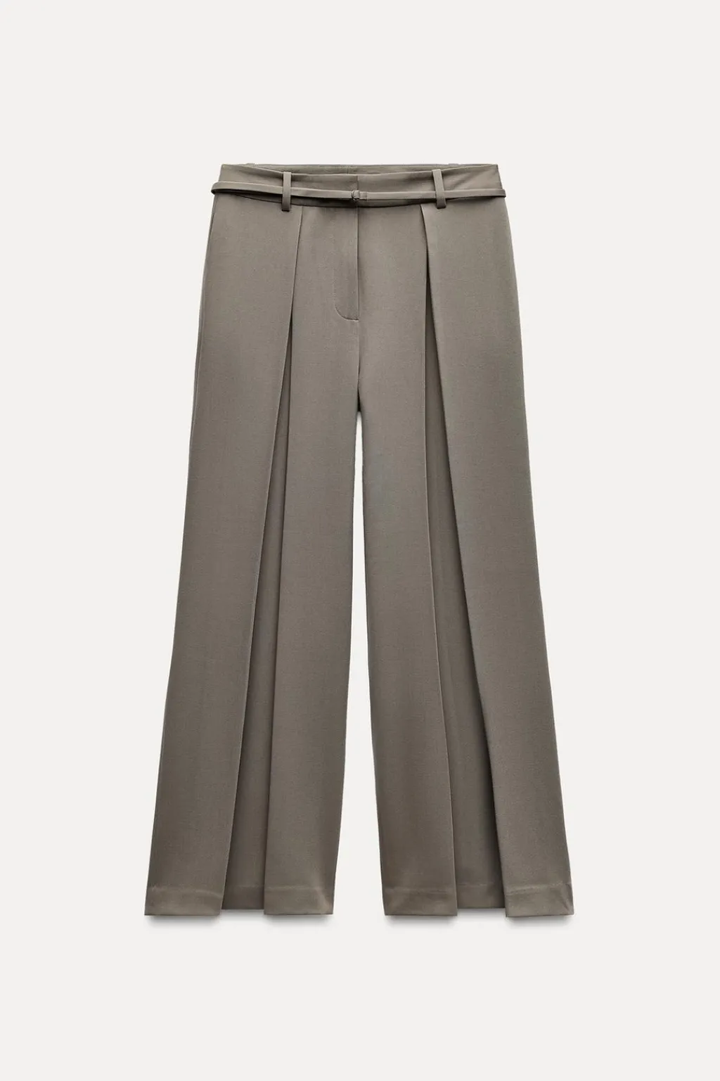 Pantalón de tiro alto con pinzas delanteras y cinturón fino. Bolsillos delanteros y falsos bolsillos de vivo en espalda. Pernera ancha. Cierre frontal con cremallera, botón interior y gancho.