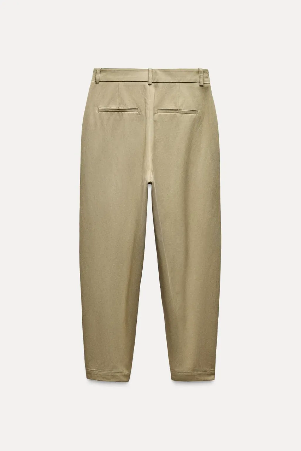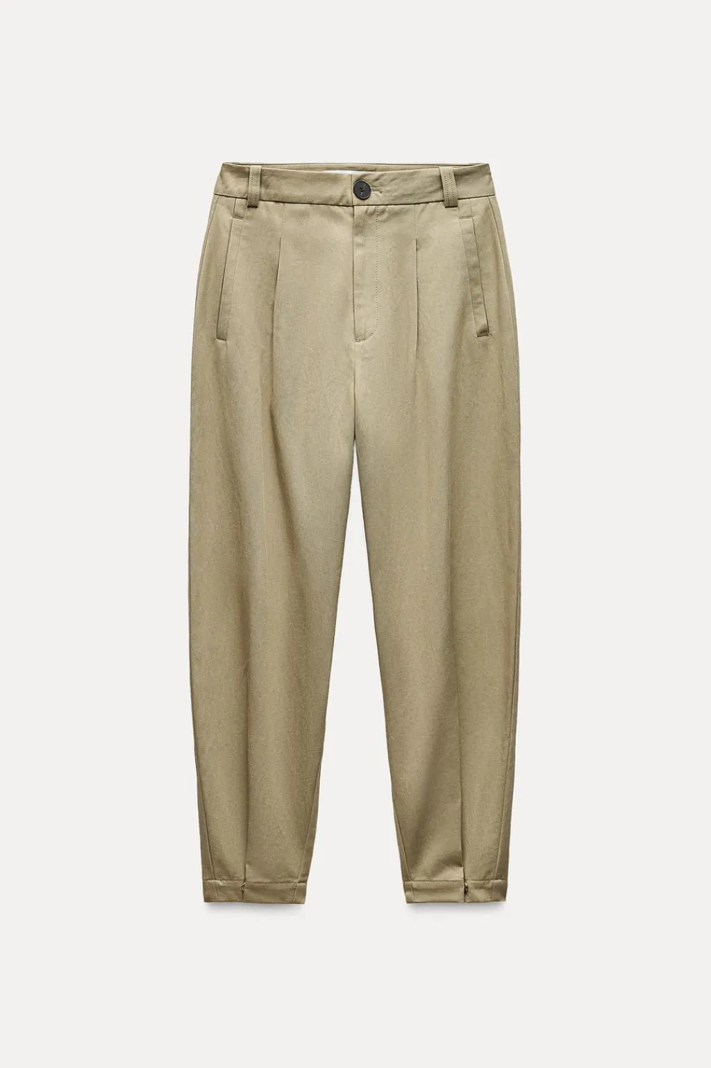 Pantalón de tiro alto con pinzas delanteras. Bolsillos frontales y falsos bolsillos de vivo en espalda. Bajo ajustable con botón a presión oculto. Cierre delantero con cremallera y botón.