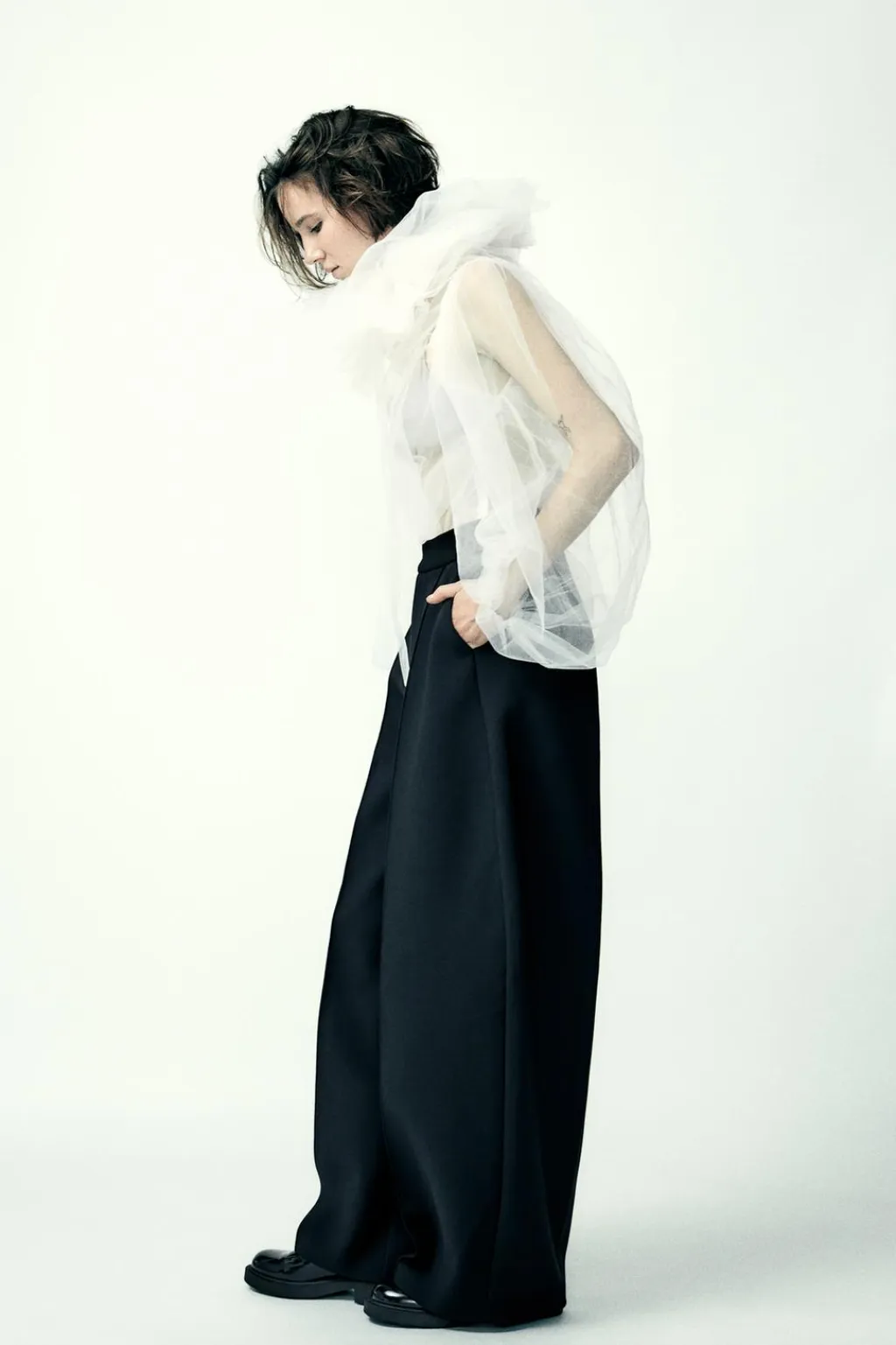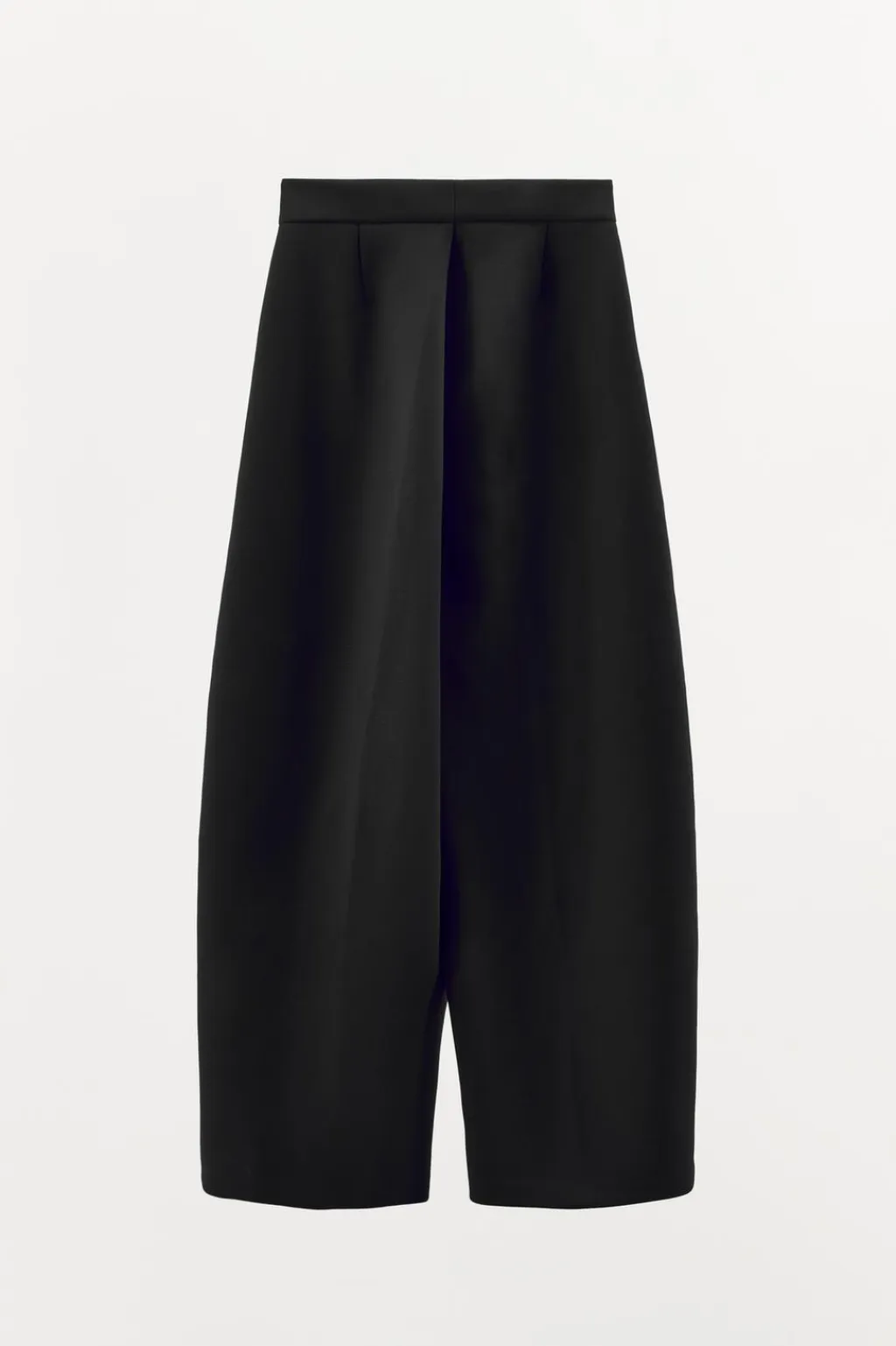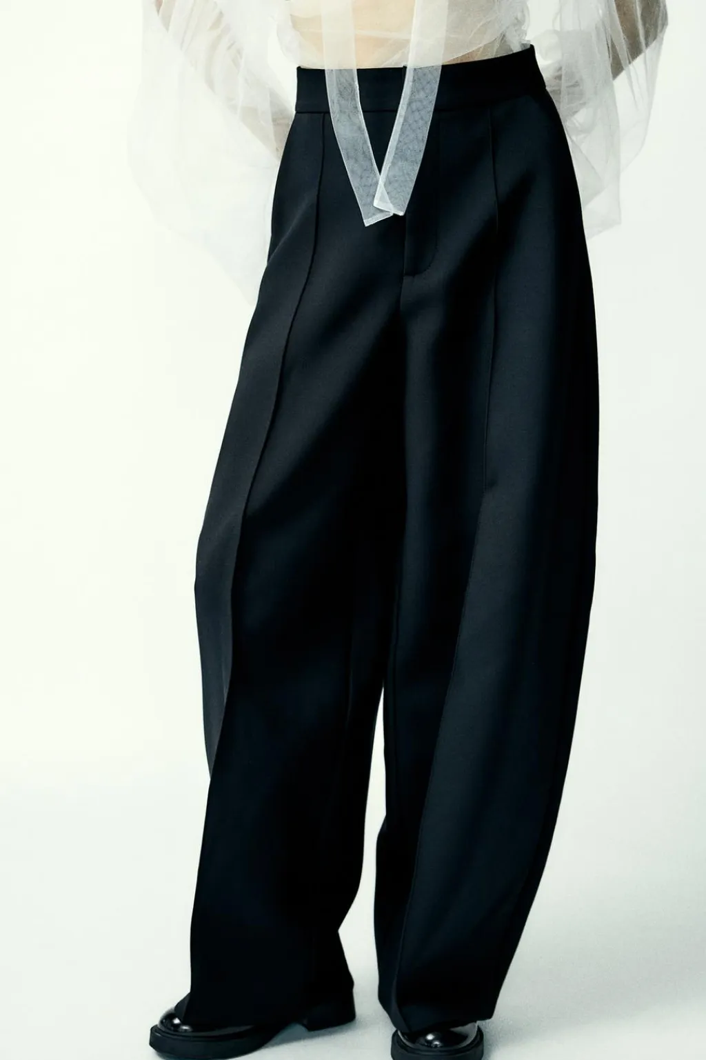 Pantalón de tiro alto con bolsillos laterales. Cierre frontal con cremallera, botón interior y ganchos metálicos.