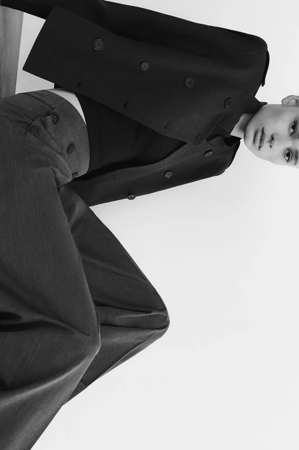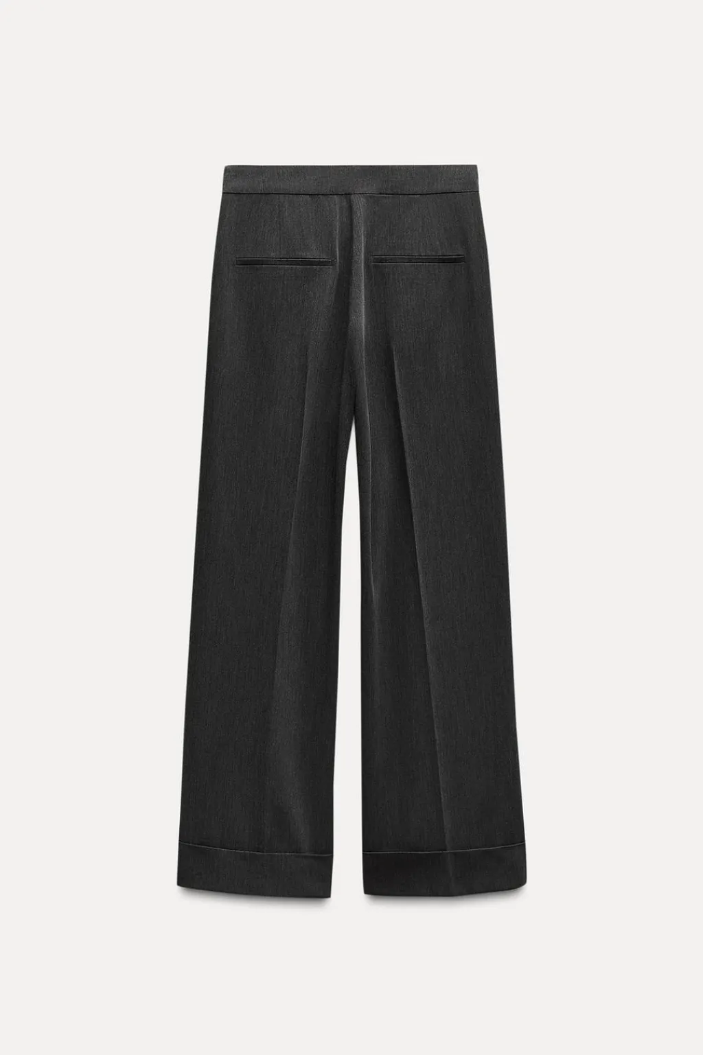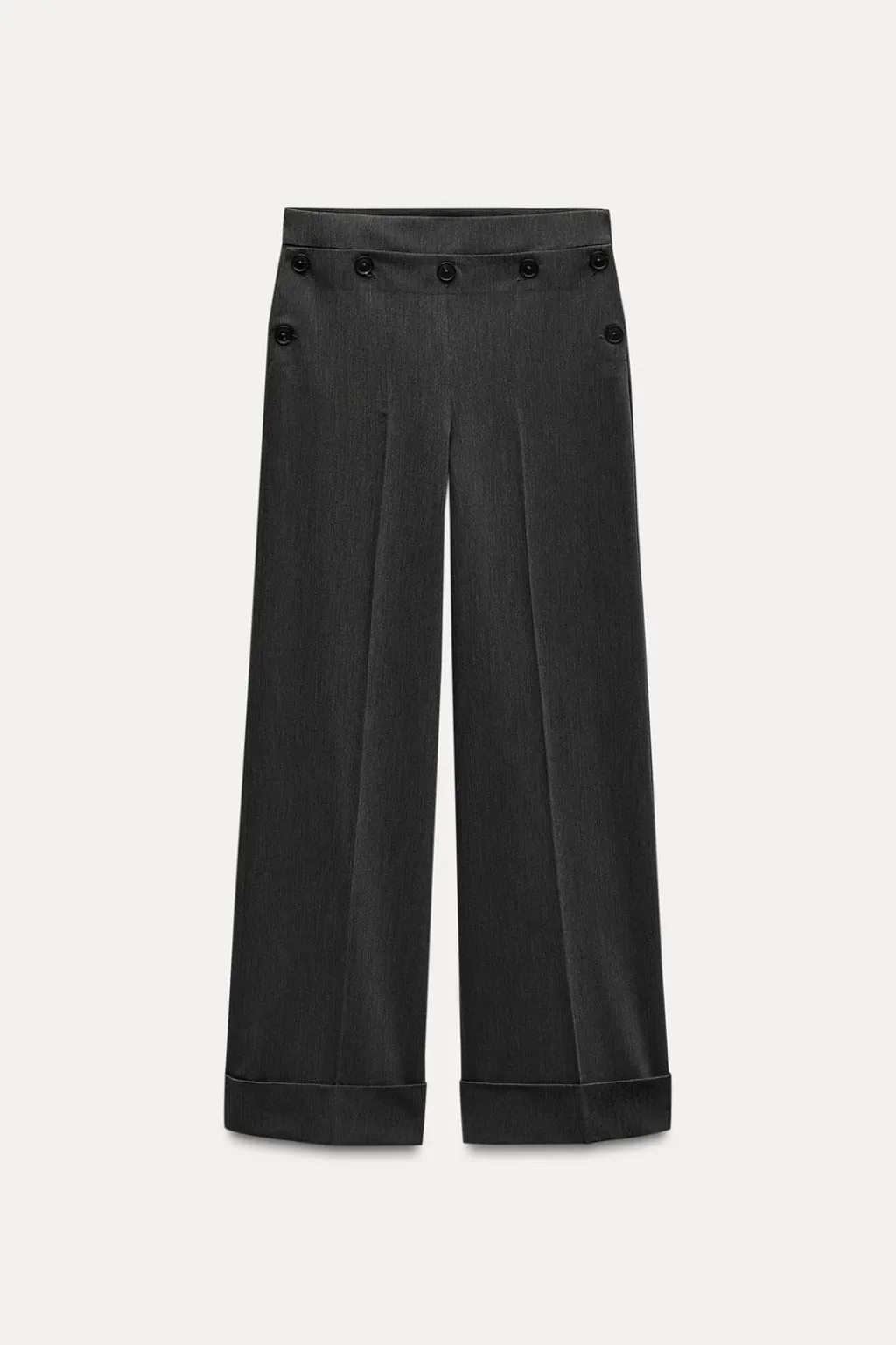 Pantalón de tiro medio. Falsos bolsillos de vivo en espalda. Detalle de botones en delantero. Bajo acabado en vuelta. Cierre lateral con cremallera oculta en costura.