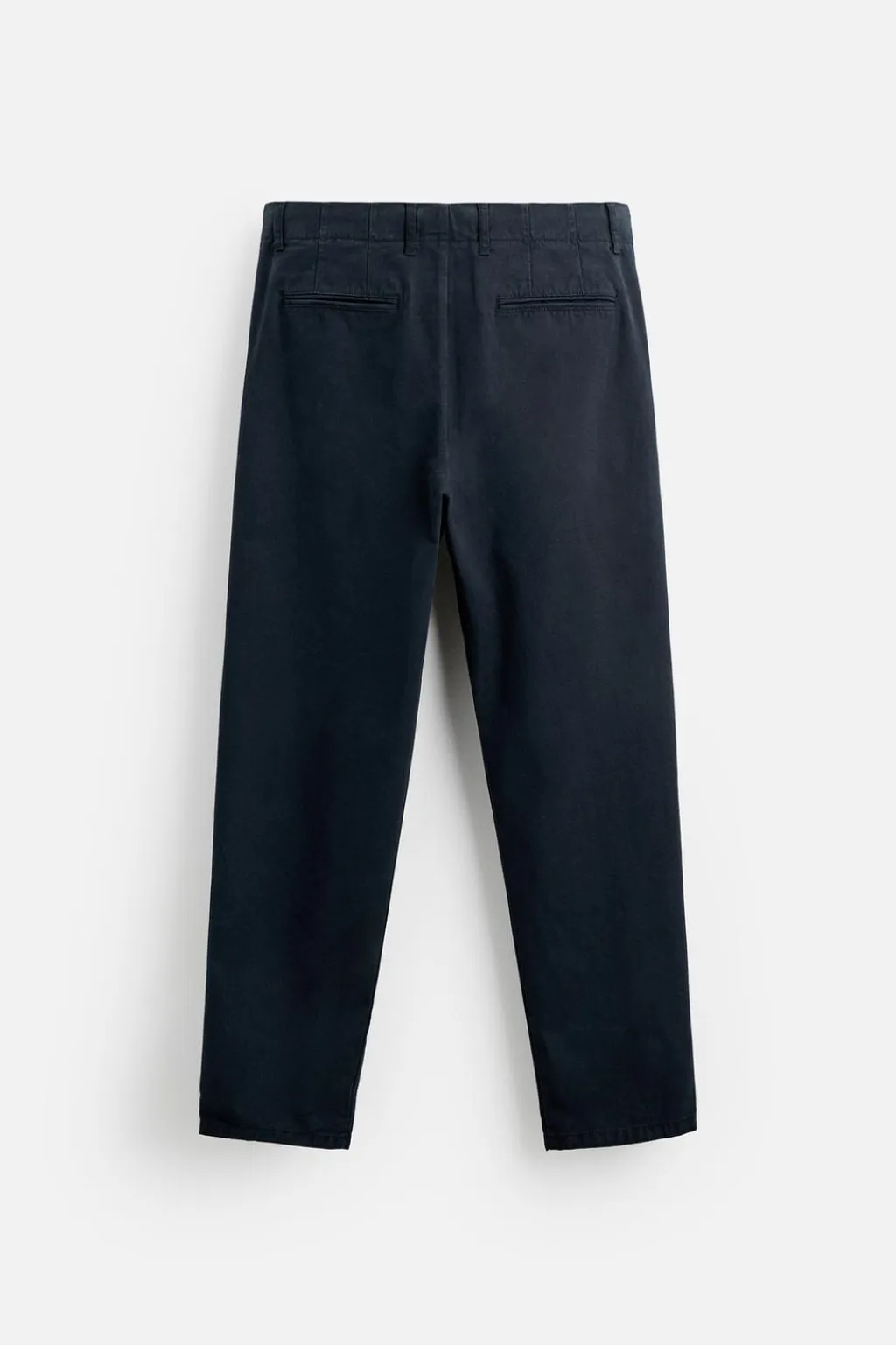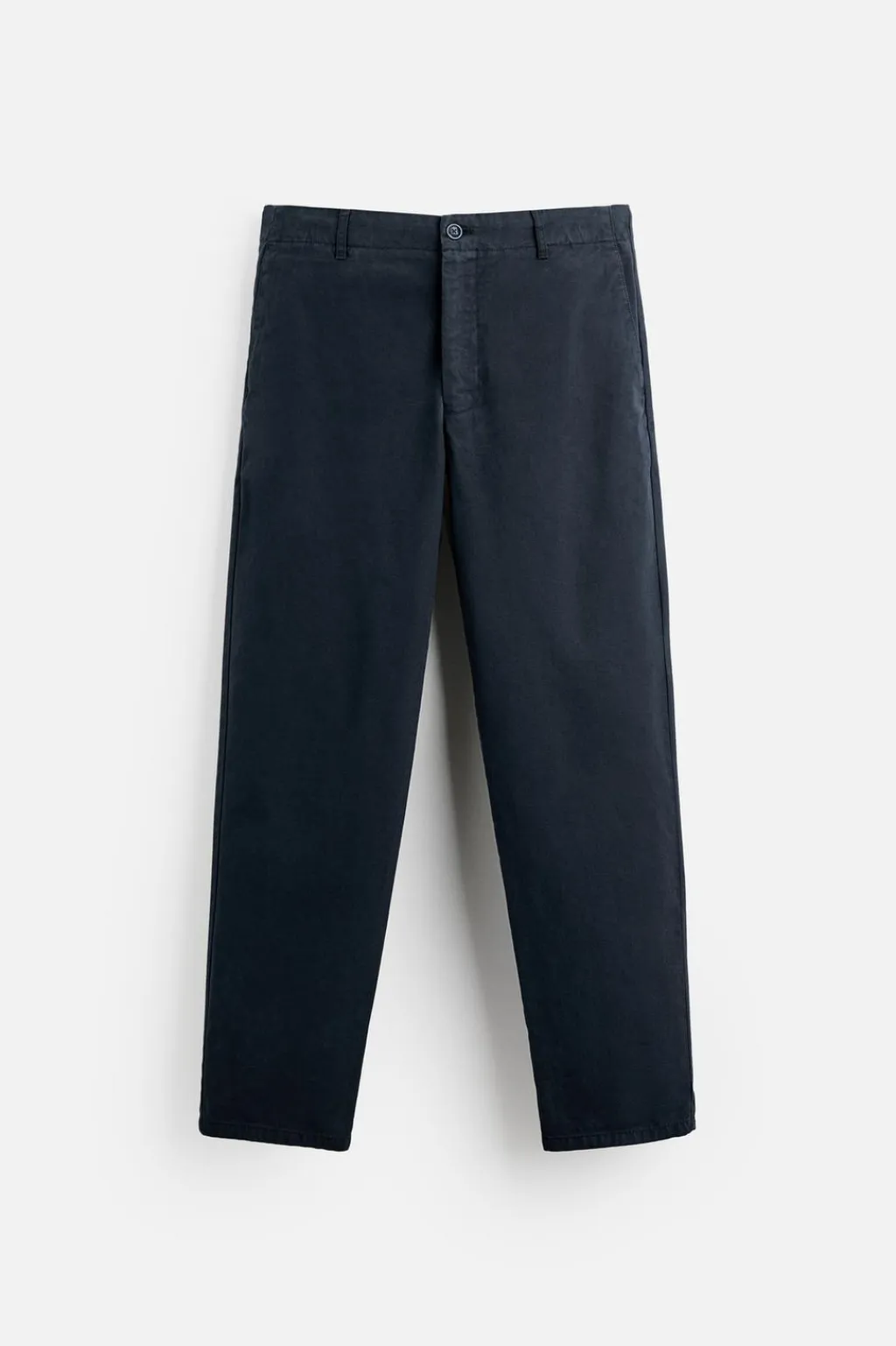 Pantalón regular fit confeccionado en tejido de algodón con estructura twill. Bolsillos frontales y detalle de bolsillos traseros de vivo. Efecto lavado. Cierre frontal con cremallera y botón.