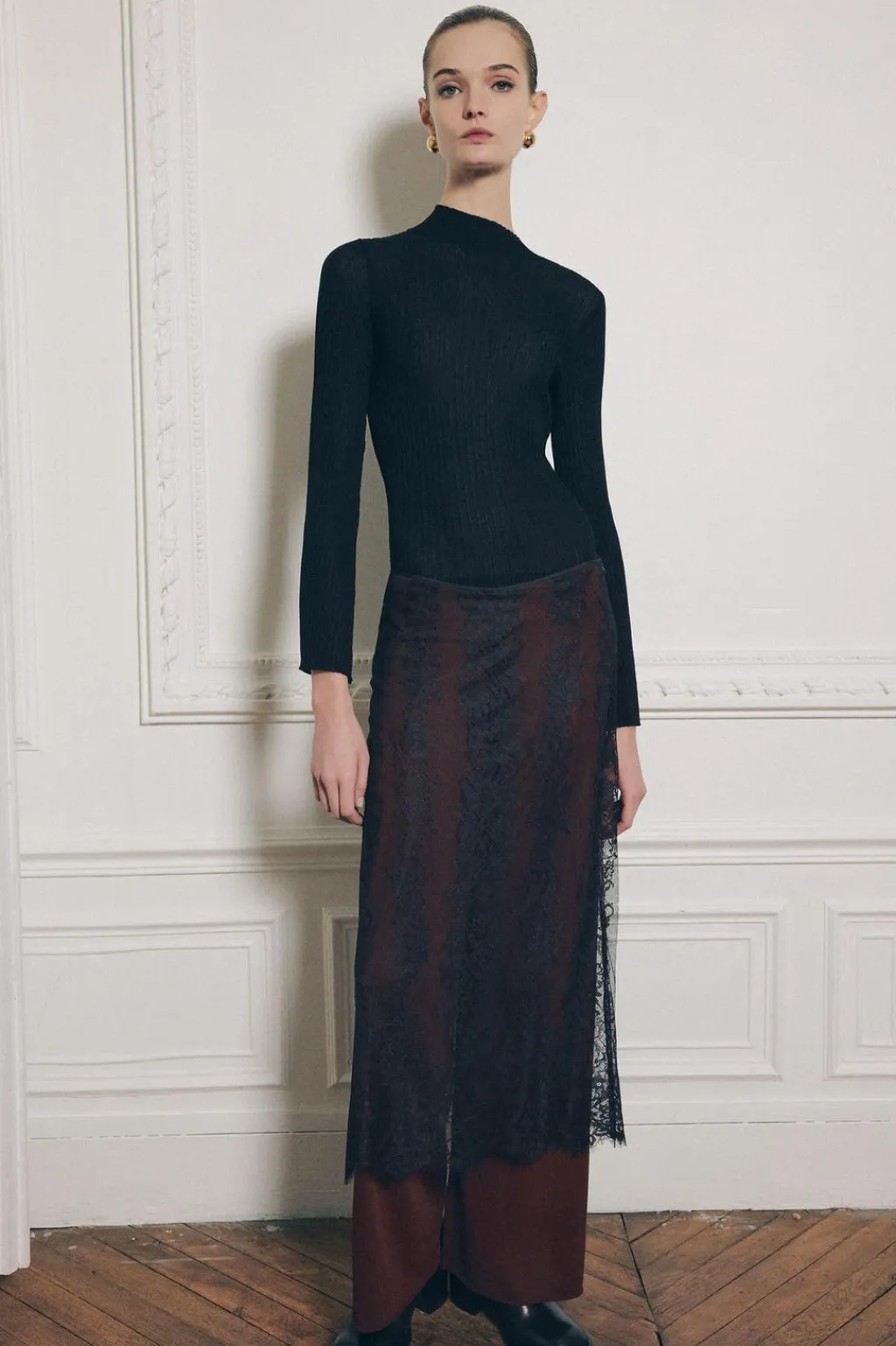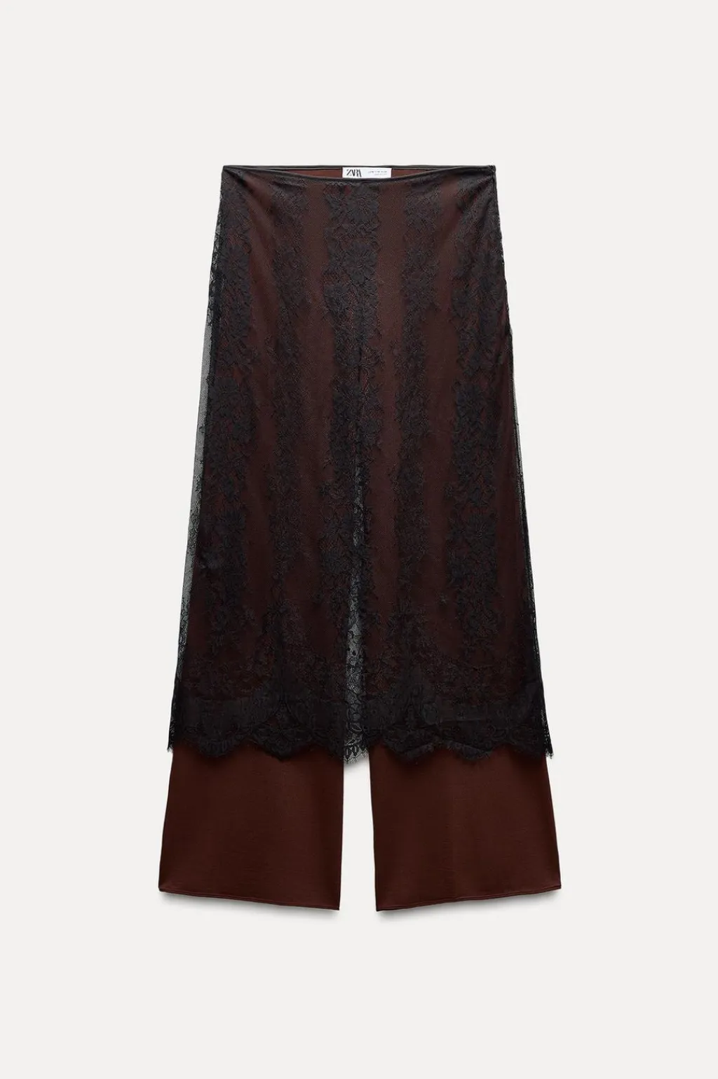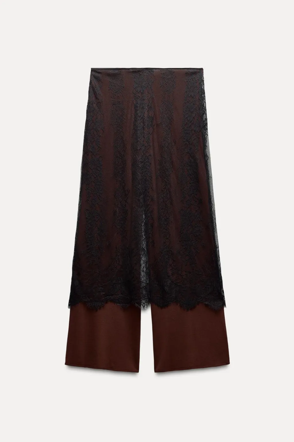 Pantalón de tiro alto con cintura elástica y pernera ancha. Detalle de tejido combinado con encaje.