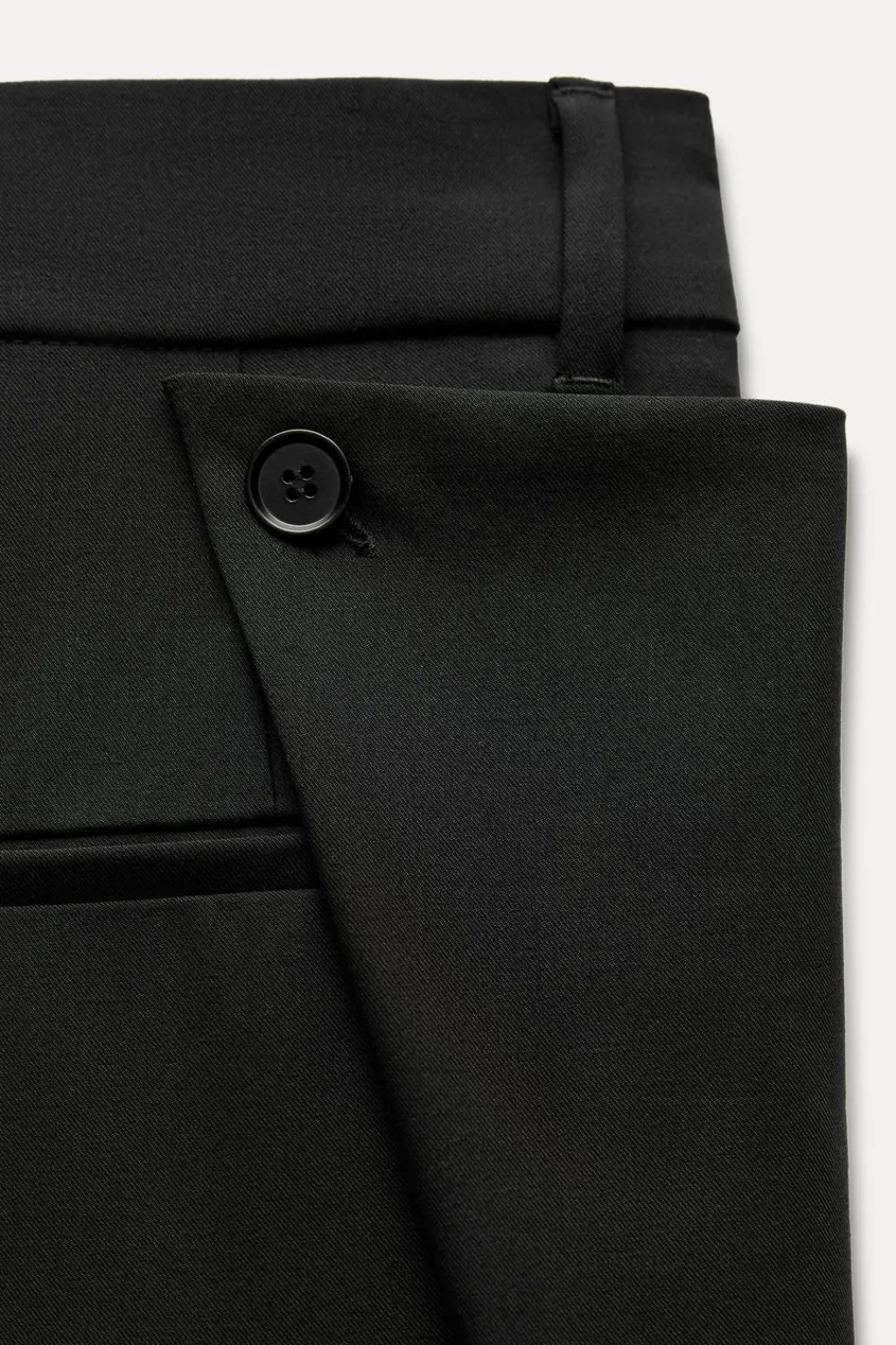 Pantalón de tiro alto con trabillas. Bolsillos laterales y de vivo en espalda. Tejido en superposición con botón en espalda. Cierre frontal con cremallera, botón interior y ganchos metálicos.