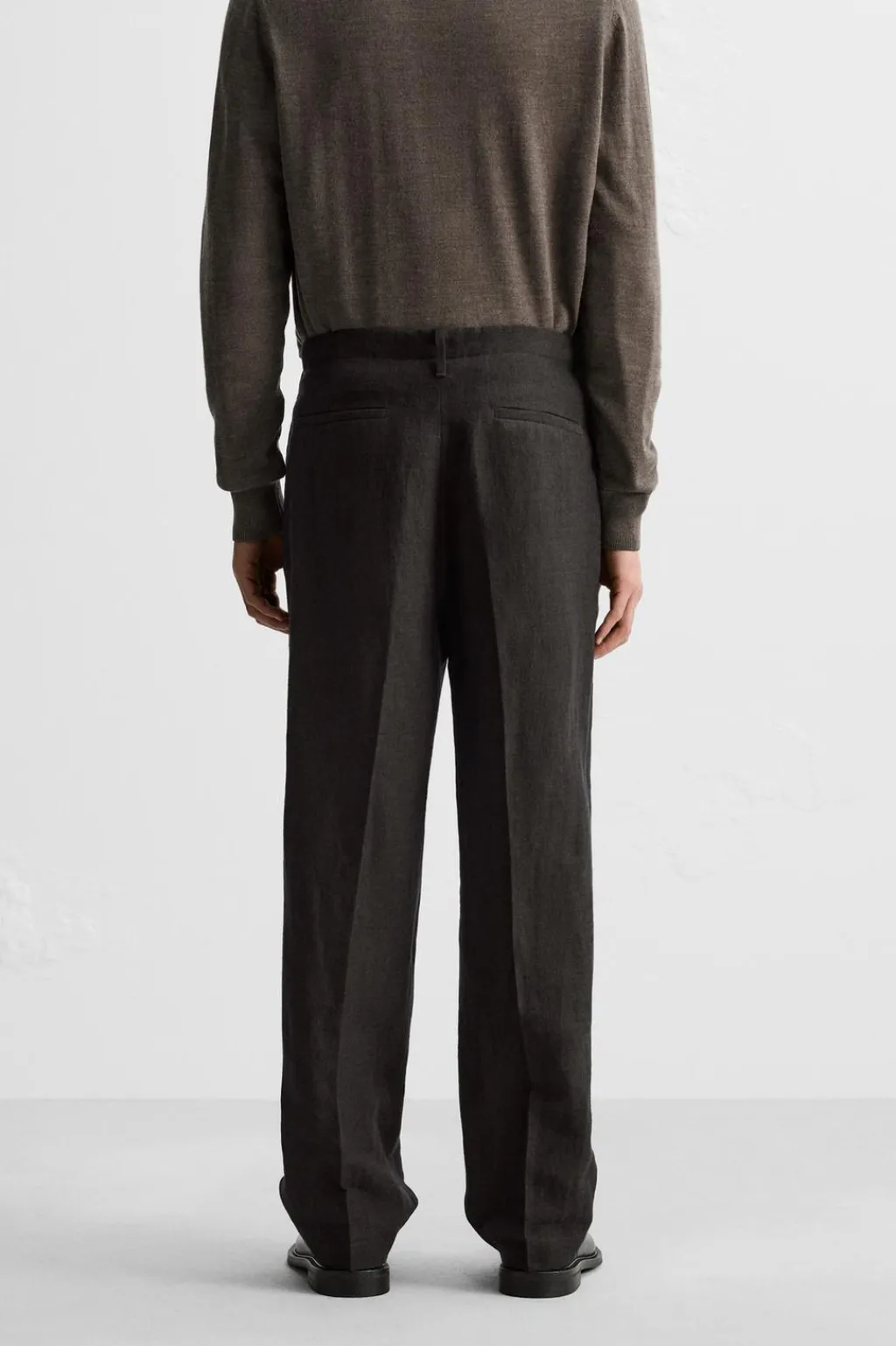 Pantalón regular fit confeccionado en tejido de origen italiano con mezcla de lino y lana.
