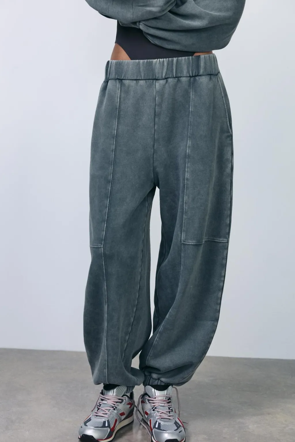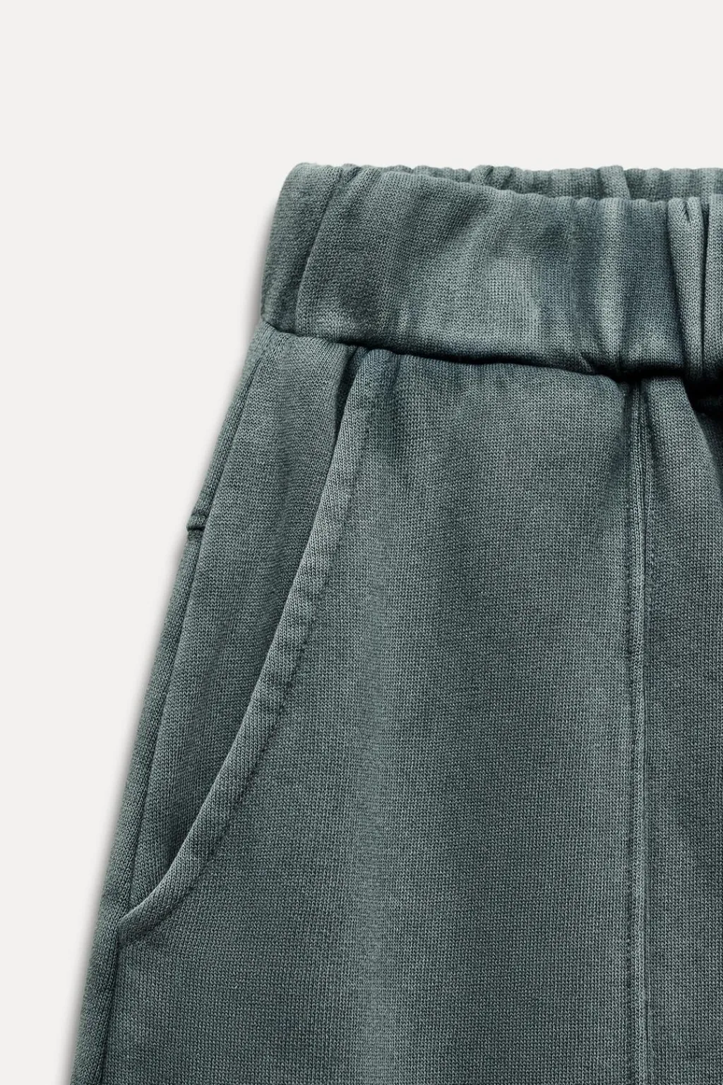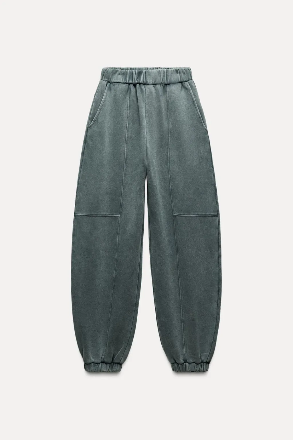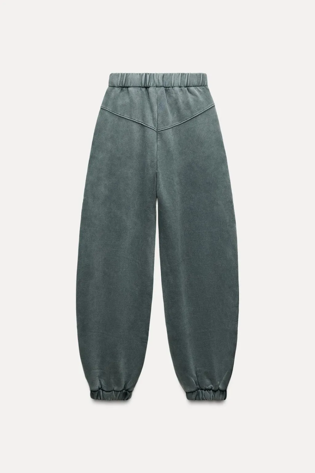 Pantalón confeccionado en algodón efecto lavado. Tiro alto con cintura elástica. Bolsillos laterales. Bajo acabado en puño elástico.