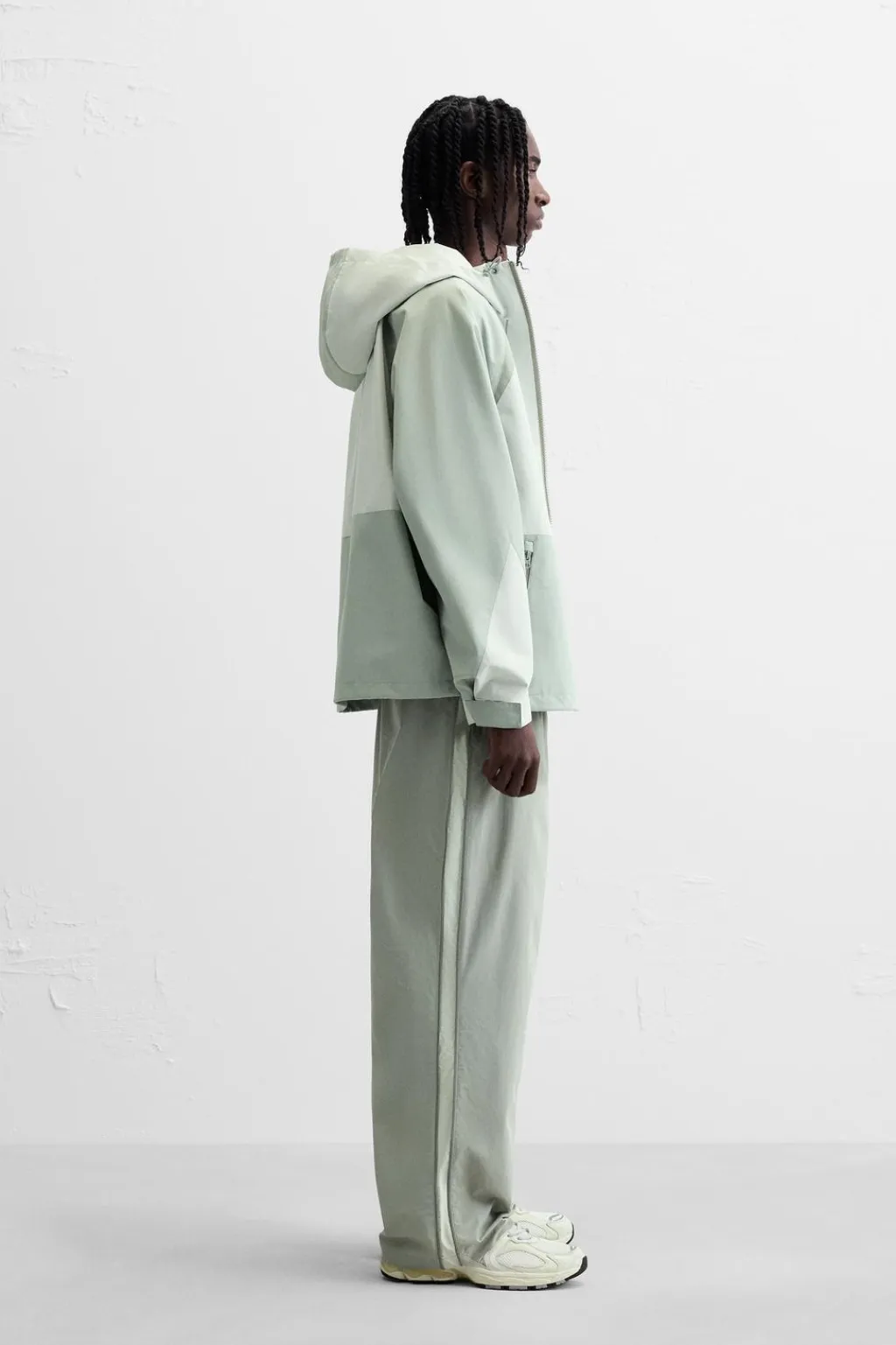 Pantalón relaxed fit confeccionado en tejido técnico. Cintura elástica. Bolsillos laterales y detalle de bolsillo trasero de vivo. Bandas laterales combinadas a contraste.