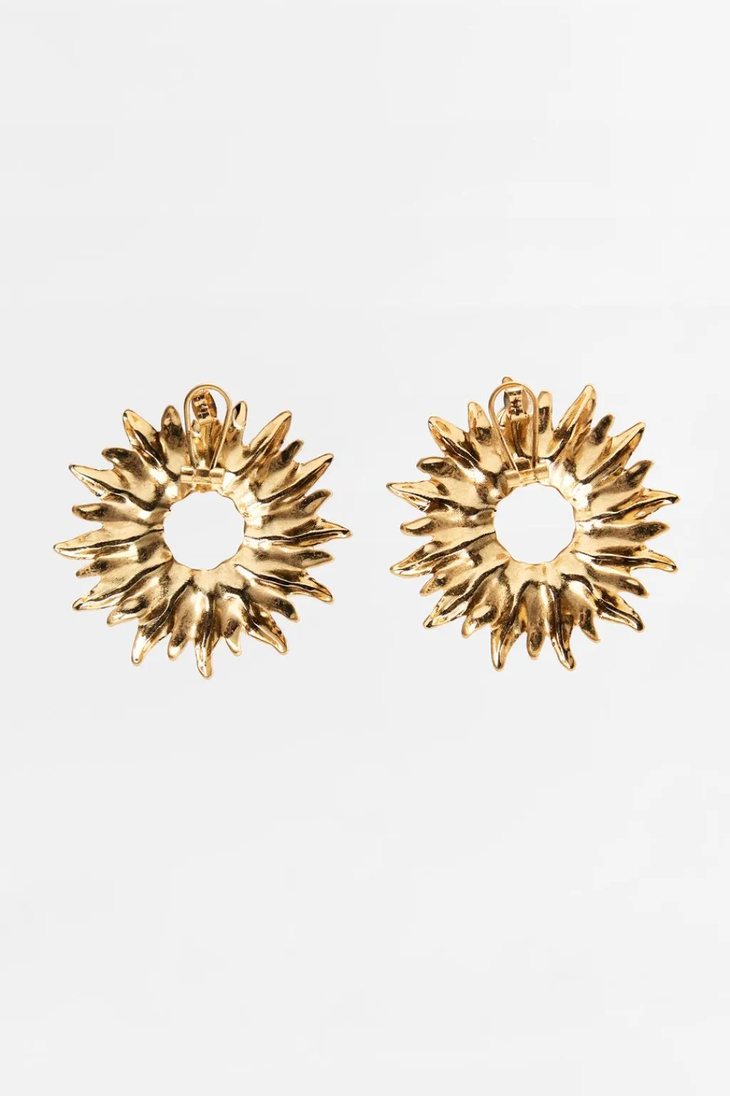 Pendientes metálicos en forma de sol en relieve. Cierre con tuerca y clip.