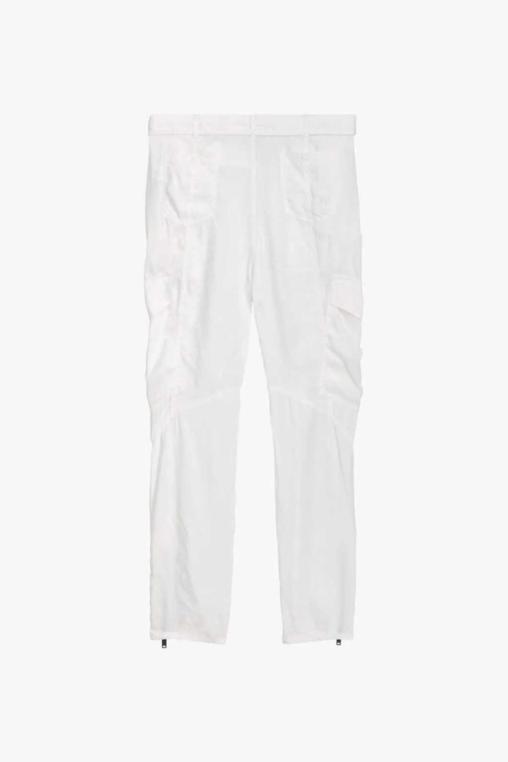 Pantalón de tiro medio confeccionado en hilatura con mezcla de lyocell y con viscosa. Cintura con trabillas. Cinturón en mismo tejido ajustable con hebilla metálica. Bolsillos delanteros, de plastrón con solapa en pierna y de plastrón en espalda. Detalle de pespuntes marcados combinados a tono. Bajo con cremalleras metálicas. Cierre frontal con cremallera y botón.