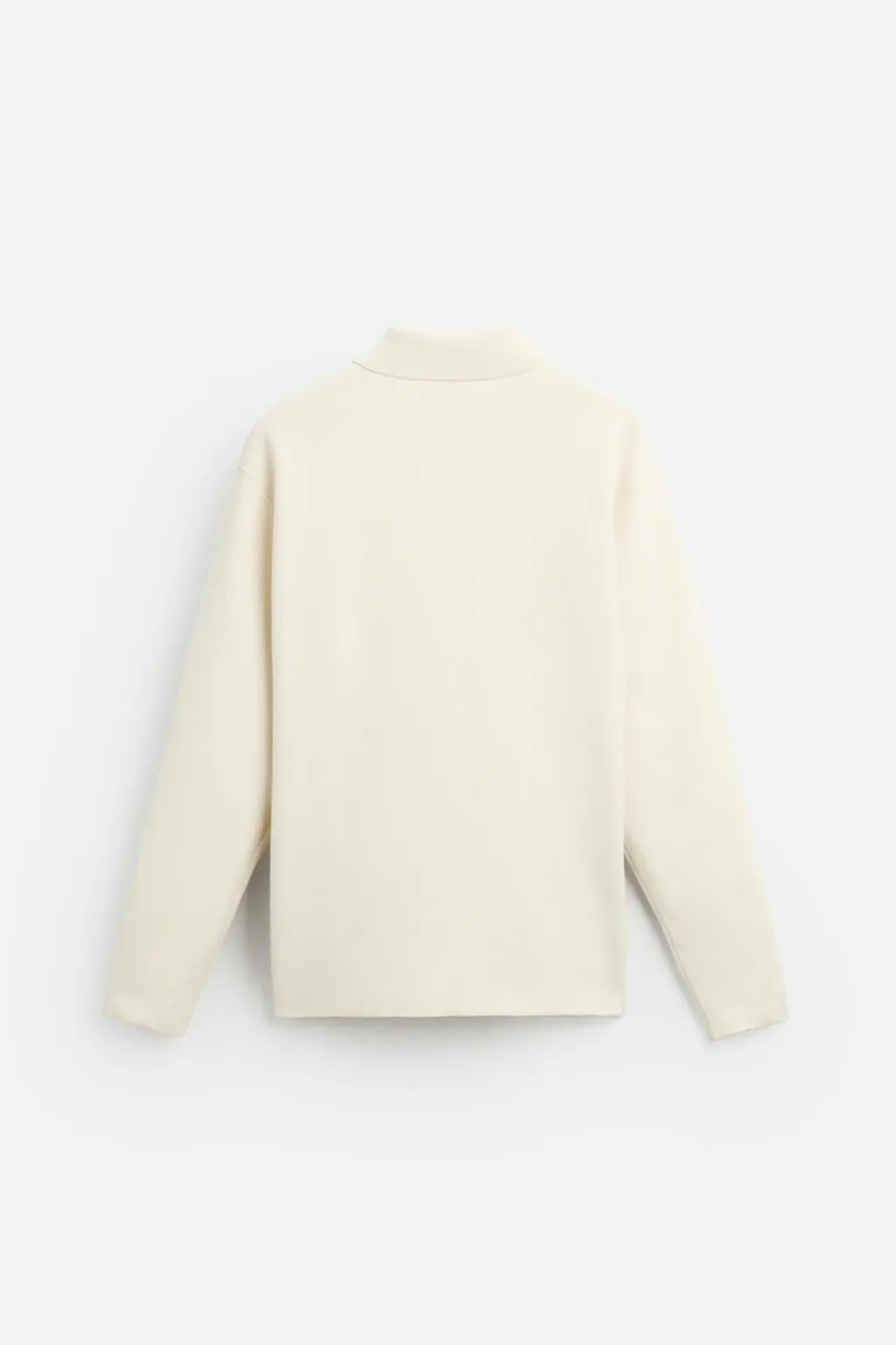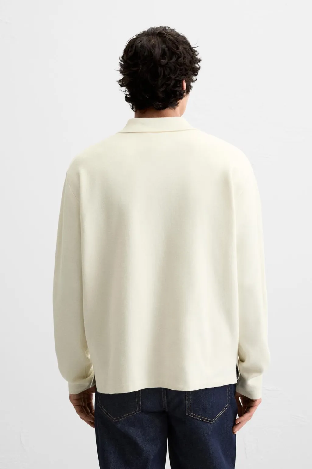 Polo de punto tejido en hilatura con mezcla de viscosa. Cuello solapa con cierre frontal de botonadura. Manga larga. Bajo con aberturas laterales. Acabados en rib.