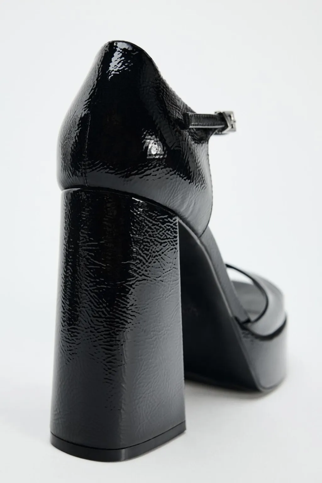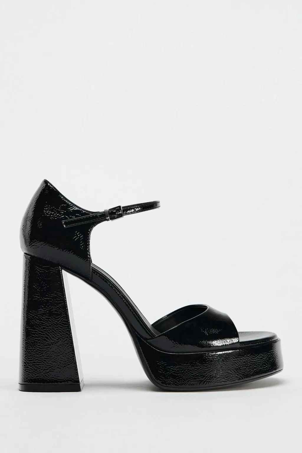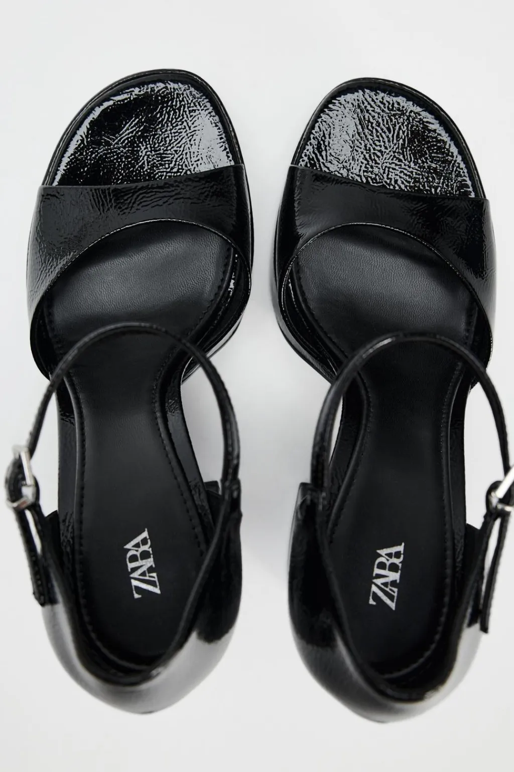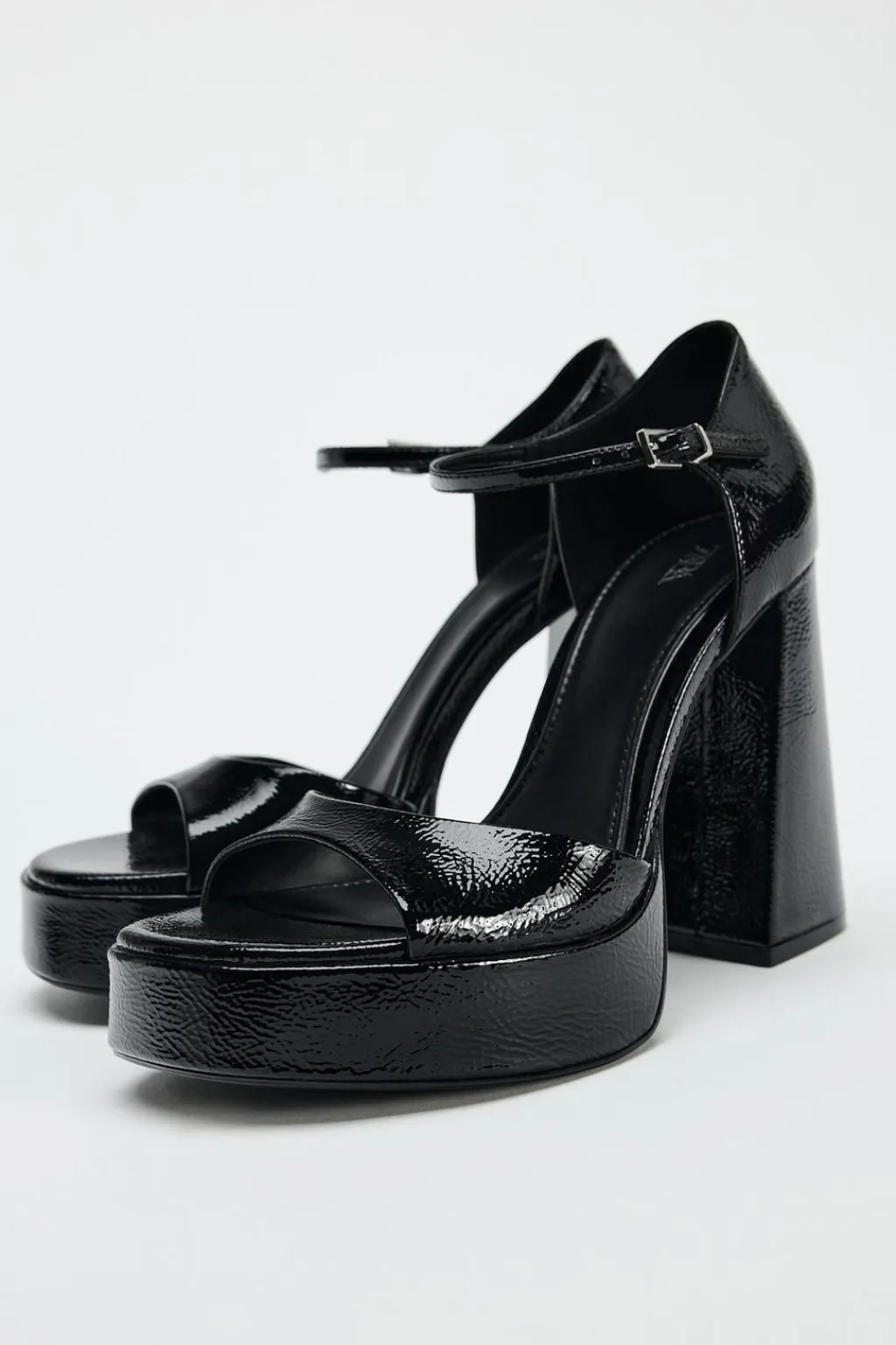 Zapato tipo sandalia de tacón alto. Tira en la parte delantera. Cierre mediante tira con hebilla en la pulsera al tobillo.