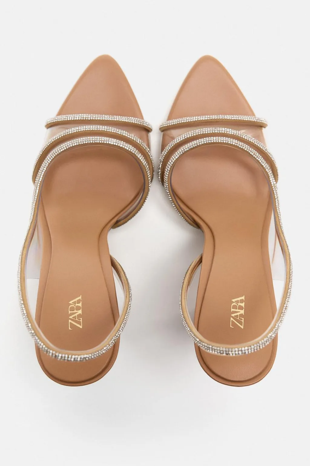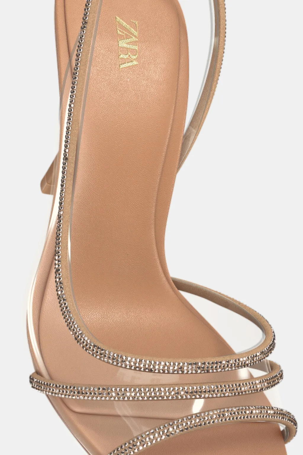 Zapato de tacón alto tipo sandalia en vinilo con detalle de brillos. Acabado en punta. Tira trasera.