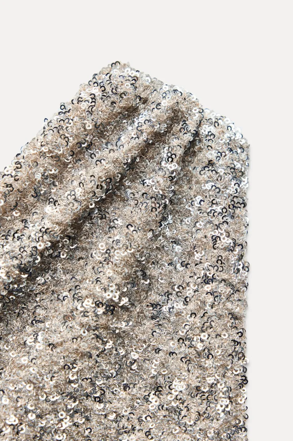 Top de escote asimétrico y manga sisa con detalle de frunces. Aplicación lentejuelas. Forro interior combinado.