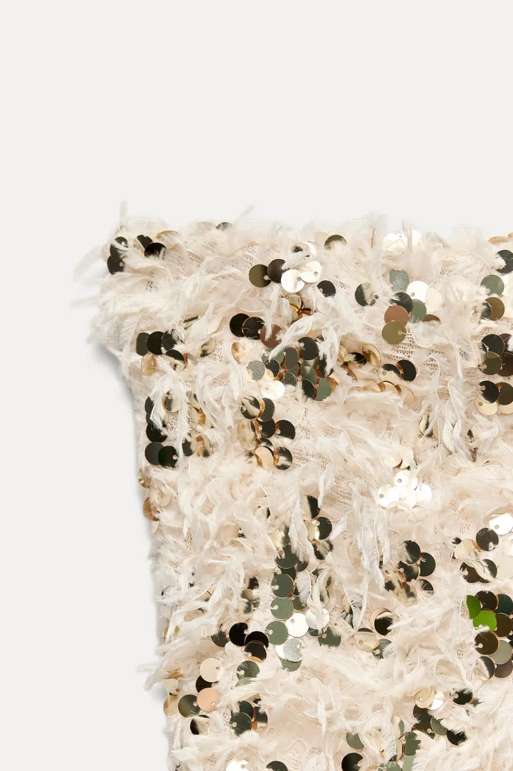 Top corto de escote recto y elástico. Detalle de tejido desflecado y aplicación de lentejuelas.