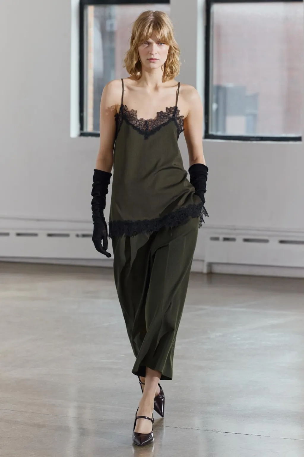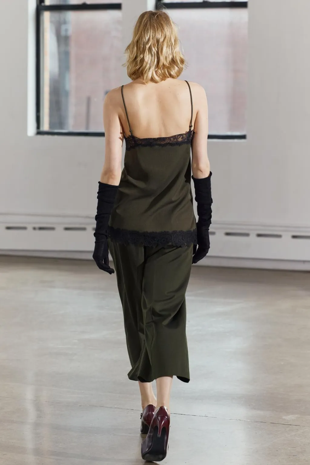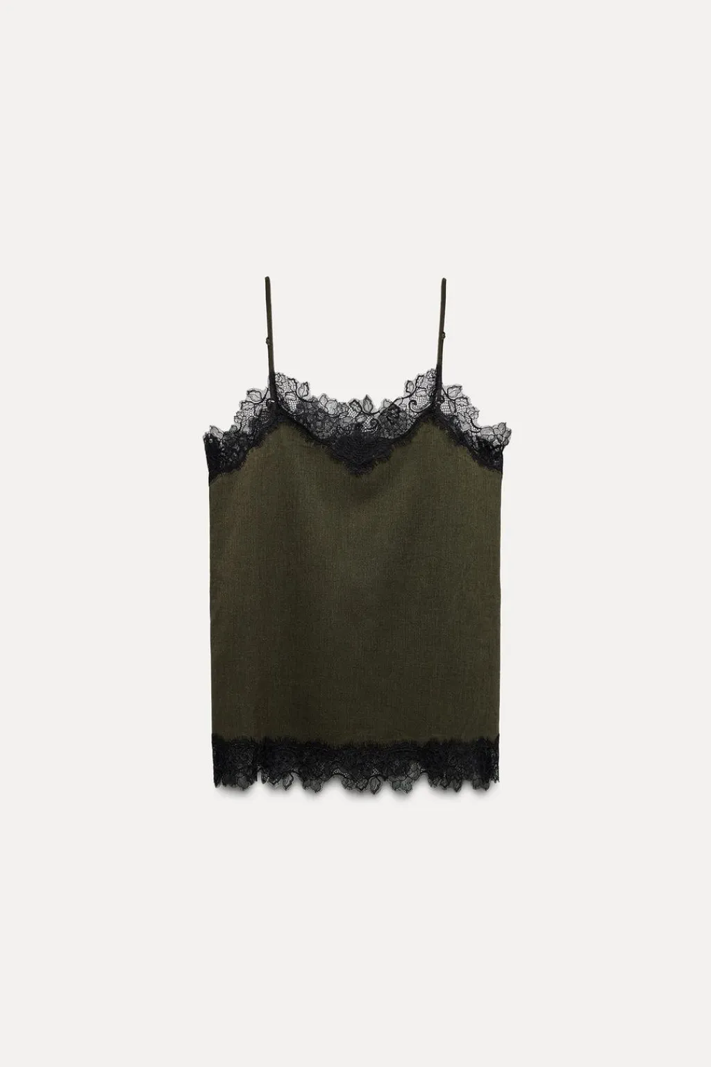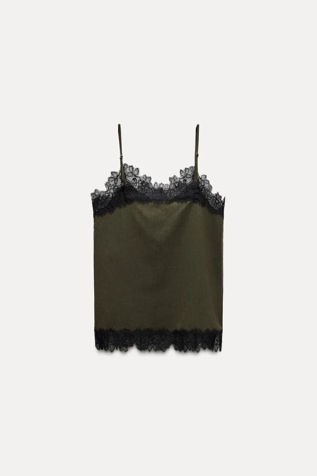 Top confeccionado en hilatura con lana 21%. Escote pico y tirantes finos. Detalle de aplicación de encaje a contraste.