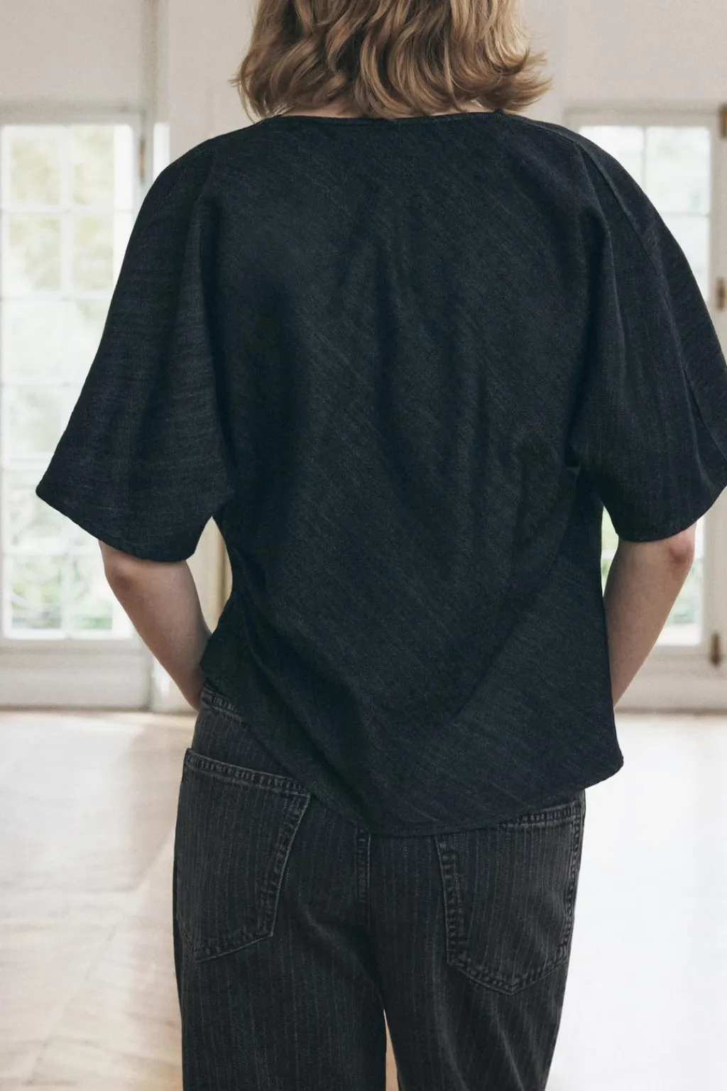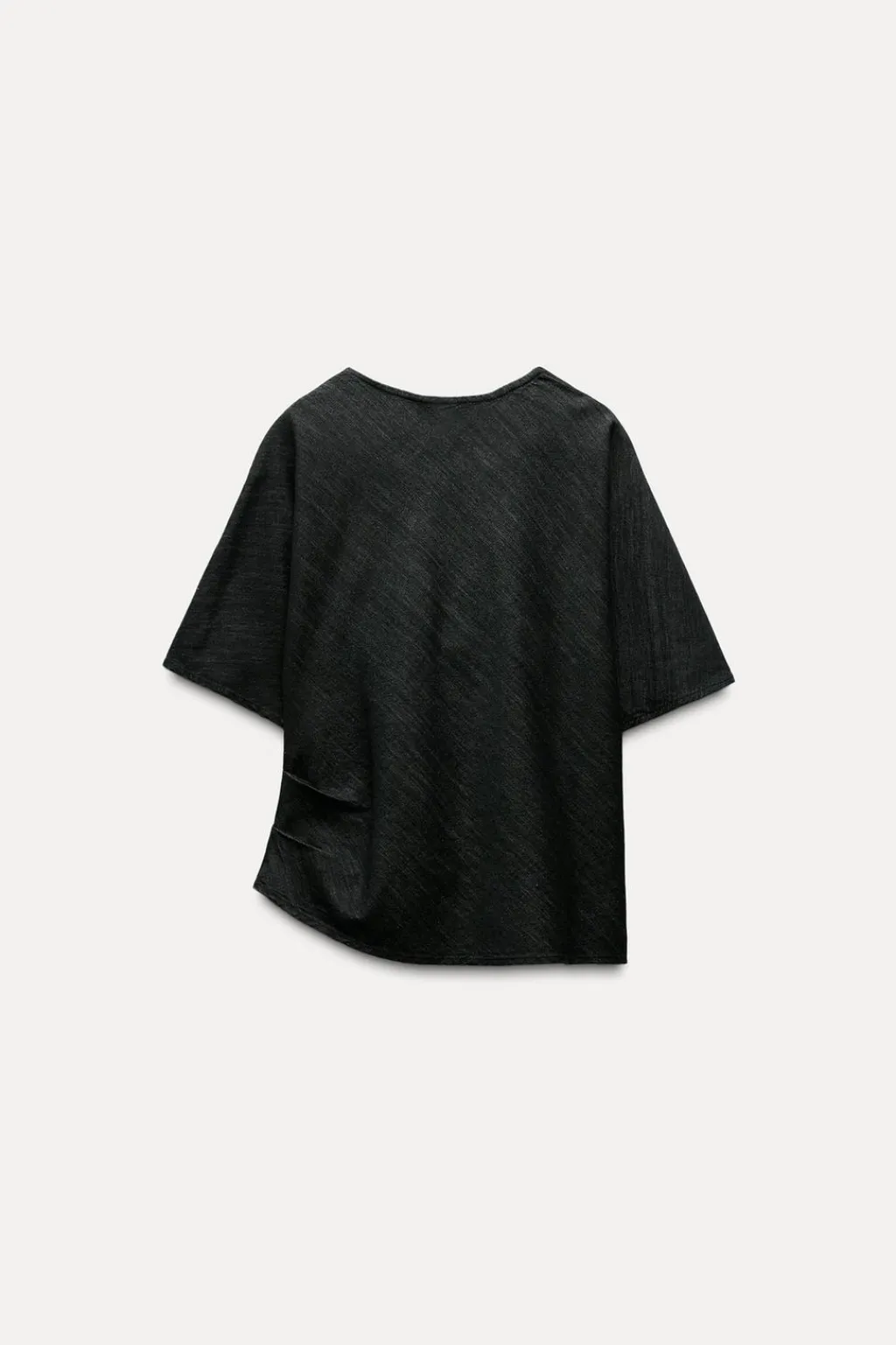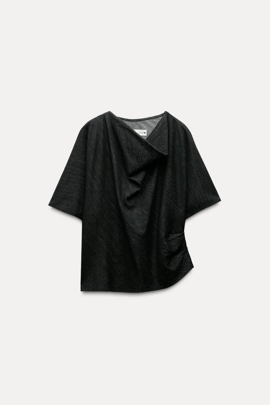 Top de cuello fluido y manga corta. Detalle de tejido drapeado. Bajo asimétrico.