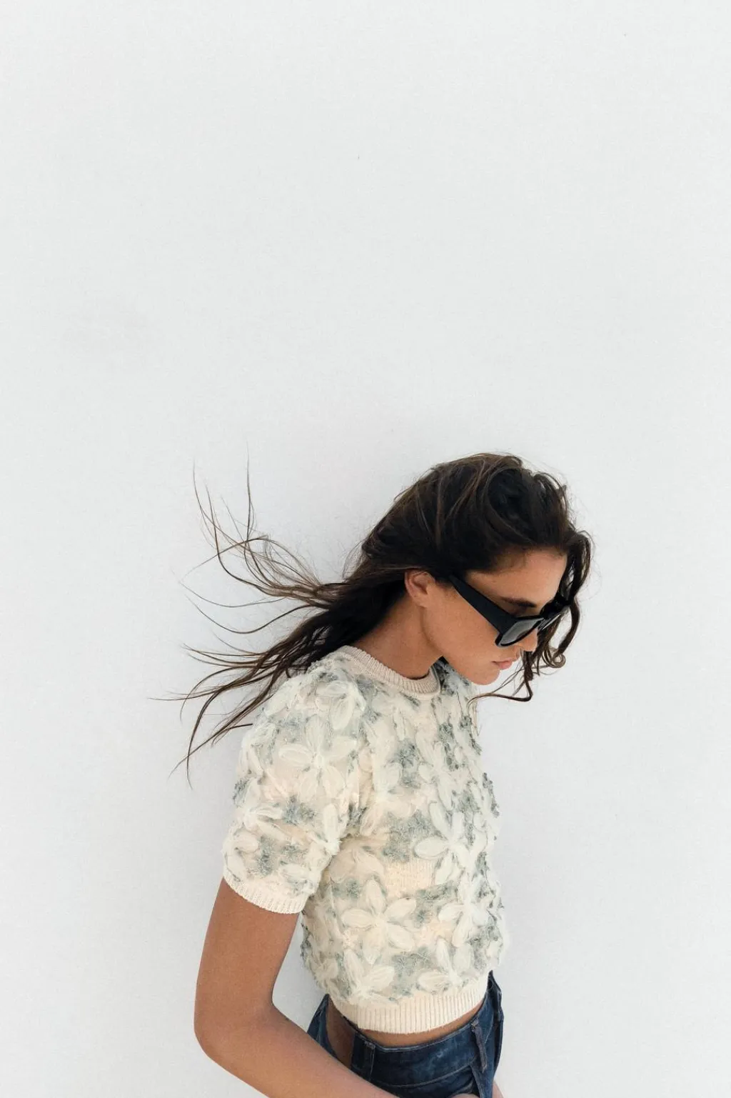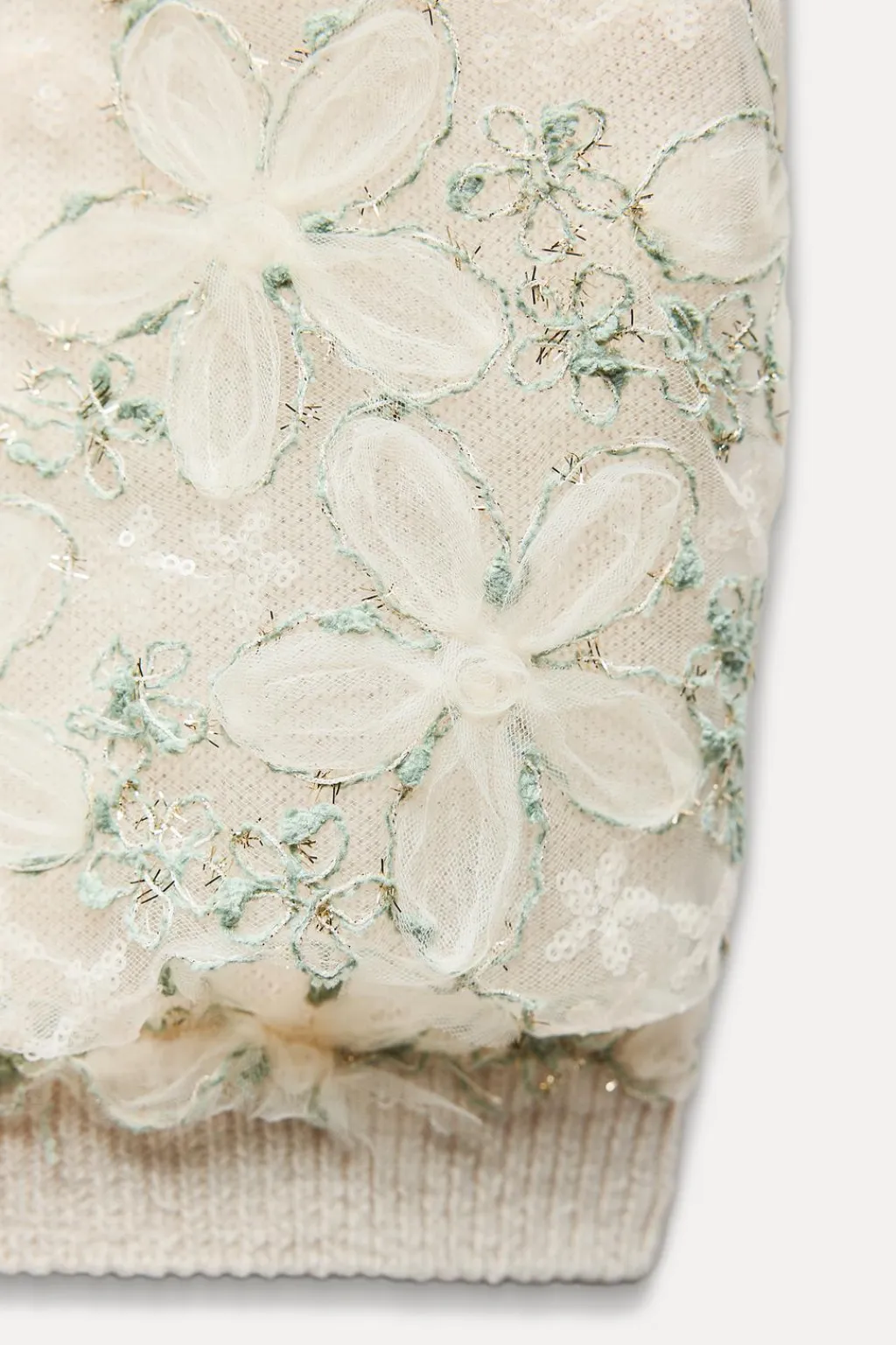 Top de cuello redondo y manga corta abullonada. Detalle de tejido combinado semitransparente con aplicación de lentejuelas y bordados a contraste.