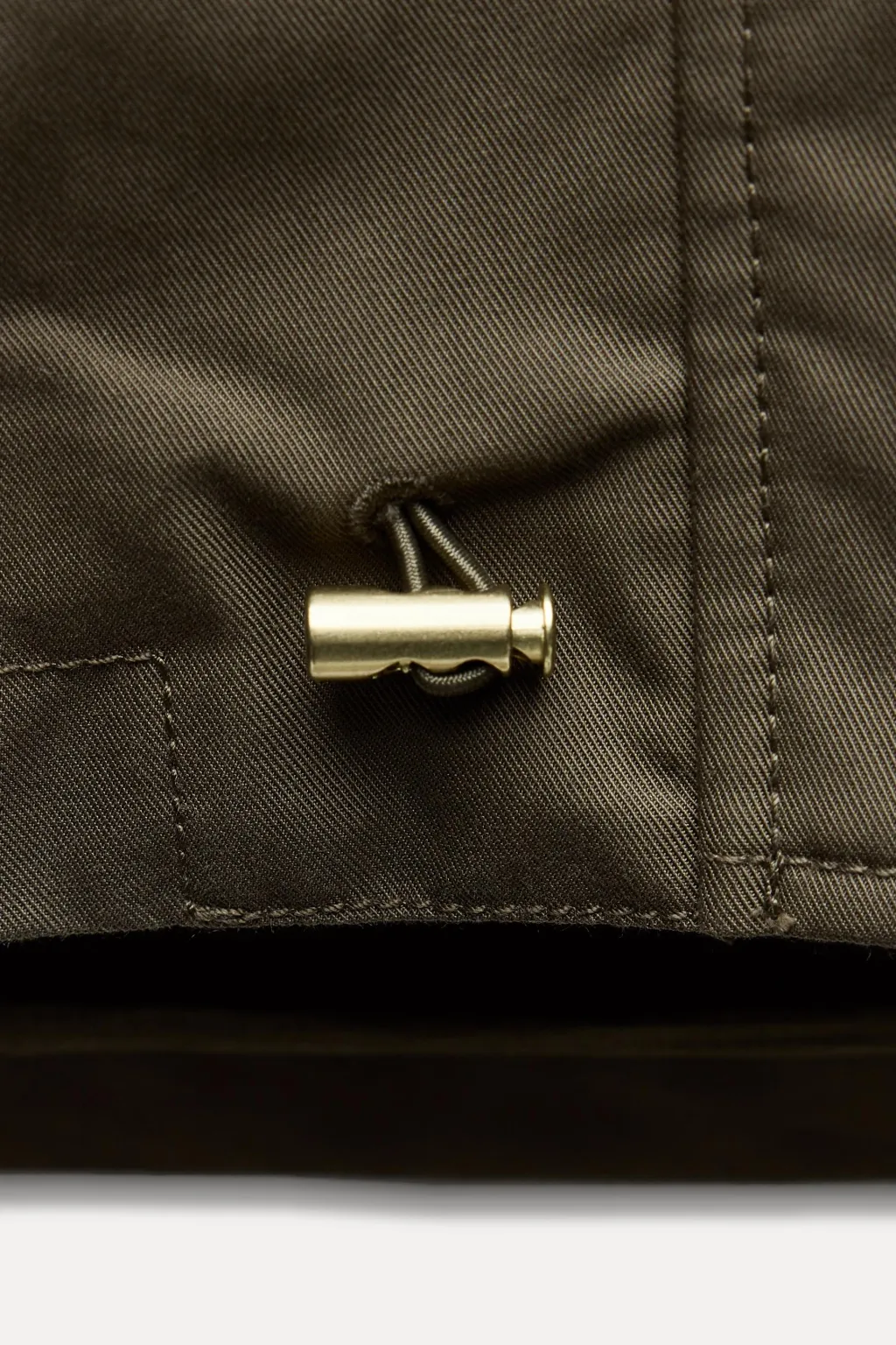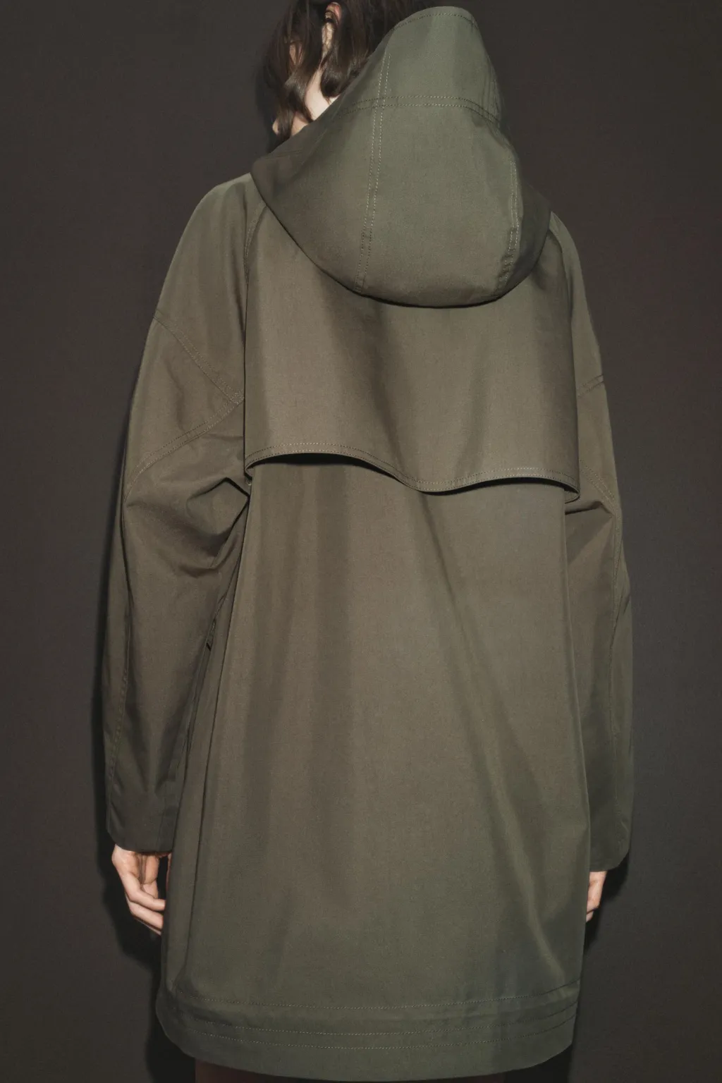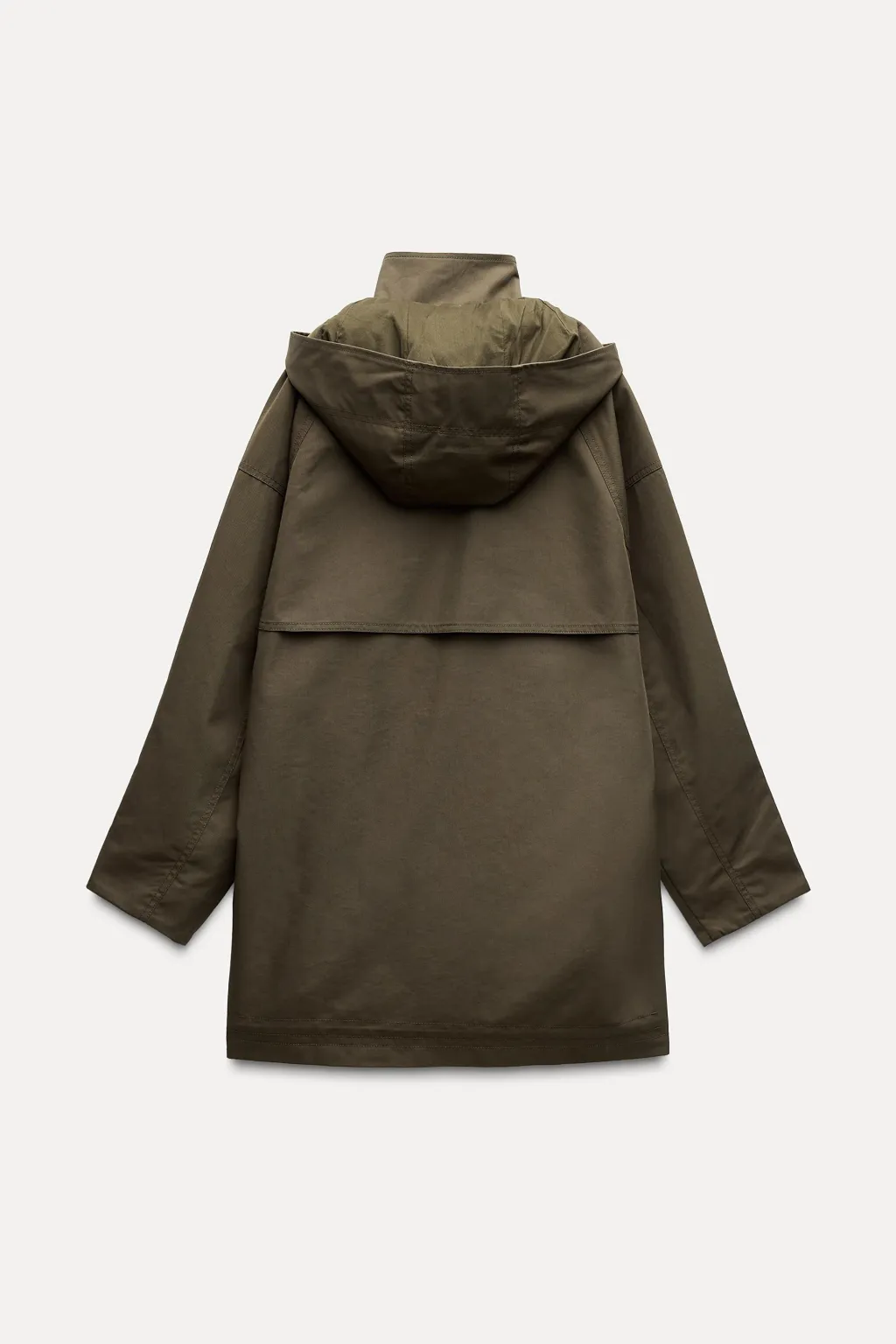 Trench de cuello alto y capucha extraíble con botones. Manga larga. Bolsillos con solapa en delantero. Detalle de pespuntes marcados a tono. Bajo ajustable con cordón elástico y stopper. Cierre frontal con cremallera metálica oculta por solapa y botones.