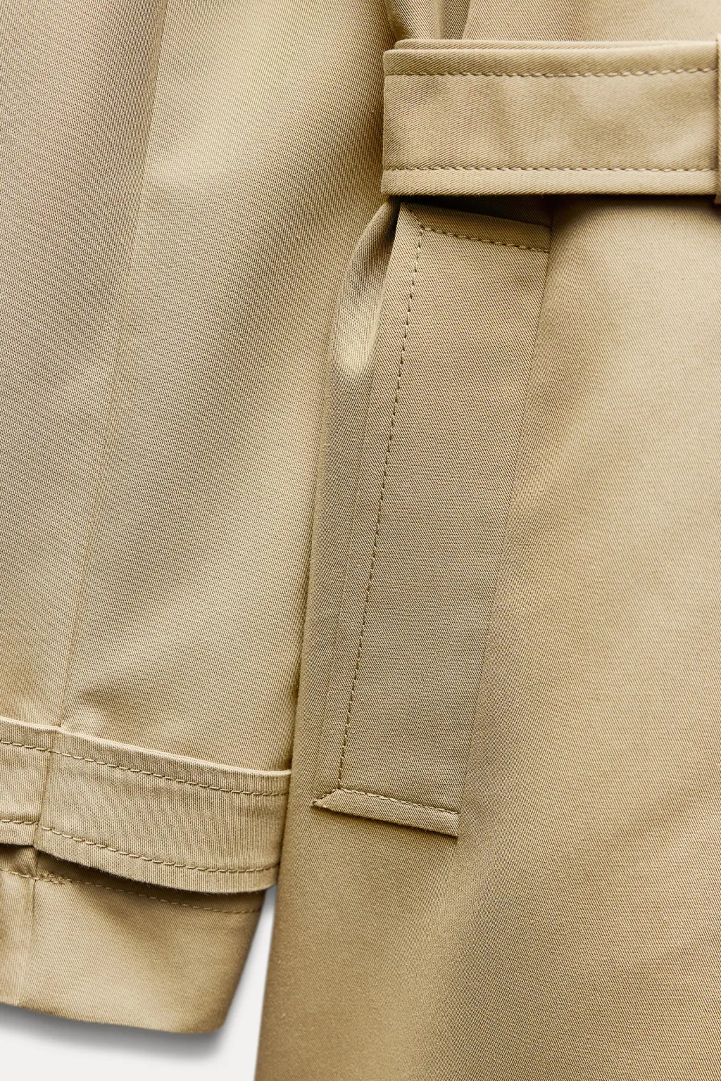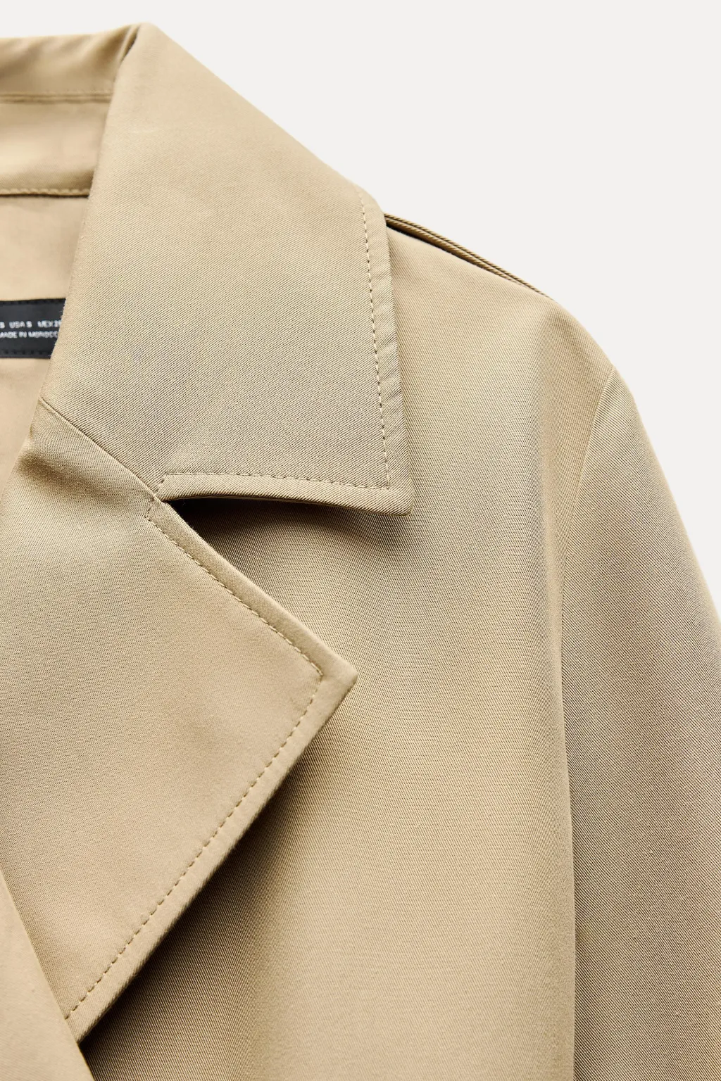 Trench de cuello solapa y manga larga con trabillas y botón. Bolsillos en delantero. Detalle de cinturón en mismo tejido. Cierre frontal cruzado con botones.