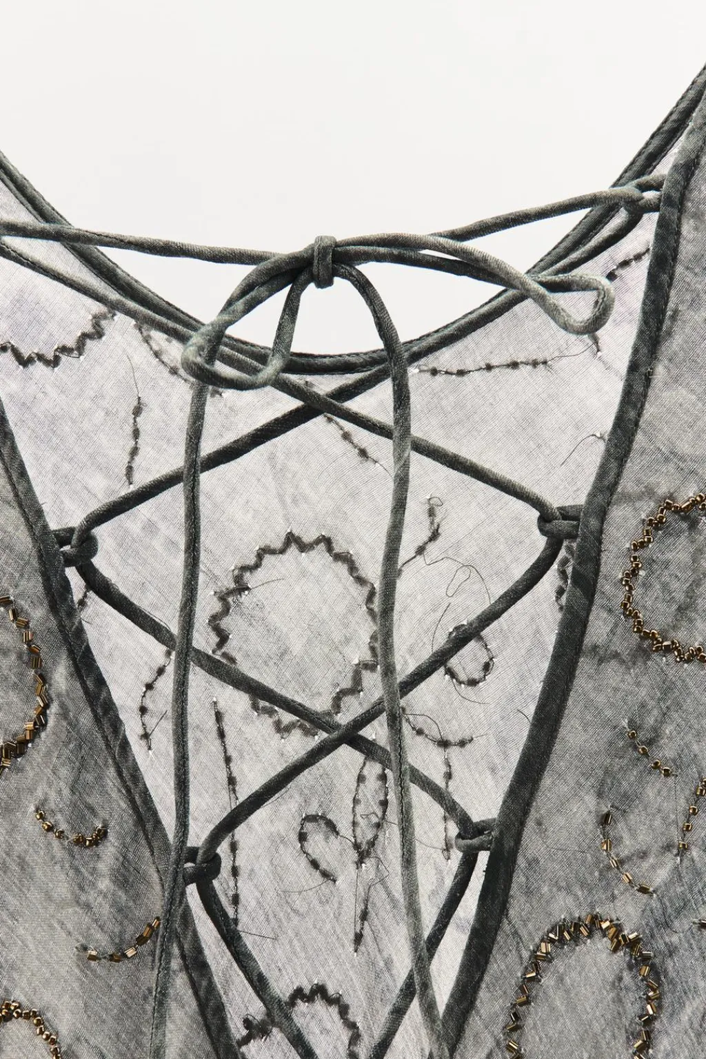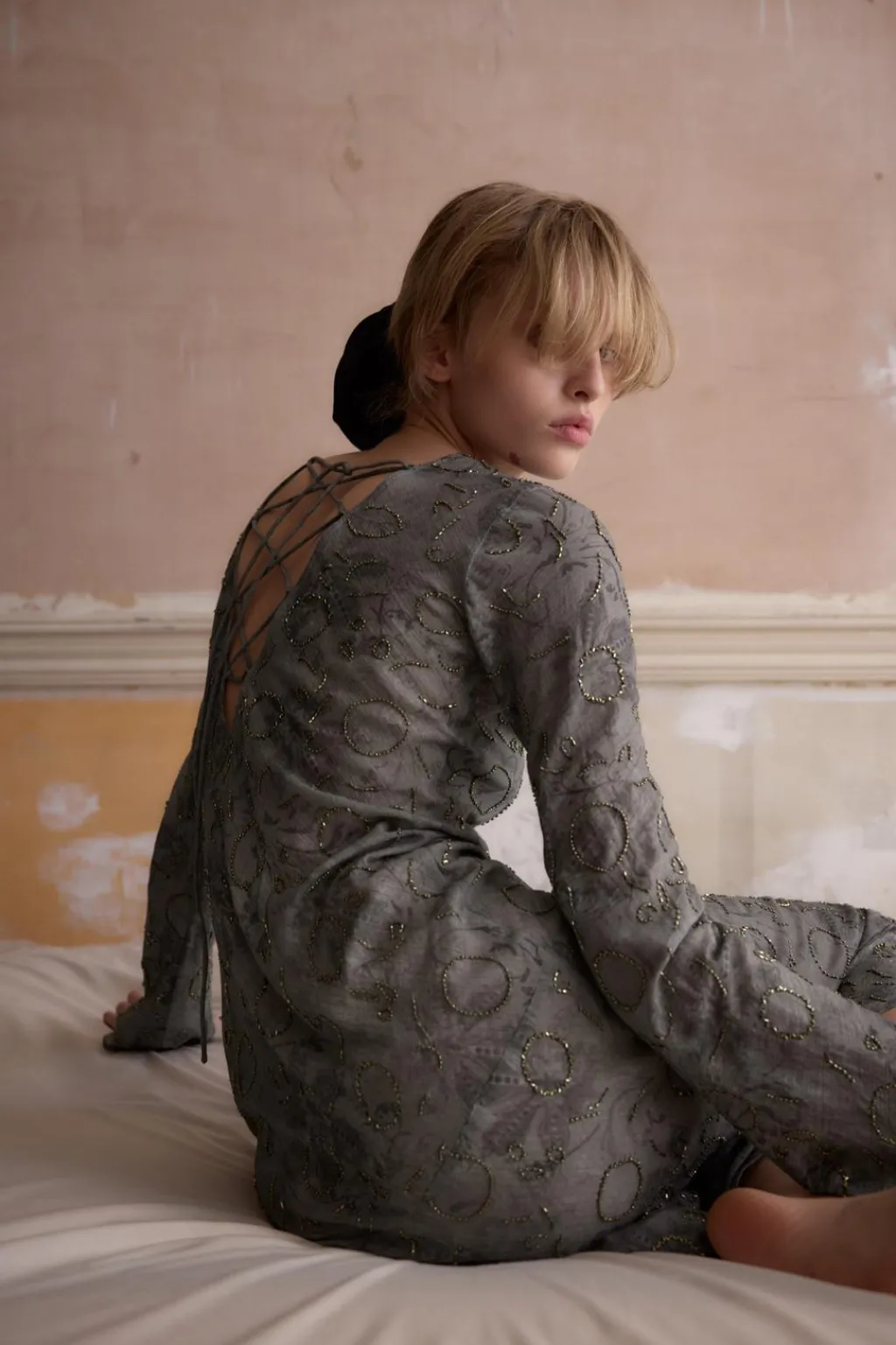 Vestido largo de cuello redondo y manga larga acabada en línea evasé. Detalle aplicación de abalorios combinados a contraste. Espalda descubierta con tiras cruzadas y ajustables con lazada.