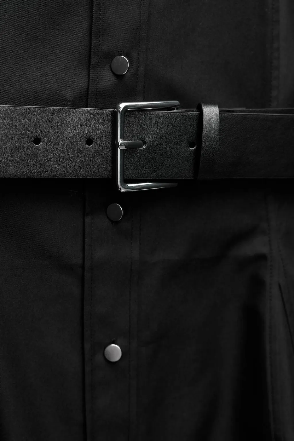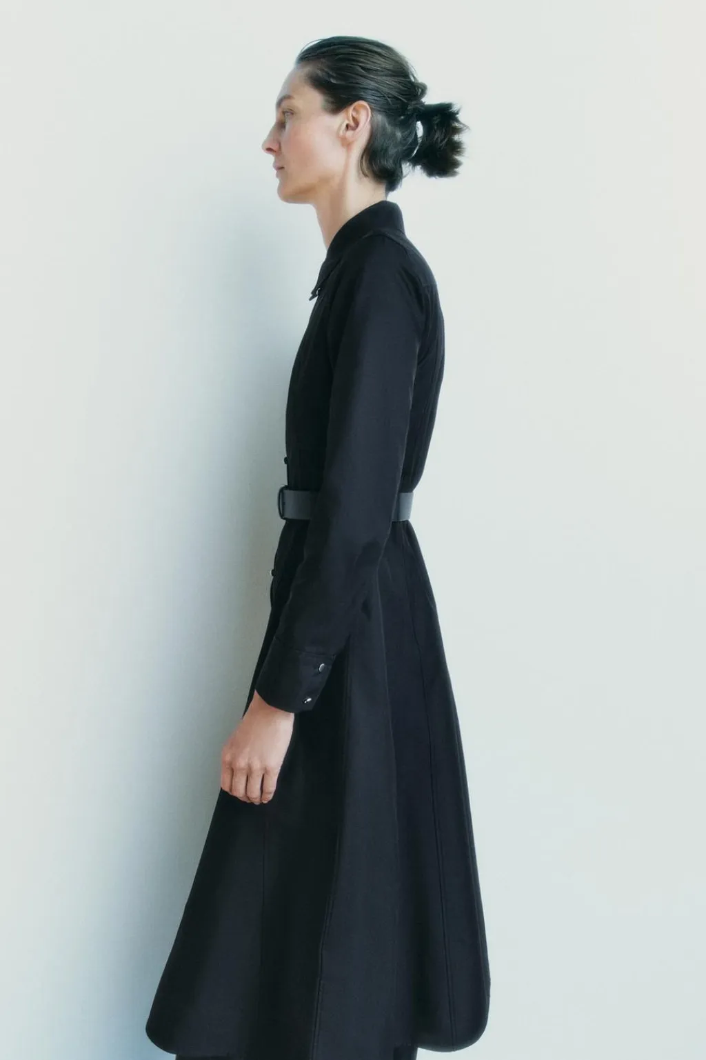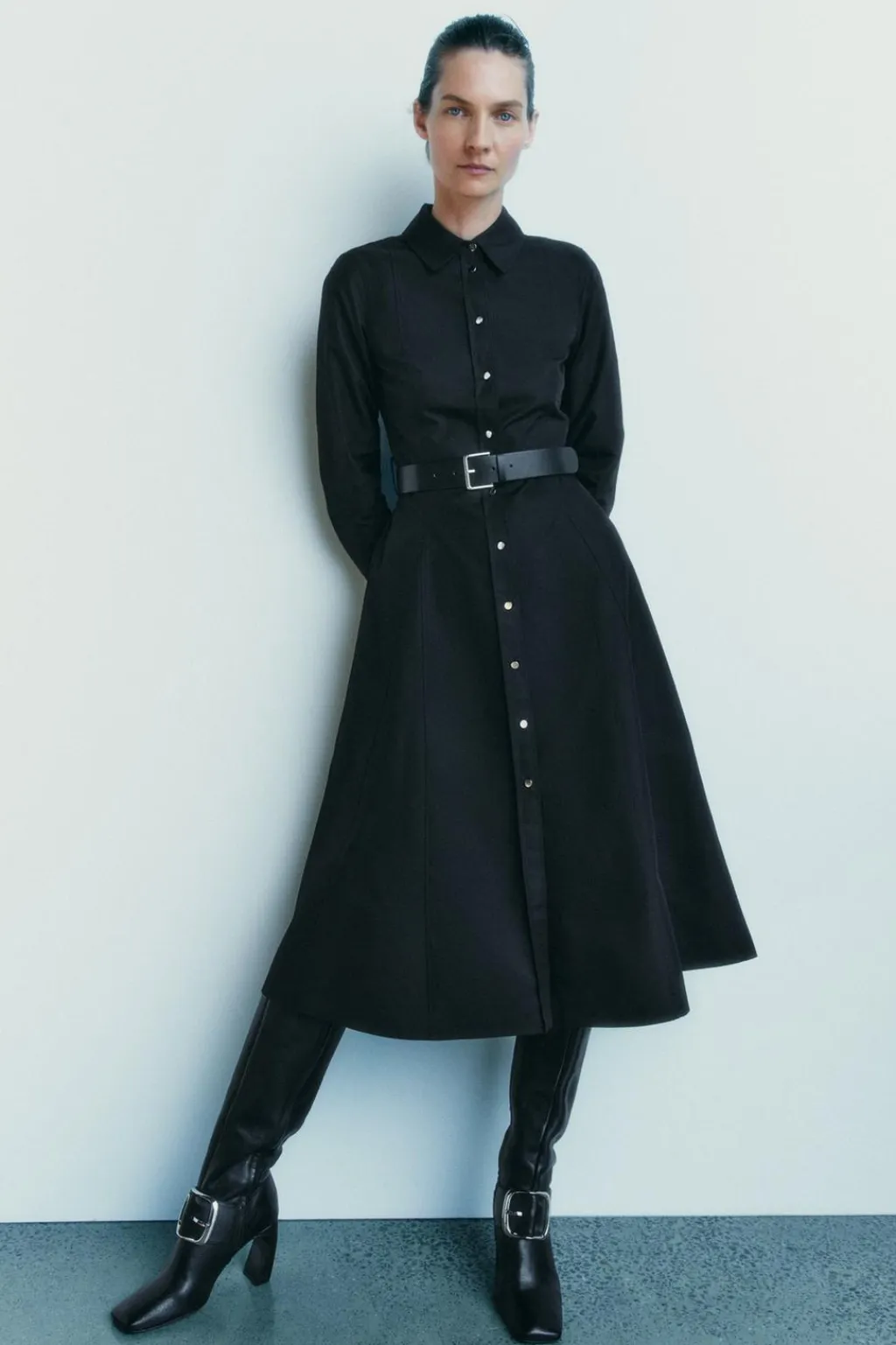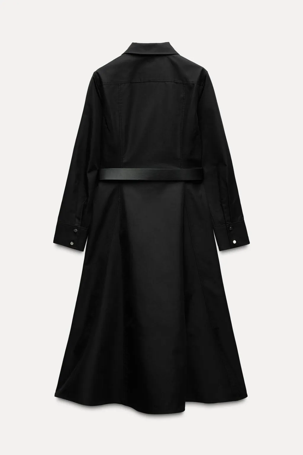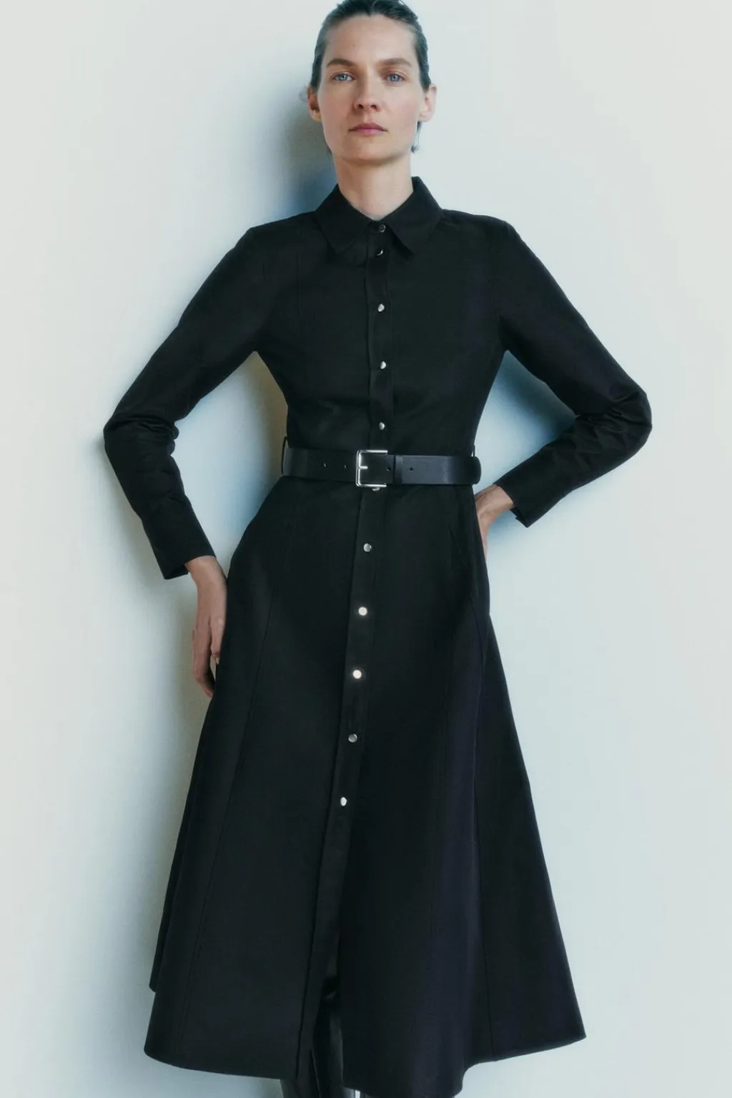 Vestido midi confeccionado en hilatura con mezcla de algodón. Cuello solapa y manga larga acabada en puño. Cinturón a tono ajustable con hebilla metálica. Cierre frontal con botones.