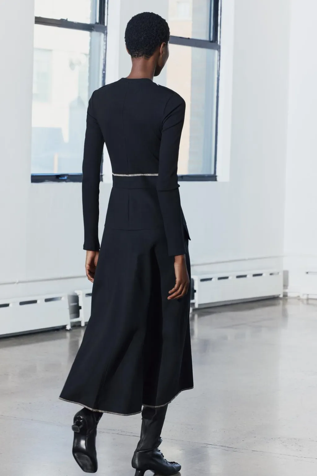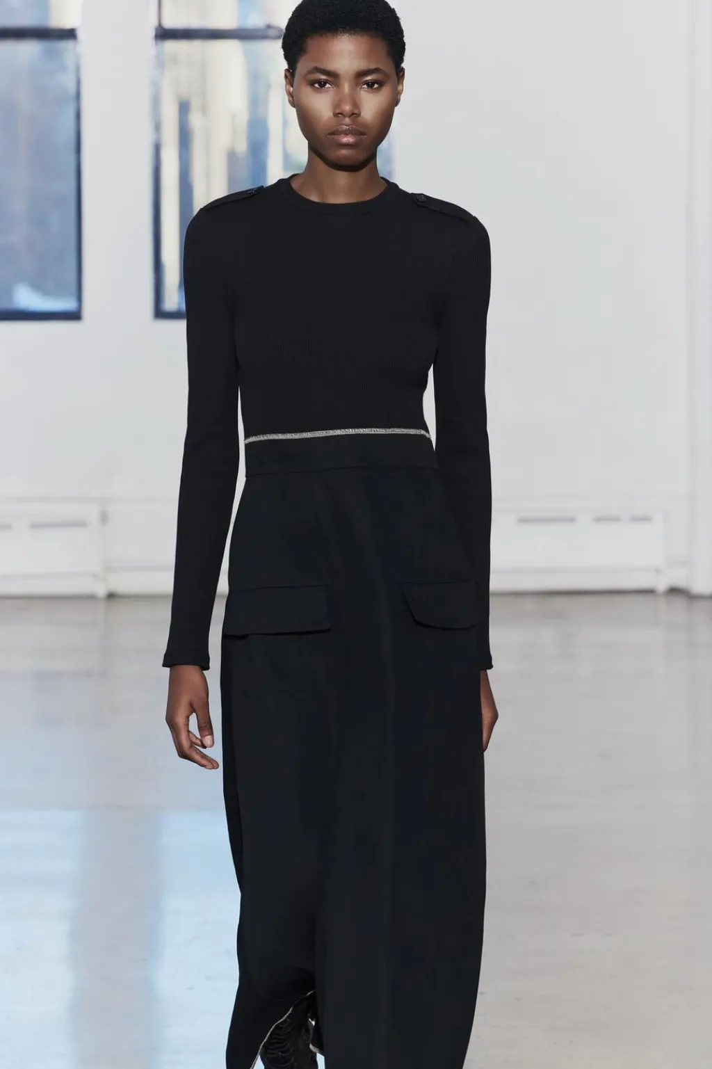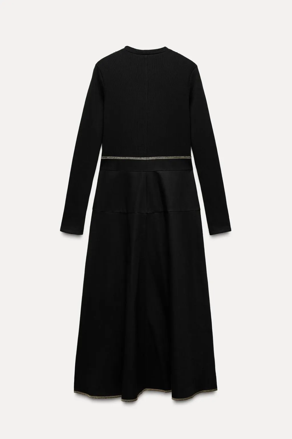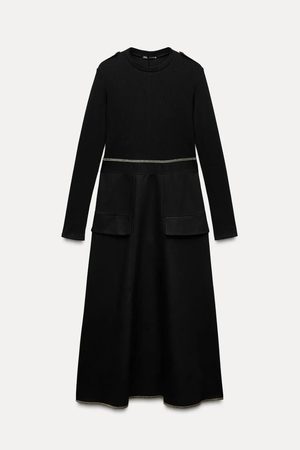 Vestido midi de cuello redondo y manga larga con trabillas en hombros. Bolsillos en delantero. Detalle de combinación de tejidos a tono y pespuntes a contraste.
