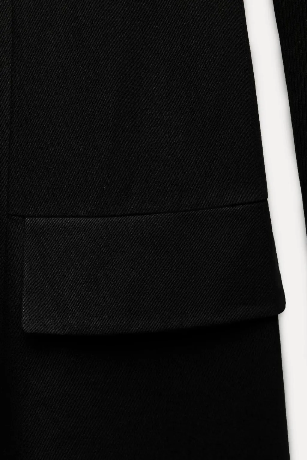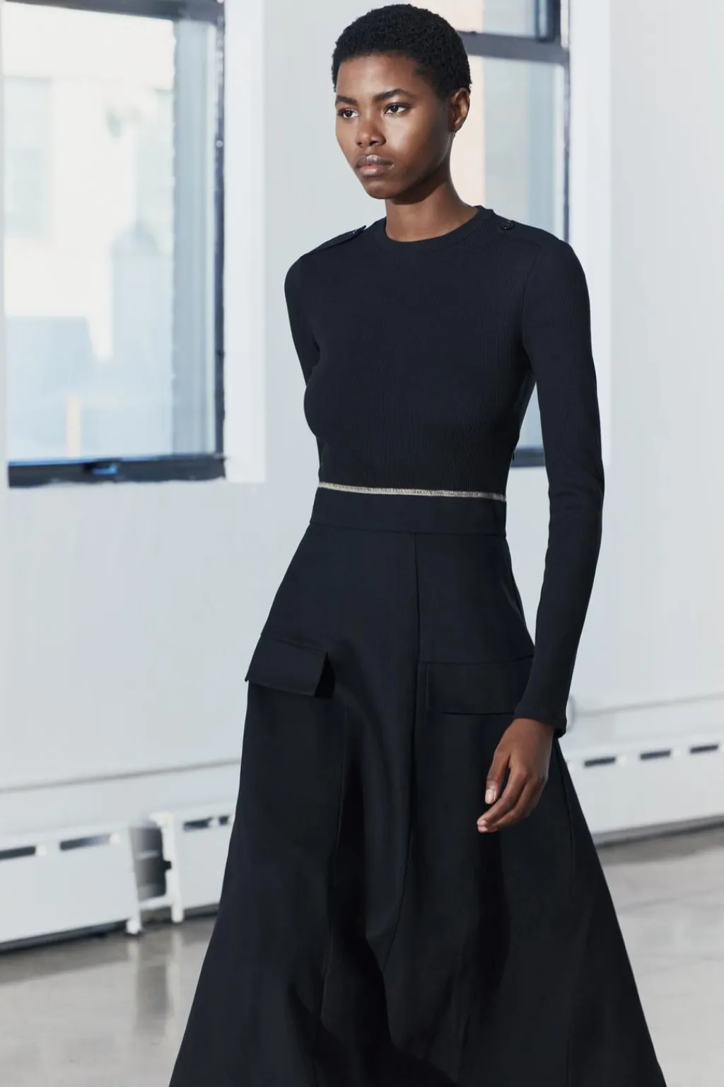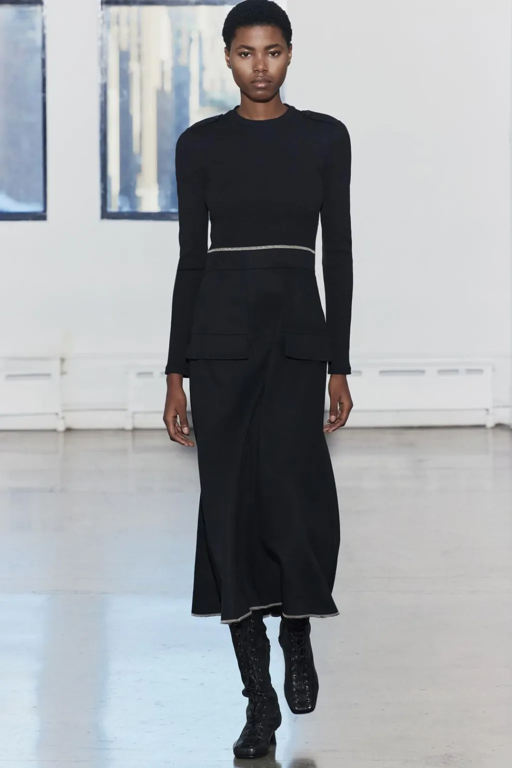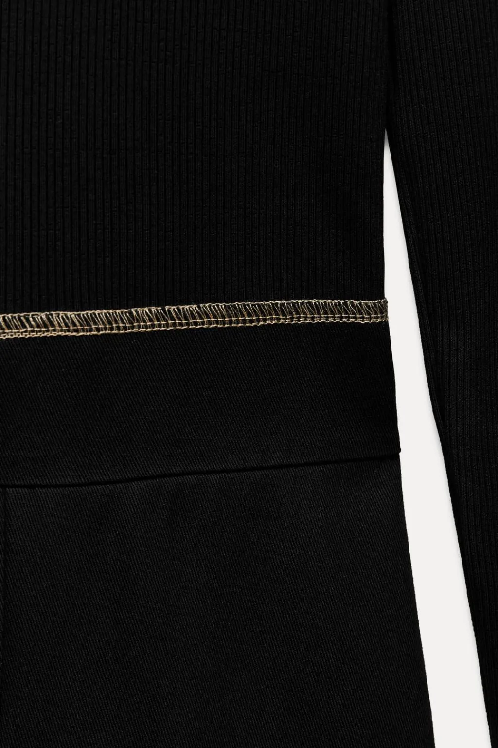 Vestido midi de cuello redondo y manga larga con trabillas en hombros. Bolsillos en delantero. Detalle de combinación de tejidos a tono y pespuntes a contraste.