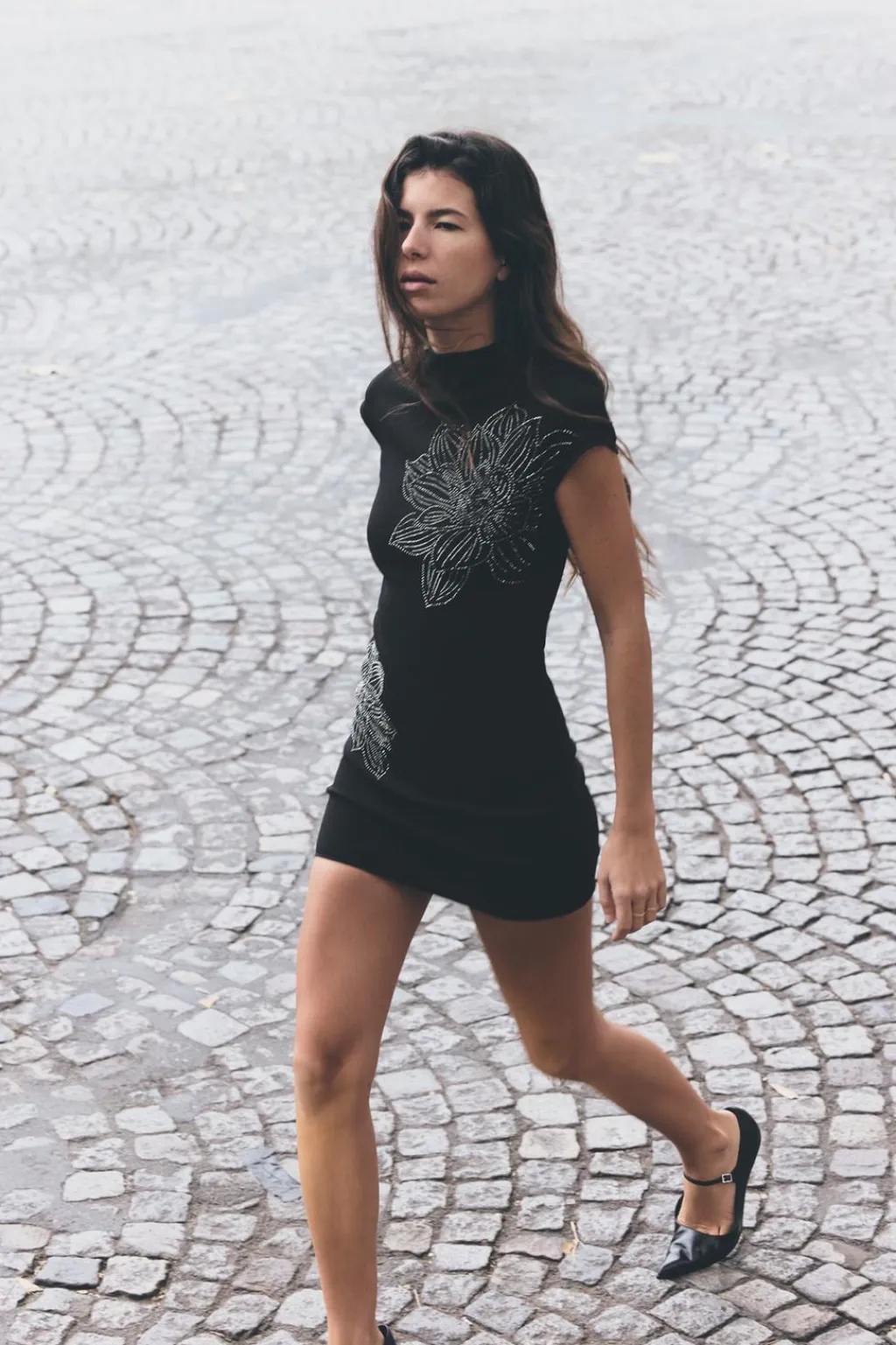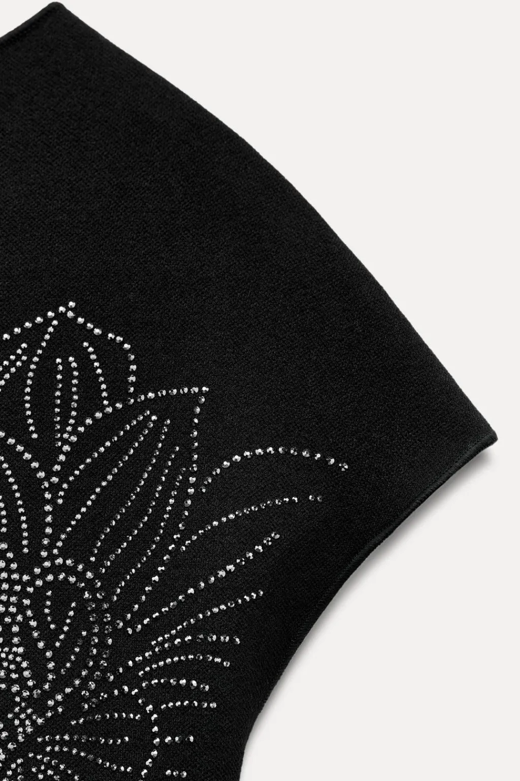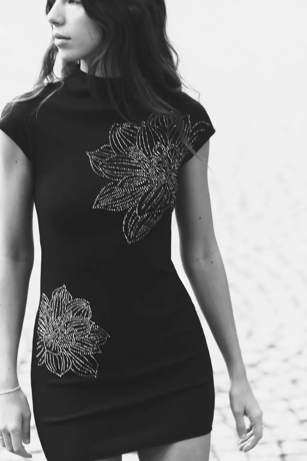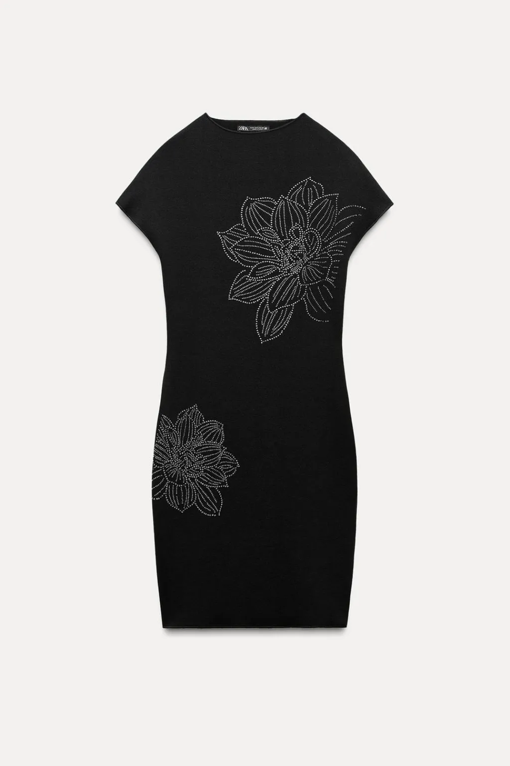 Vestido corto confeccionado en tejido tipo punto. Cuello perkins y manga corta. Detalle de aplicación de brillos en delantero.
