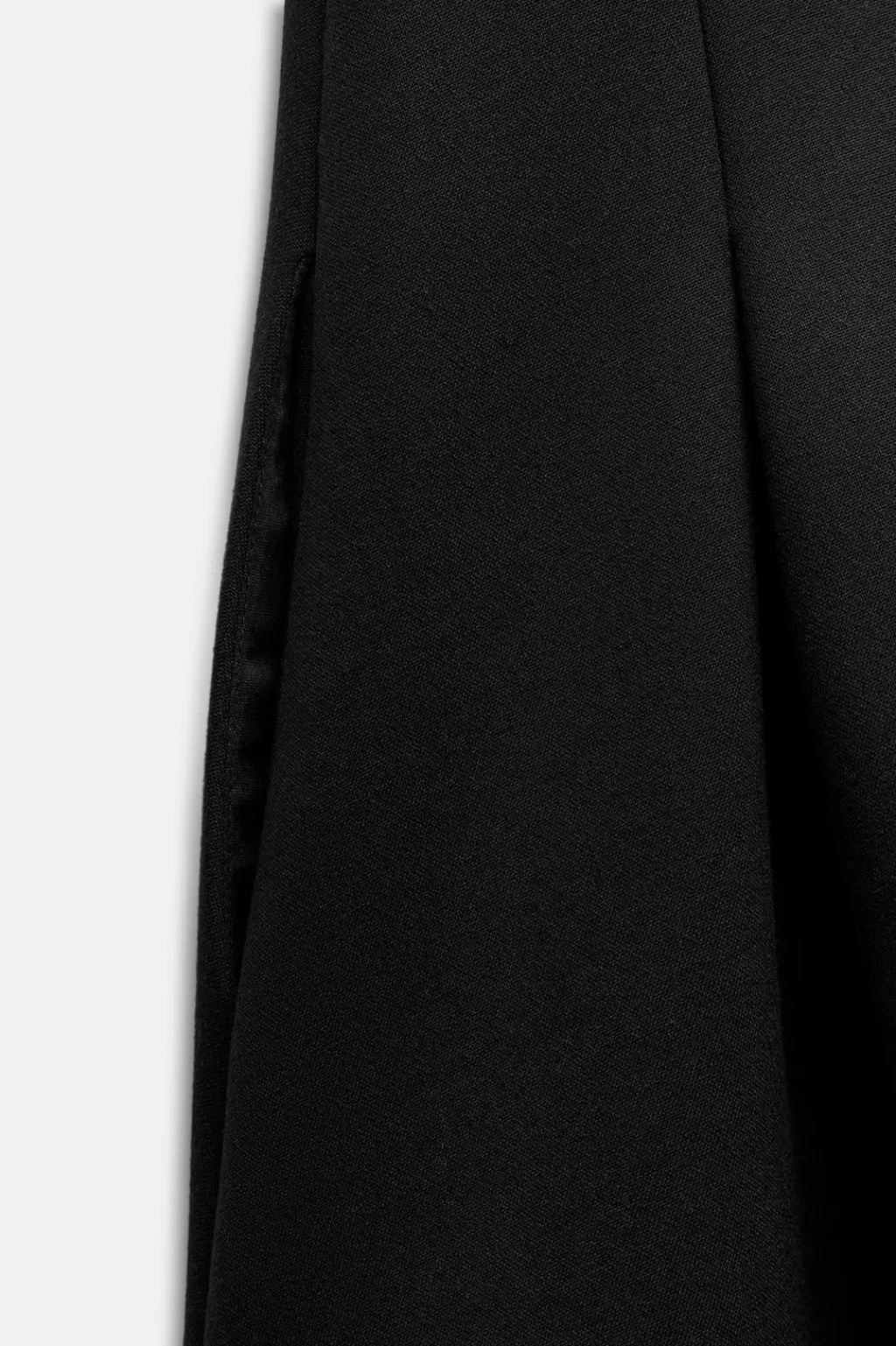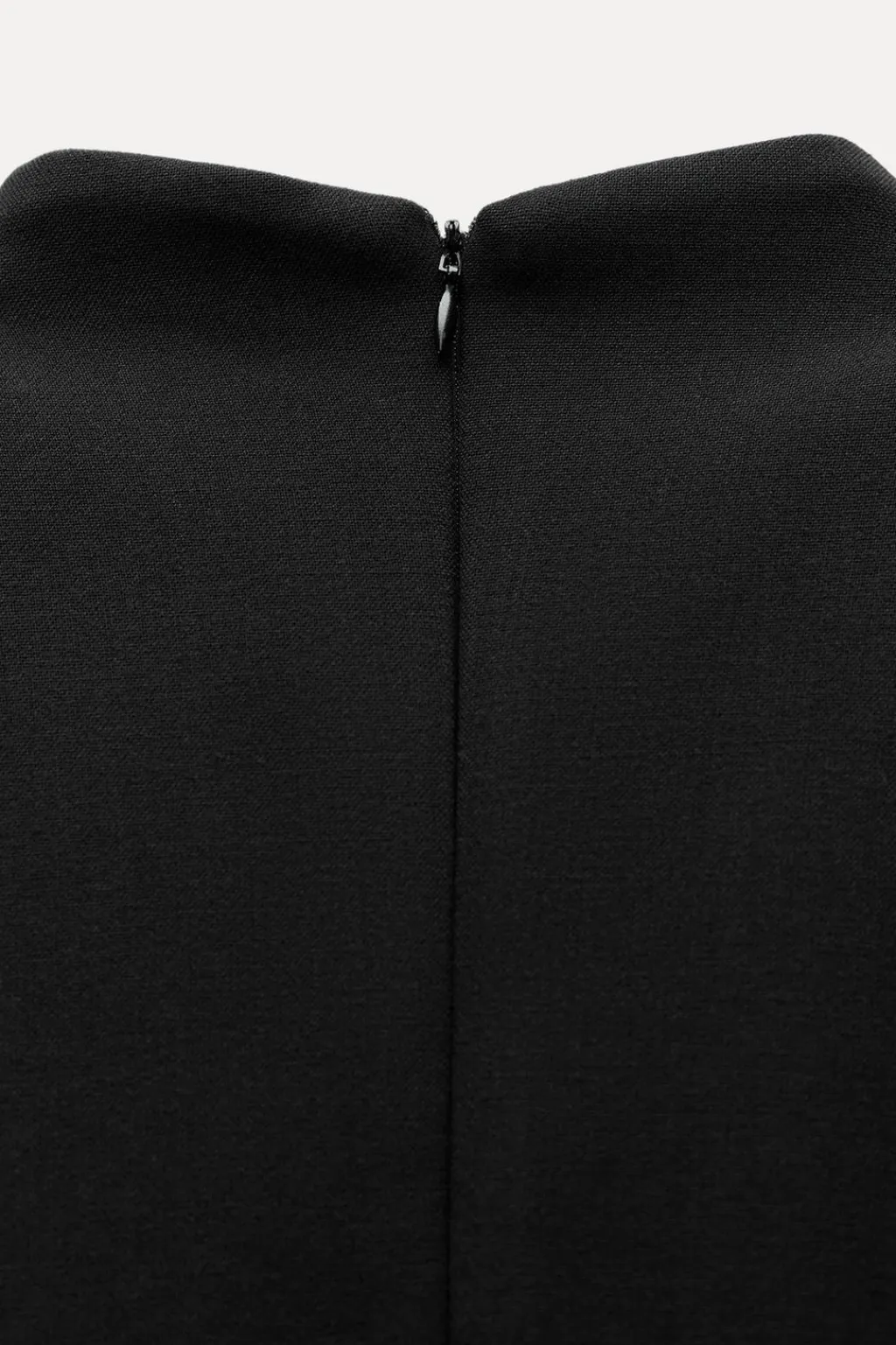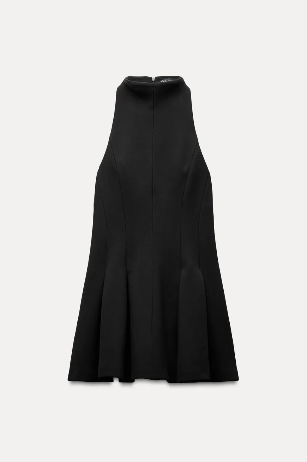 Vestido corto de cuello subido y manga sisa. Bajo acabado en godets. Cierre en espalda con cremallera oculta en costura.