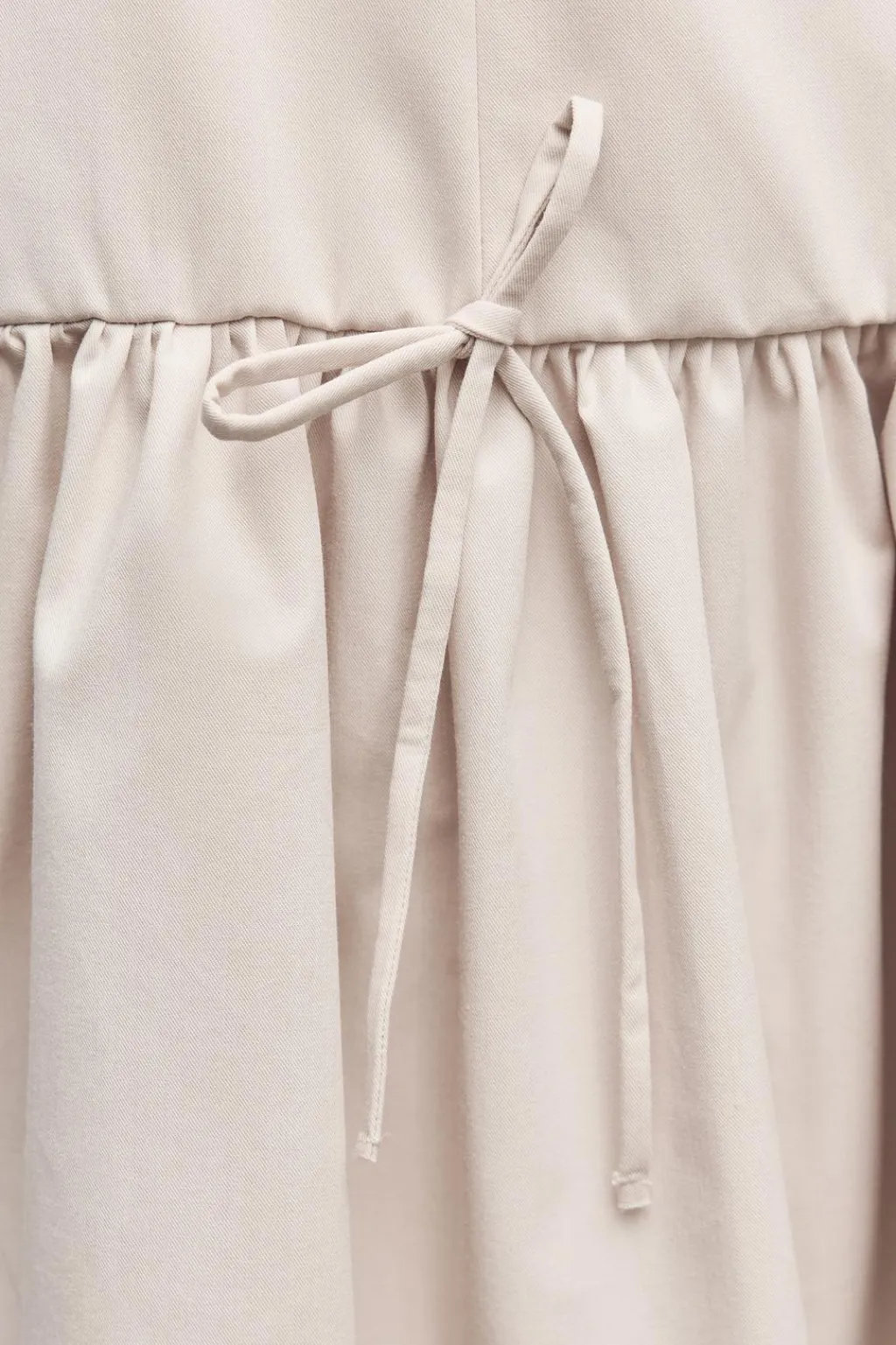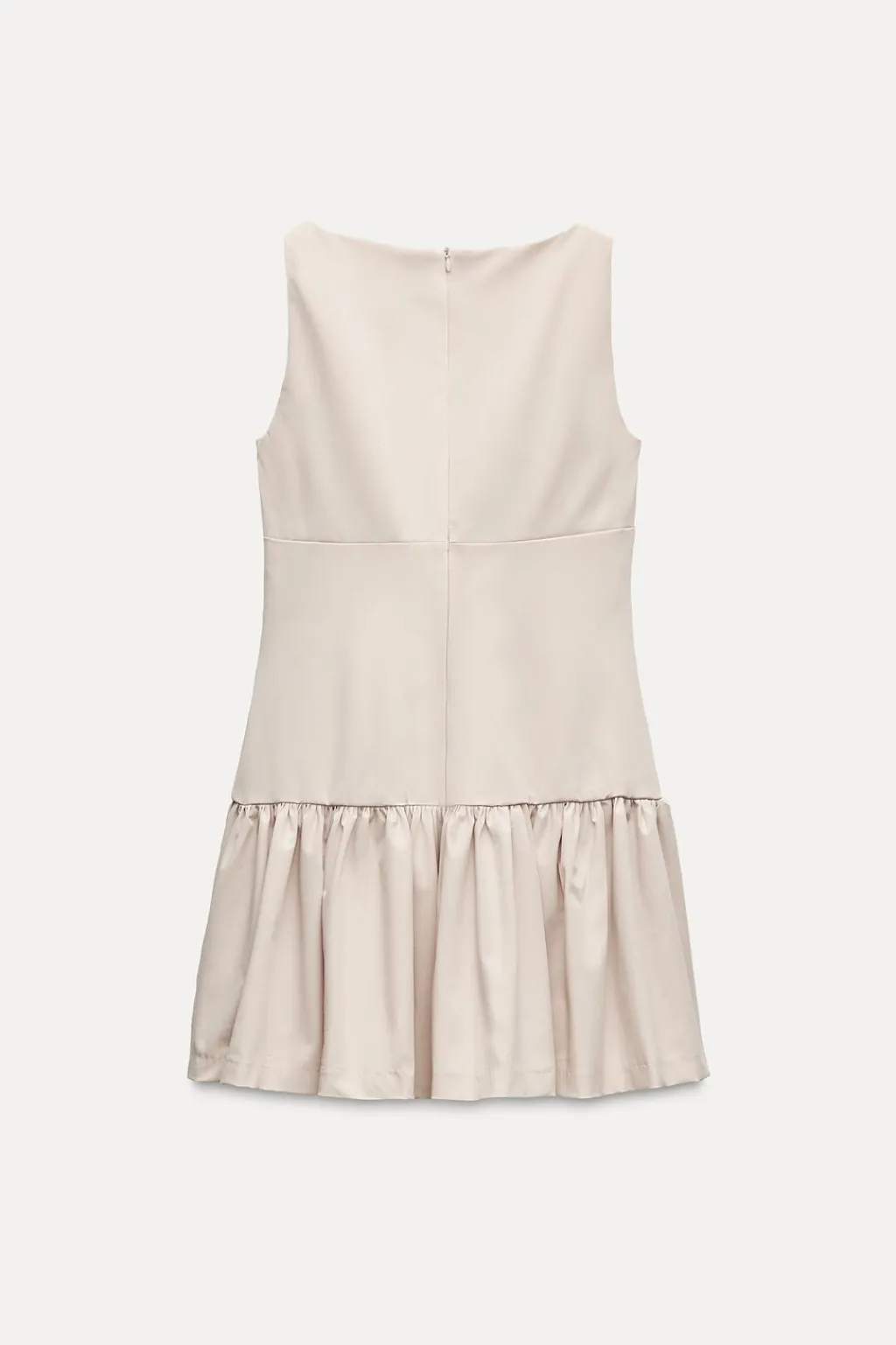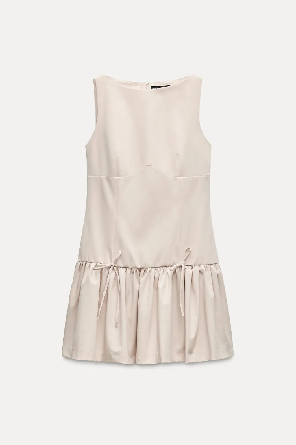 Vestido de cuello redondo y manga sisa. Bajo abullonado con lazos delanteros. Cierre en espalda con cremallera oculta en costura.