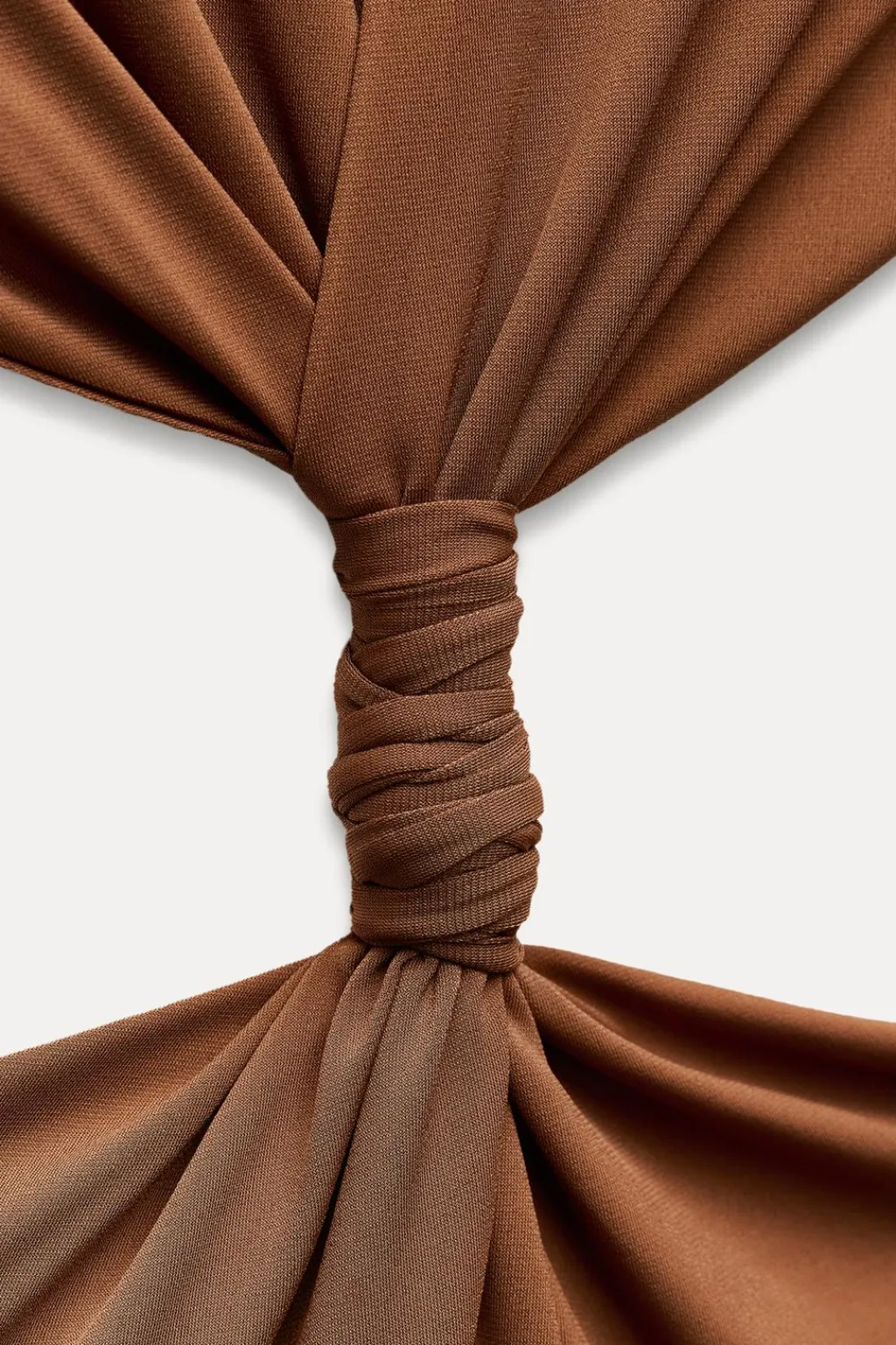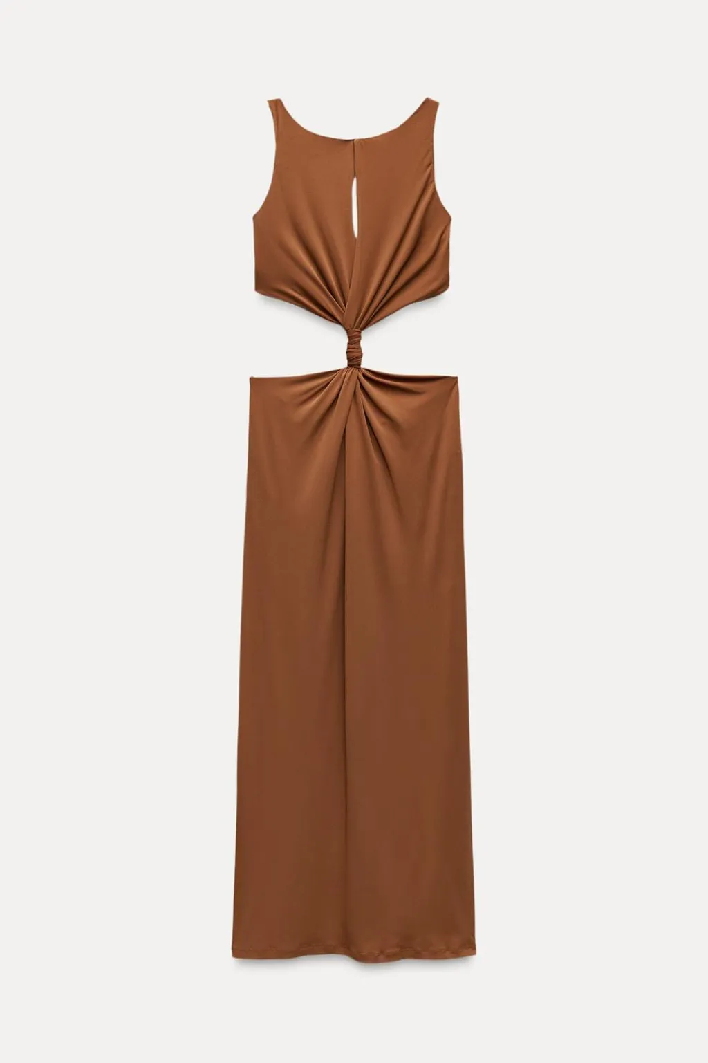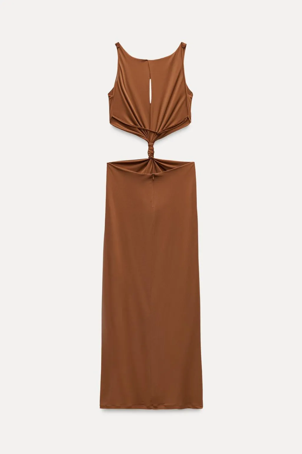 Vestido largo confeccionado en tejido tipo punto. Cuello redondo y tirantes finos. Abertura en cintura. Detalle de nudo en delantero y trabilla en espalda ajustable. Forro interior combinado. Cierre en espalda con cremallera oculta en costura.