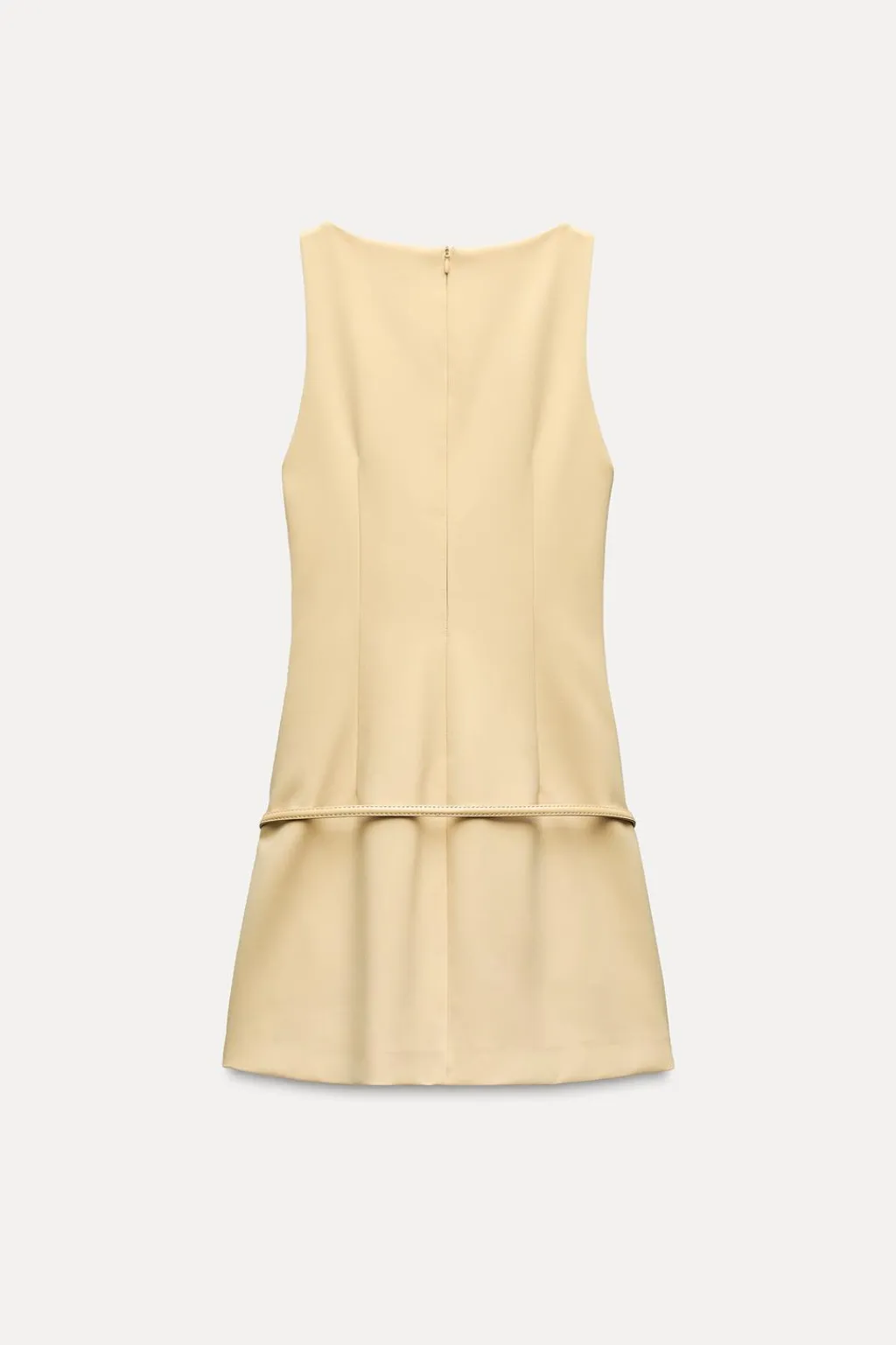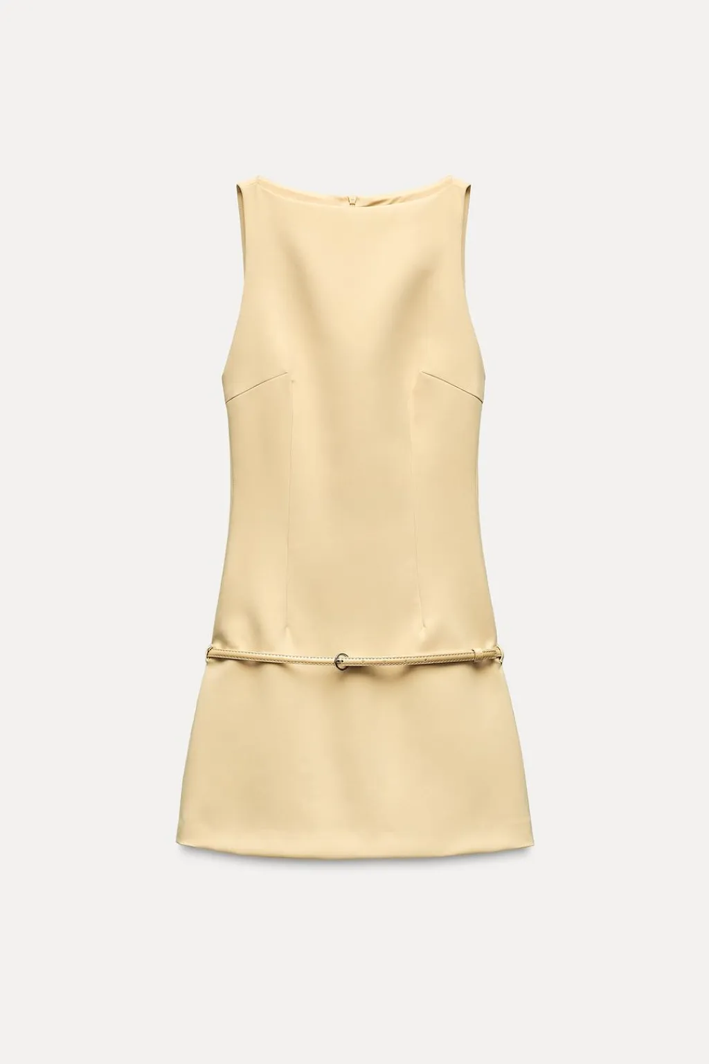 Vestido corto elástico. Cuello barco y manga sisa. Forro interior combinado a tono. Forro interior combinado a tono. Detalle de cinturón con hebilla metálica. Cierre en espalda con cremallera oculta en costura.