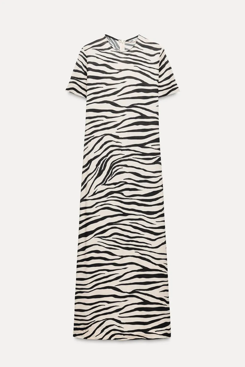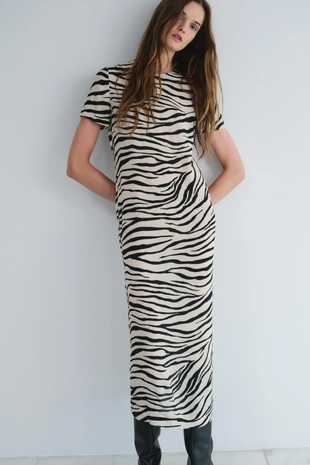 Vestid midi confeccionado en hilatura de viscosa 100%. Cuello redondo y manga corta. Bajo acabado en abertura lateral. Cierre en espalda con cremallera oculta en costura.