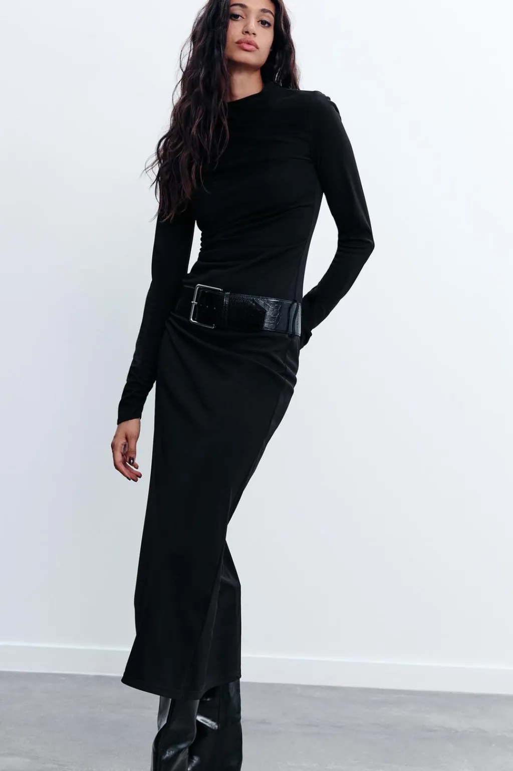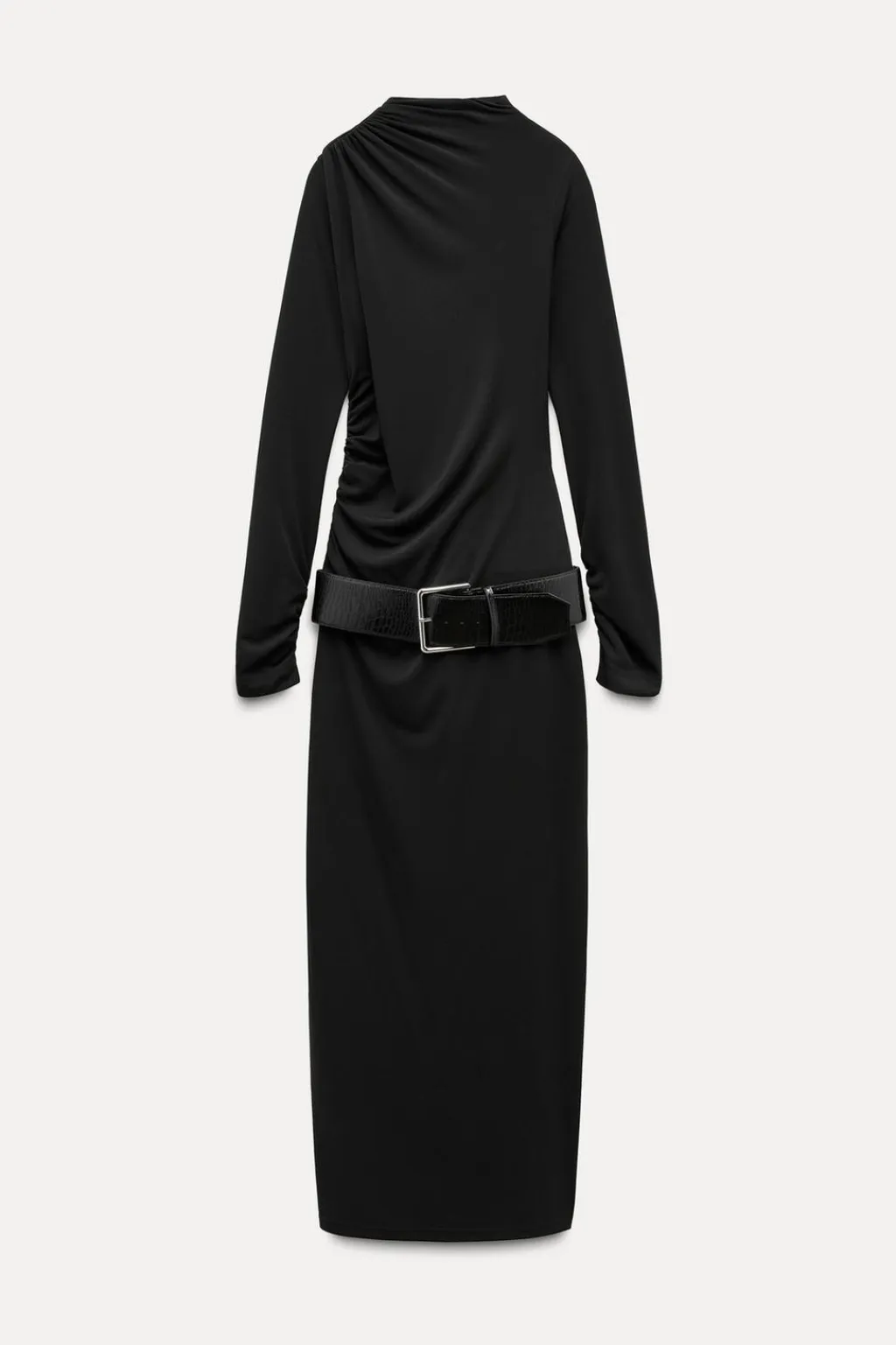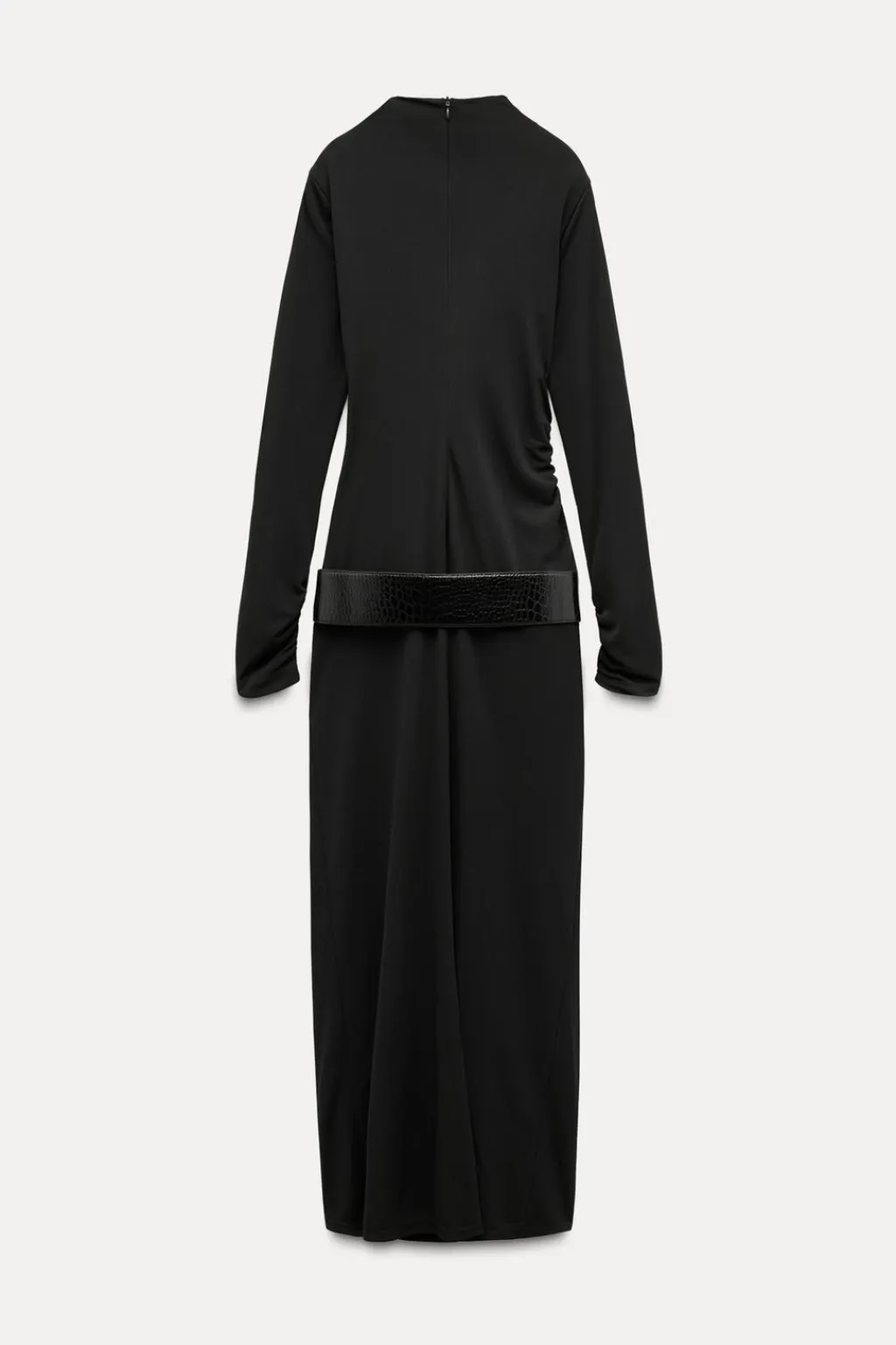 Vestido largo confeccionado en tejido tipo punto. Cuello subido y manga larga. Detalle de frunces. Cinturón ancho con hebilla metálica. Cierre en espalda con cremallera oculta en costura.