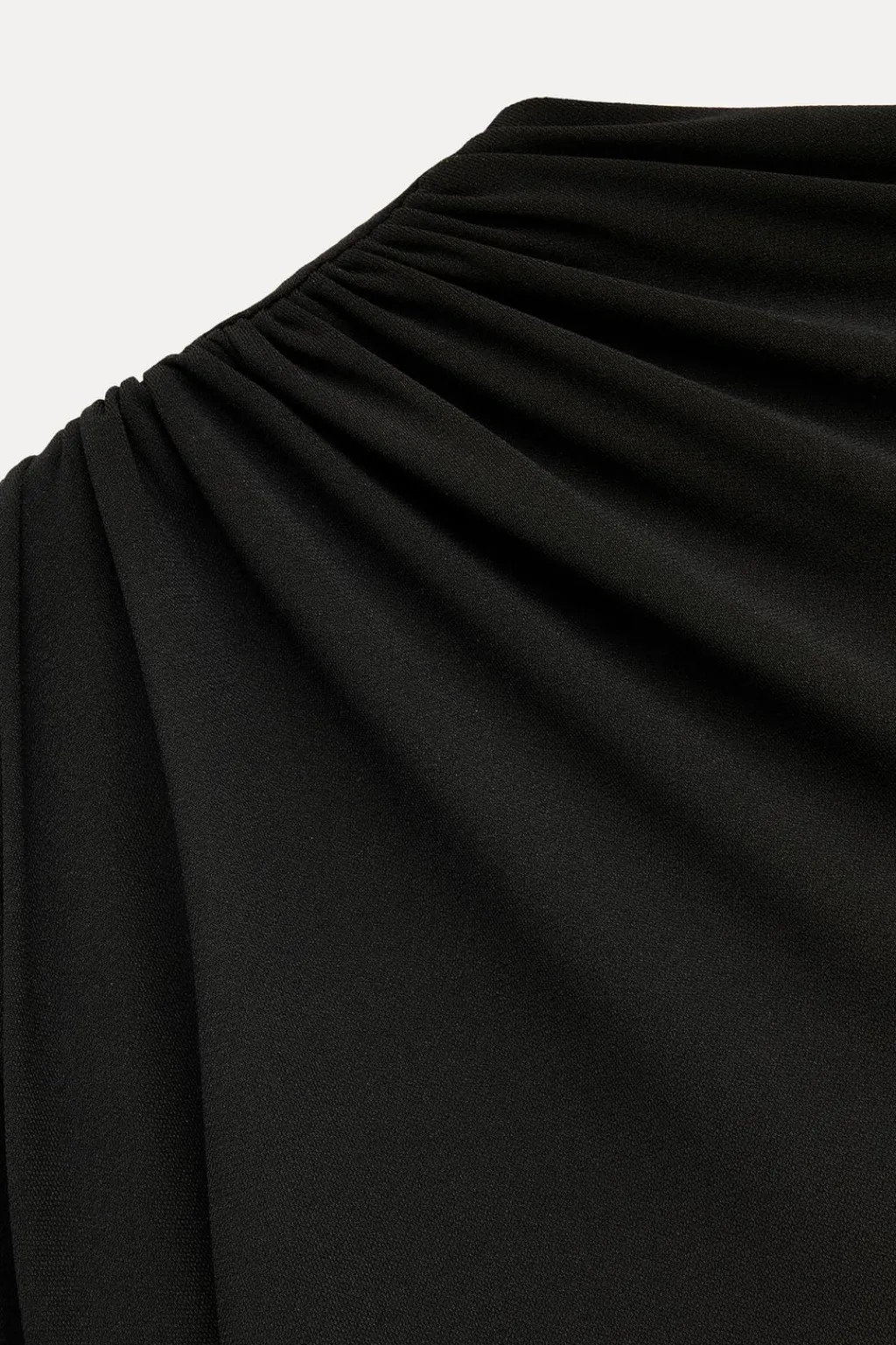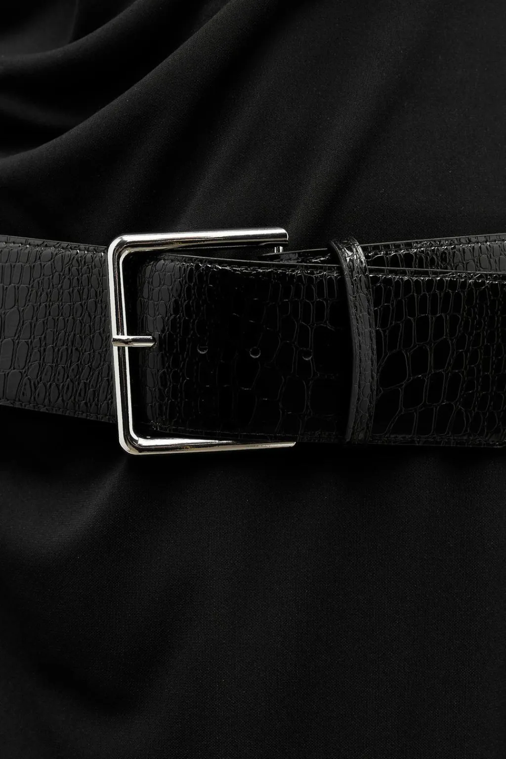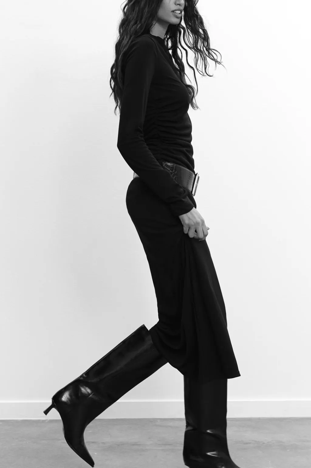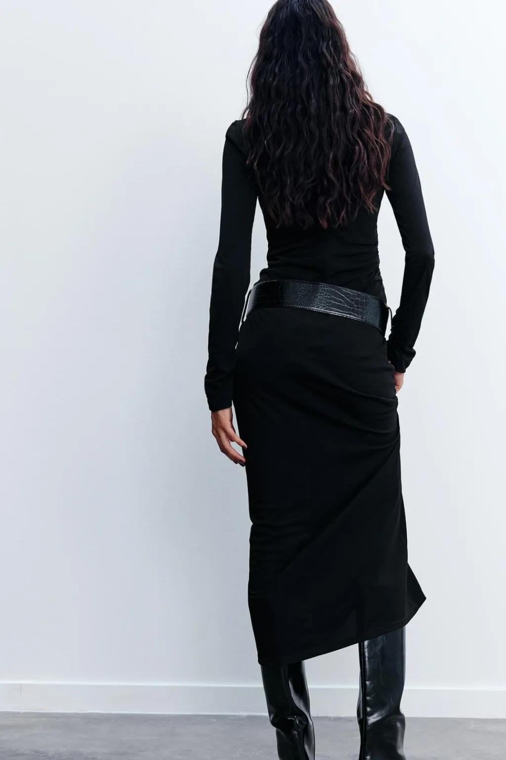 Vestido largo confeccionado en tejido tipo punto. Cuello subido y manga larga. Detalle de frunces. Cinturón ancho con hebilla metálica. Cierre en espalda con cremallera oculta en costura.