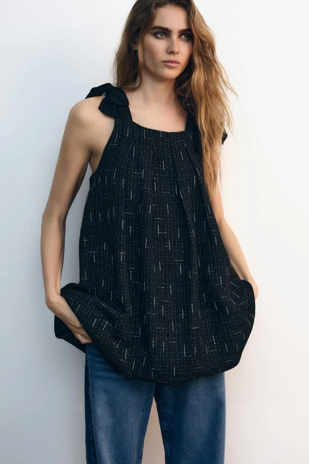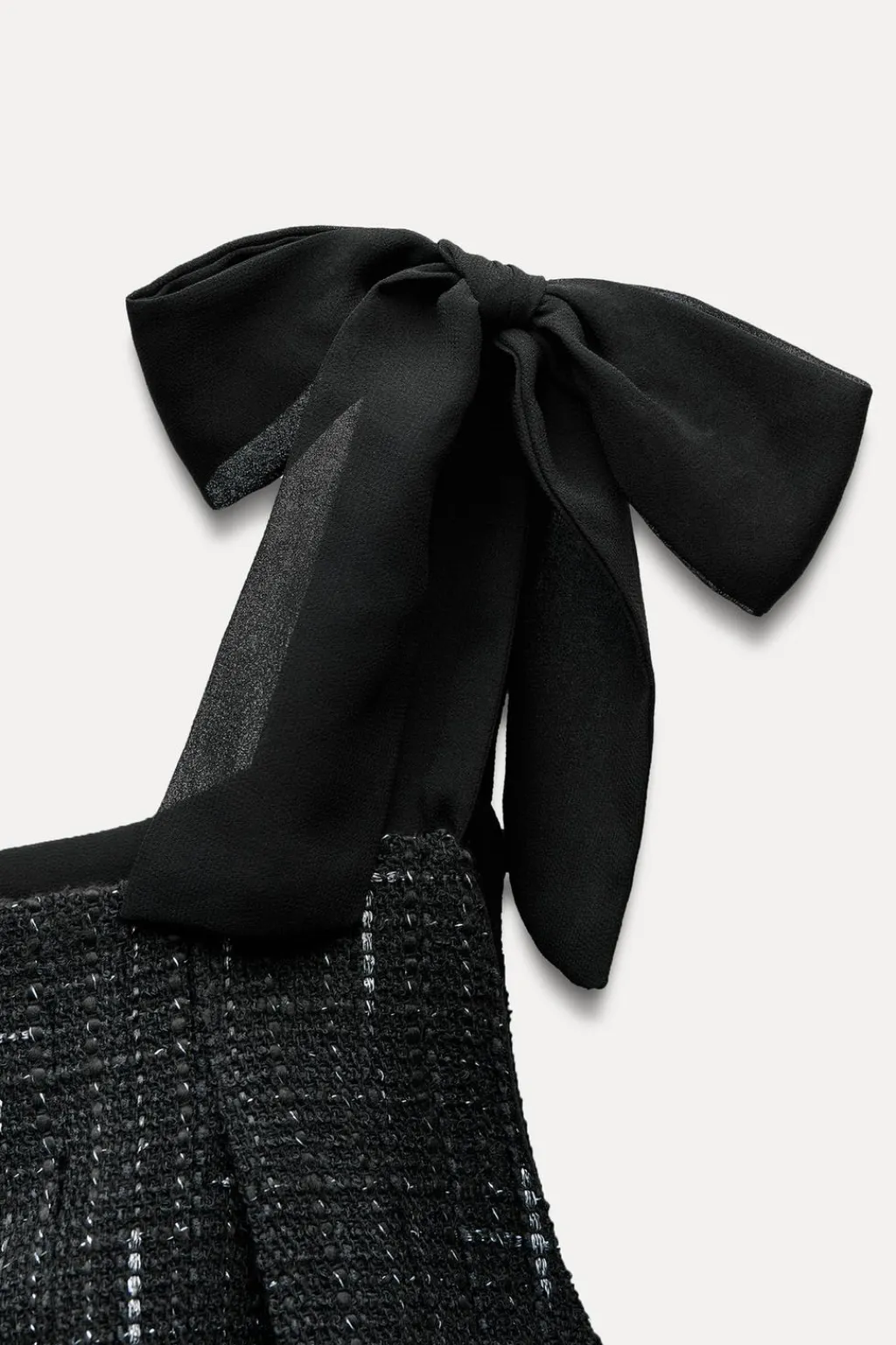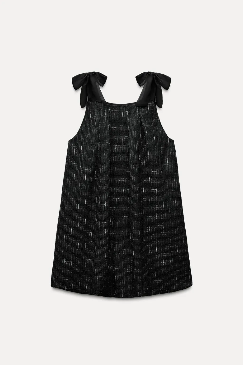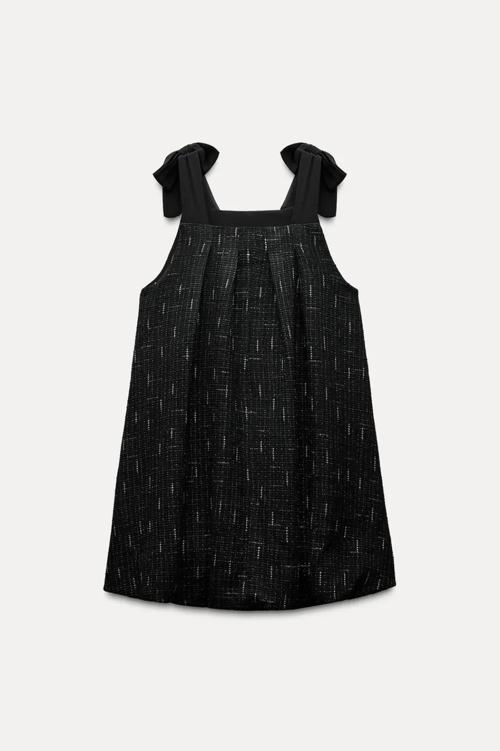Vestido de escote recto y tirantes anchos con lazos. Bajo abullonado acabado con elástico interior.