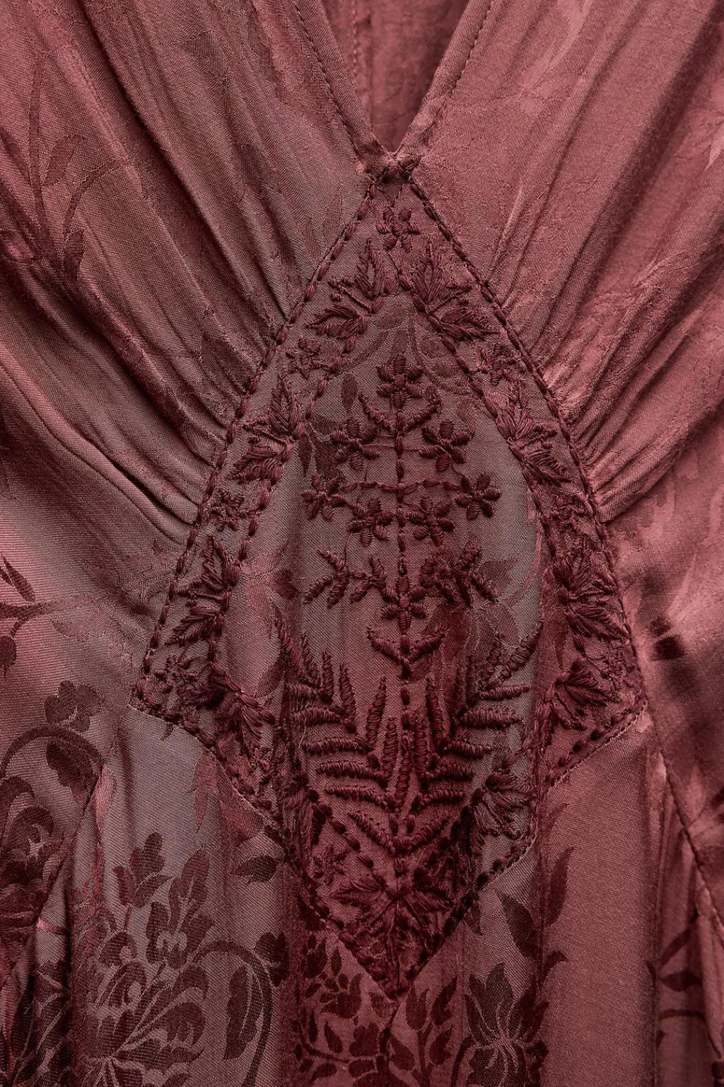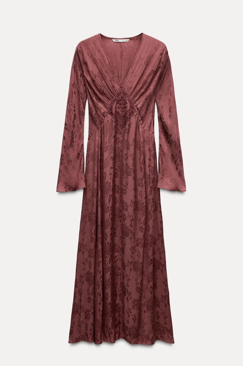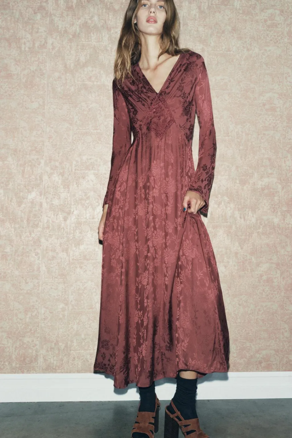 Vestido midi confeccionado en hilatura de viscosa. Escote pico y manga larga acabada en línea evasé. Detalle de bordado en delantero y tejido con jacquard floral. Bajo acabado en línea evasé.