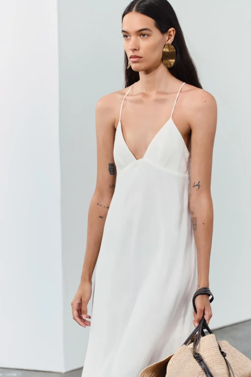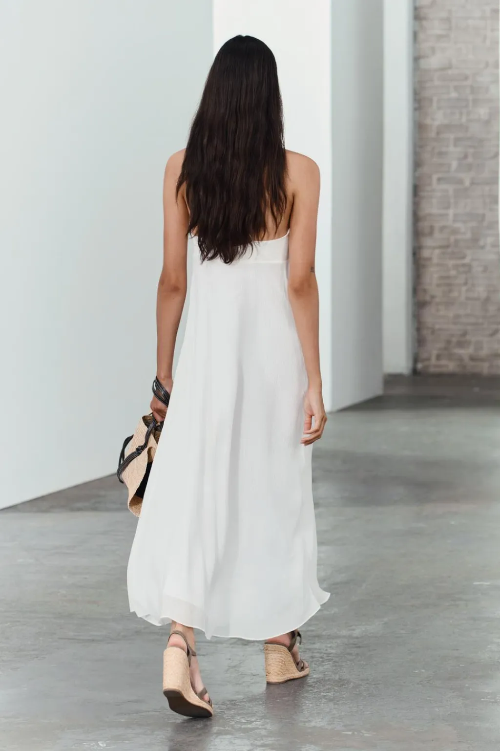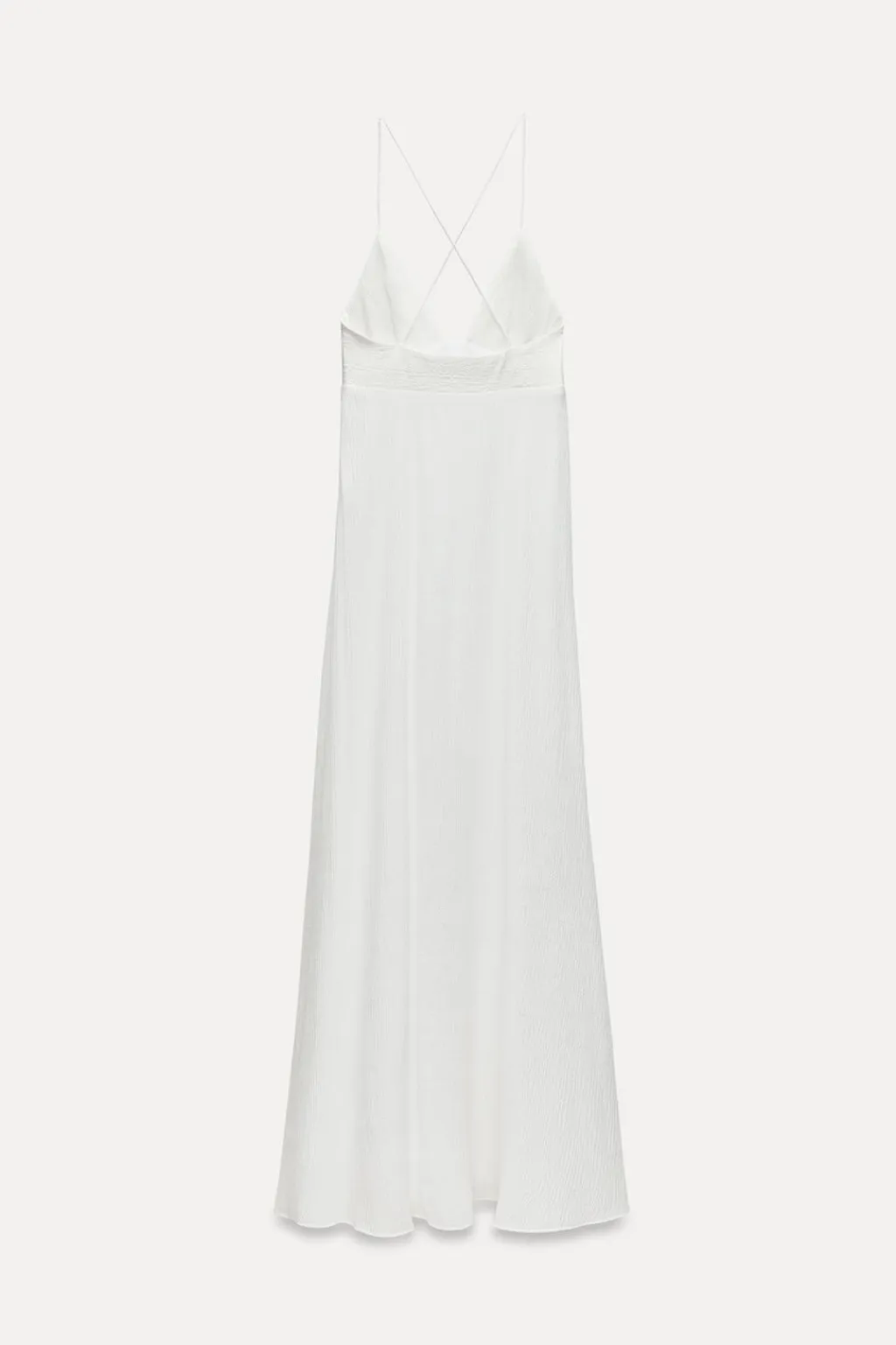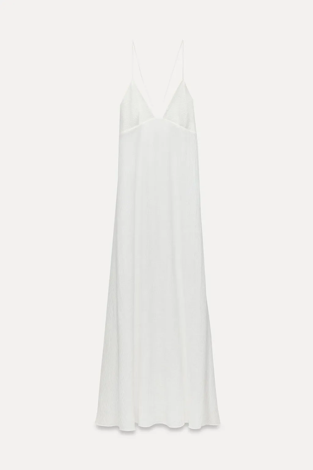 Vestido largo confeccionado en hilatura con mezcla de viscosa. Escote pico y tirantes finos cruzados en espalda. Detalle de tejido con estructura. Forro interior a tono. Cierre lateral con cremallera oculta en costura.
